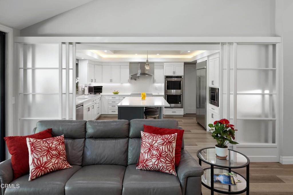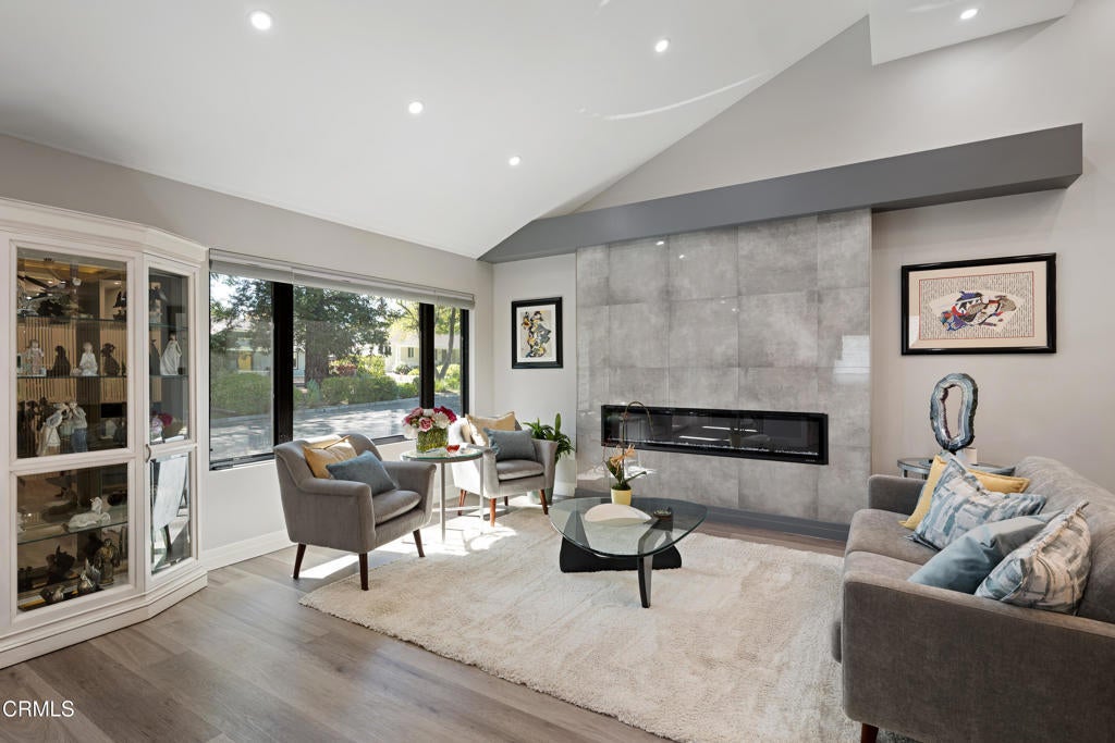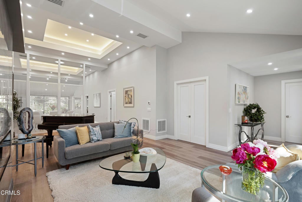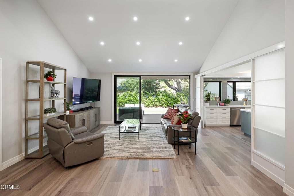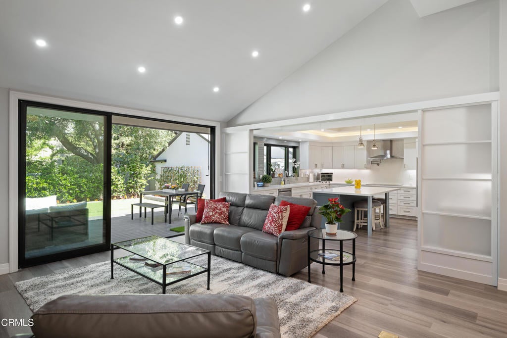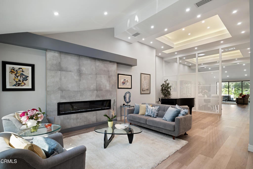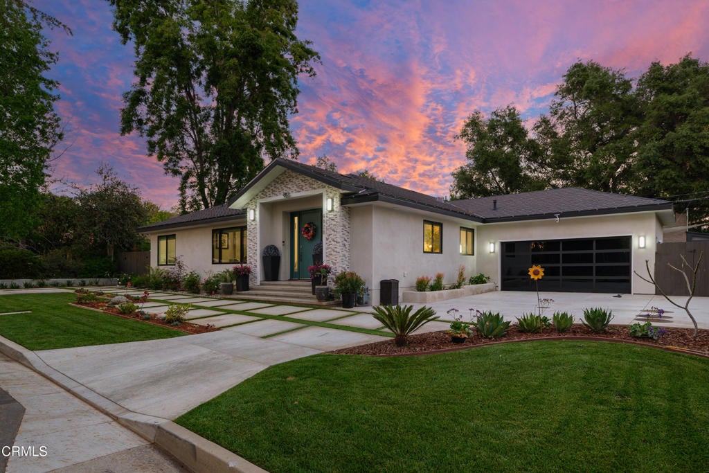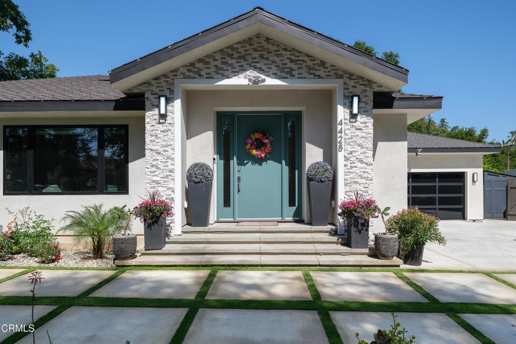 Enter into contemporary luxury in this spectacular, fully reimagined residence. Situated on a beautifully landscaped lot, this architectural masterpiece offers seamless indoor-outdoor living, exquisite custom finishes & a detached 1-bedroom guest house. Upon arrival, striking curb appeal hints at the sophistication within. Through the front entry, wide plank wood-like flooring flows throughout, complemented by soaring vaulted ceilings, custom multilayer tray ceilings & recessed lighting. The formal living room is anchored by a sleek, custom-tiled electric fireplace & framed by a large picture window that floods the space with natural light. A stylish partition separates the living & dining areas, enhancing the flow without sacrificing definition. An office with recessed lighting is tucked just off the main living area. The open family room features triple-panel sliding glass doors that open fully to the deck & backyard, creating a true indoor-outdoor experience. The kitchen is a chef's dream with an oversized island, quartz countertops, soft-close cabinetry, custom subway tile backsplash & a full suite of stainless steel appliances. A large walk-in pantry & a designer half bath complete the kitchen area. A full laundry room with utility sink leads to the finished 2-car garage with attic storage & pass-through access to the backyard. An additional flex room near the garage is perfect for a 2nd office or gym. The private quarters include 4 spacious bedrooms & 3 bathrooms. The primary suite is a retreat, accessed through French doors & featuring vaulted ceilings & dual walk-in closets. The spa-inspired ensuite bathroom offers dual vanities, a jetted soaking tub, & a custom walk-in shower. Additional bedrooms each feature recessed lighting & mirrored closets, while the secondary bathrooms showcase high-end tile work & quartz vanities. Completing the estate is a beautifully appointed 1-bedroom, 1-bath ADU. Featuring its own private entrance, this guest house offers wide plank wood-like flooring, recessed lighting, crown molding, a dining nook & a full kitchen with quartz countertops & a 4-burner gas range. The bathroom includes a walk-in shower with bench seating. Also here, hookups for a stackable washer & dryer. Outdoor amenities include multiple seating & entertaining areas, a putting green shaded by sail shades & a backyard designed for relaxation & fun. This turnkey residence delivers impeccable design & unparalleled comfort in every square foot.
