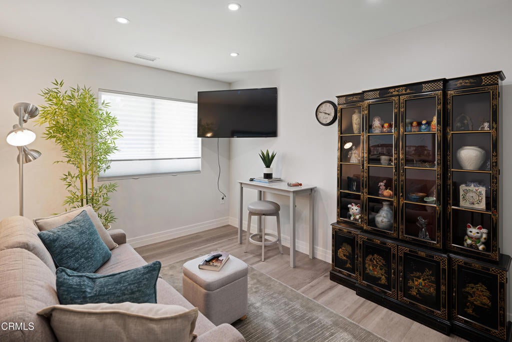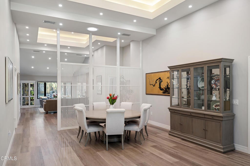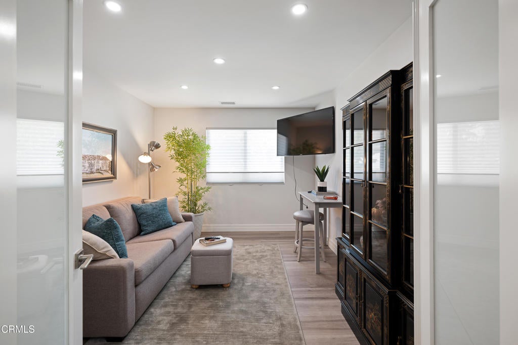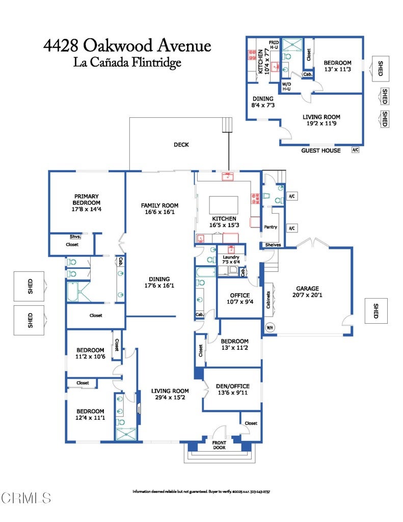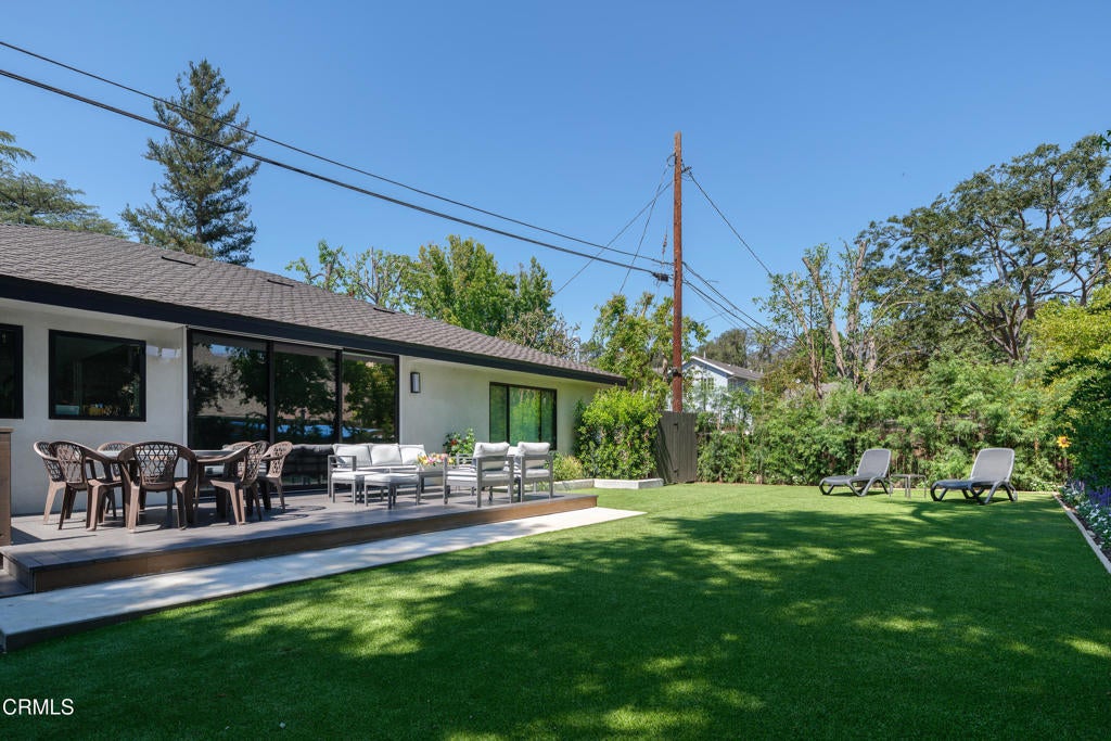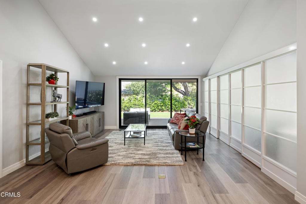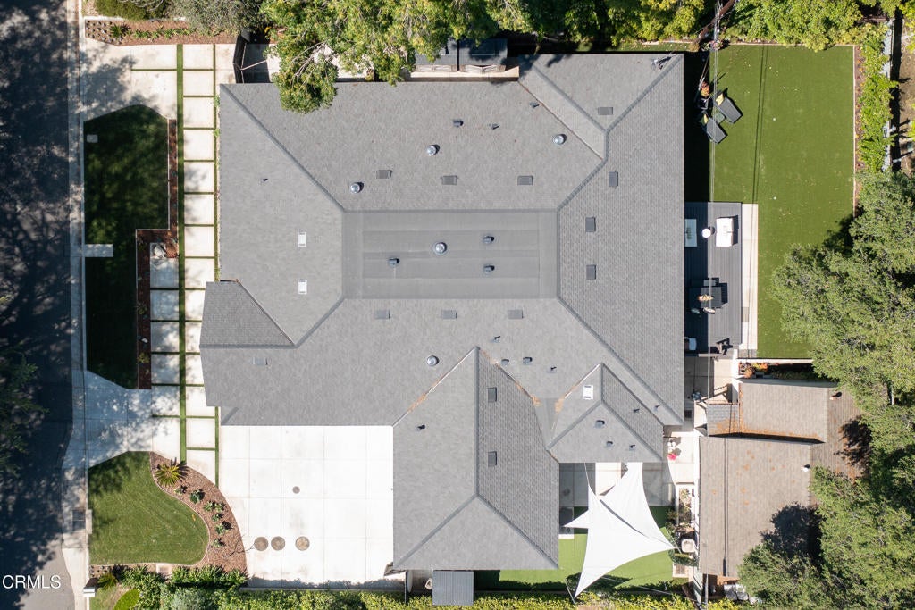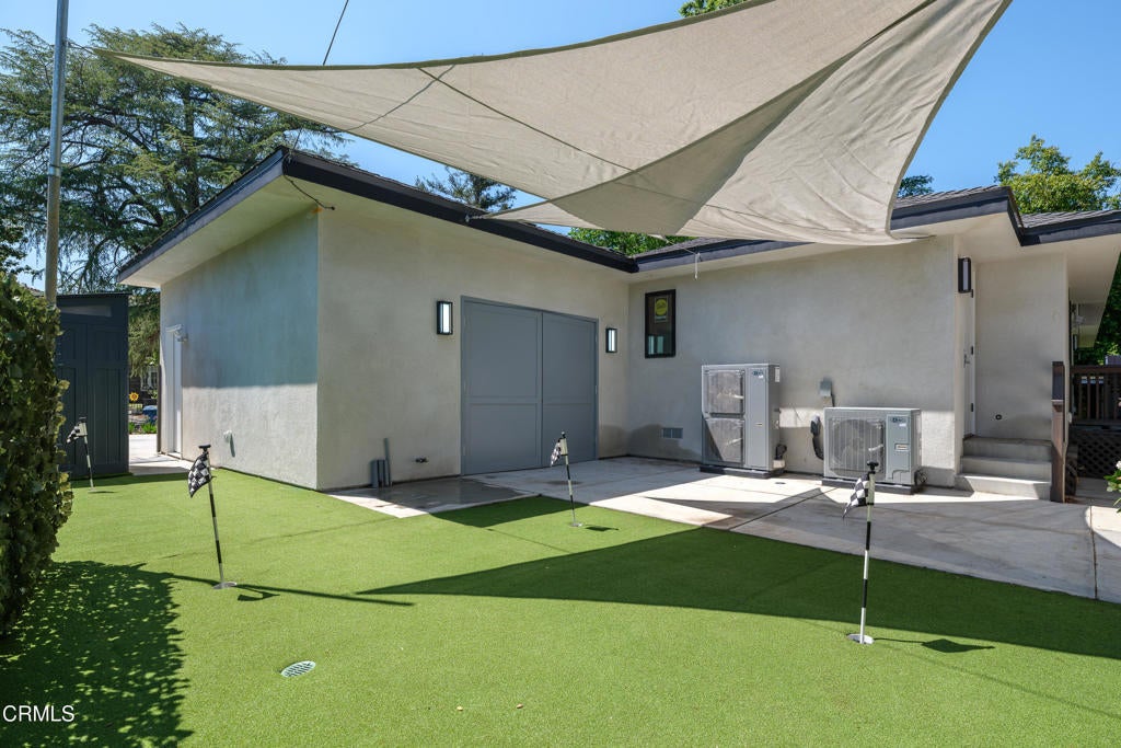 Enter into contemporary luxury in this spectacular, fully reimagined residence. Situated on a beautifully landscaped lot, this architectural masterpiece offers seamless indoor-outdoor living, exquisite custom finishes & a detached 1-bedroom guest house. Upon arrival, striking curb appeal hints at the sophistication within. Through the front entry, wide plank wood-like flooring flows throughout, complemented by soaring vaulted ceilings, custom multilayer tray ceilings & recessed lighting. The formal living room is anchored by a sleek, custom-tiled electric fireplace & framed by a large picture window that floods the space with natural light. A stylish partition separates the living & dining areas, enhancing the flow without sacrificing definition. An office with recessed lighting is tucked just off the main living area. The open family room features triple-panel sliding glass doors that open fully to the deck & backyard, creating a true indoor-outdoor experience. The kitchen is a chef's dream with an oversized island, quartz countertops, soft-close cabinetry, custom subway tile backsplash & a full suite of stainless steel appliances. A large walk-in pantry & a designer half bath complete the kitchen area. A full laundry room with utility sink leads to the finished 2-car garage with attic storage & pass-through access to the backyard. An additional flex room near the garage is perfect for a 2nd office or gym. The private quarters include 4 spacious bedrooms & 3 bathrooms. The primary suite is a retreat, accessed through French doors & featuring vaulted ceilings & dual walk-in closets. The spa-inspired ensuite bathroom offers dual vanities, a jetted soaking tub, & a custom walk-in shower. Additional bedrooms each feature recessed lighting & mirrored closets, while the secondary bathrooms showcase high-end tile work & quartz vanities. Completing the estate is a beautifully appointed 1-bedroom, 1-bath ADU. Featuring its own private entrance, this guest house offers wide plank wood-like flooring, recessed lighting, crown molding, a dining nook & a full kitchen with quartz countertops & a 4-burner gas range. The bathroom includes a walk-in shower with bench seating. Also here, hookups for a stackable washer & dryer. Outdoor amenities include multiple seating & entertaining areas, a putting green shaded by sail shades & a backyard designed for relaxation & fun. This turnkey residence delivers impeccable design & unparalleled comfort in every square foot.