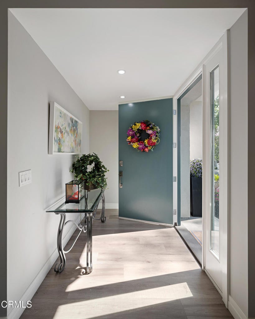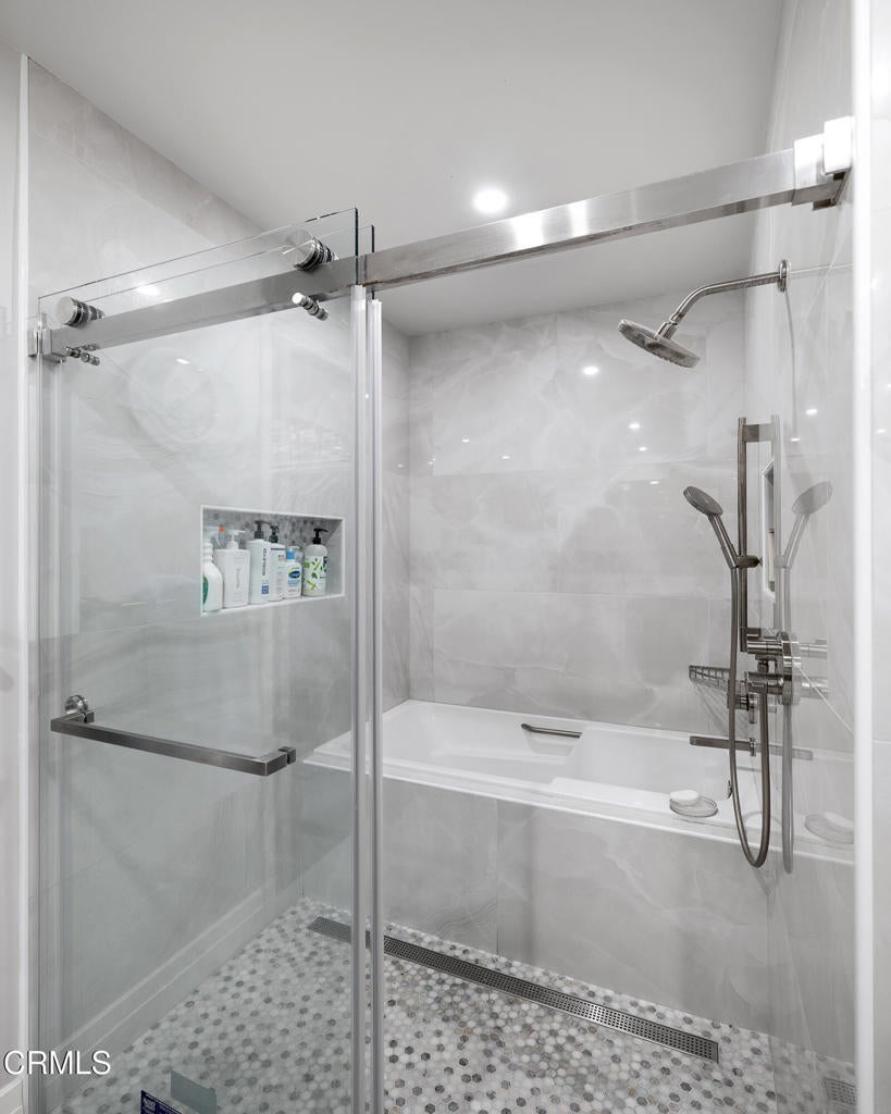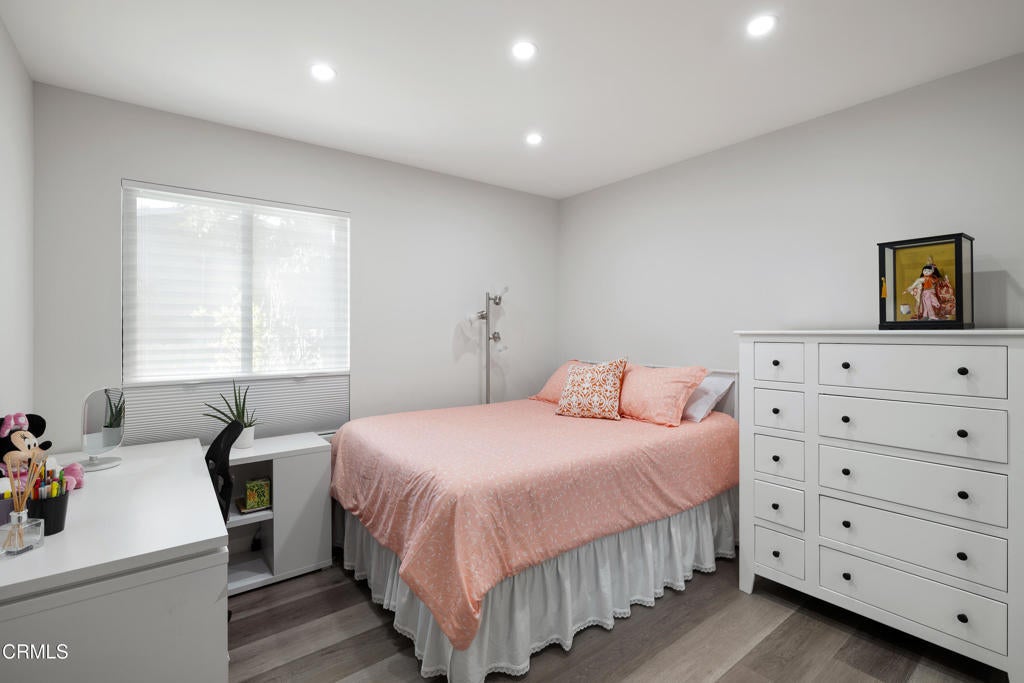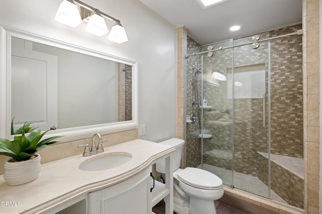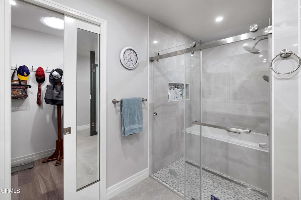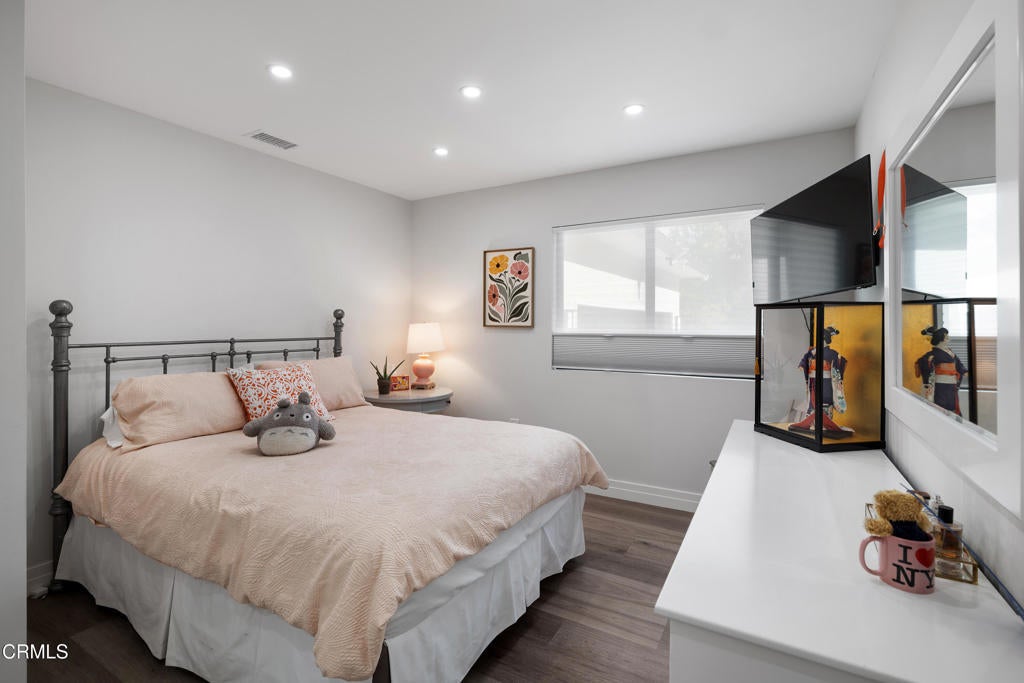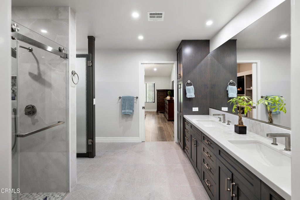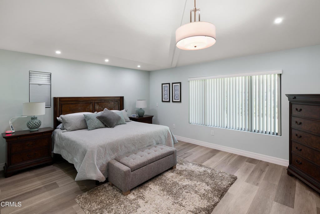 Enter into contemporary luxury in this spectacular, fully reimagined residence. Situated on a beautifully landscaped lot, this architectural masterpiece offers seamless indoor-outdoor living, exquisite custom finishes & a detached 1-bedroom guest house. Upon arrival, striking curb appeal hints at the sophistication within. Through the front entry, wide plank wood-like flooring flows throughout, complemented by soaring vaulted ceilings, custom multilayer tray ceilings & recessed lighting. The formal living room is anchored by a sleek, custom-tiled electric fireplace & framed by a large picture window that floods the space with natural light. A stylish partition separates the living & dining areas, enhancing the flow without sacrificing definition. An office with recessed lighting is tucked just off the main living area. The open family room features triple-panel sliding glass doors that open fully to the deck & backyard, creating a true indoor-outdoor experience. The kitchen is a chef's dream with an oversized island, quartz countertops, soft-close cabinetry, custom subway tile backsplash & a full suite of stainless steel appliances. A large walk-in pantry & a designer half bath complete the kitchen area. A full laundry room with utility sink leads to the finished 2-car garage with attic storage & pass-through access to the backyard. An additional flex room near the garage is perfect for a 2nd office or gym. The private quarters include 4 spacious bedrooms & 3 bathrooms. The primary suite is a retreat, accessed through French doors & featuring vaulted ceilings & dual walk-in closets. The spa-inspired ensuite bathroom offers dual vanities, a jetted soaking tub, & a custom walk-in shower. Additional bedrooms each feature recessed lighting & mirrored closets, while the secondary bathrooms showcase high-end tile work & quartz vanities. Completing the estate is a beautifully appointed 1-bedroom, 1-bath ADU. Featuring its own private entrance, this guest house offers wide plank wood-like flooring, recessed lighting, crown molding, a dining nook & a full kitchen with quartz countertops & a 4-burner gas range. The bathroom includes a walk-in shower with bench seating. Also here, hookups for a stackable washer & dryer. Outdoor amenities include multiple seating & entertaining areas, a putting green shaded by sail shades & a backyard designed for relaxation & fun. This turnkey residence delivers impeccable design & unparalleled comfort in every square foot.