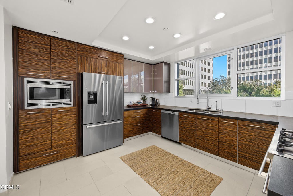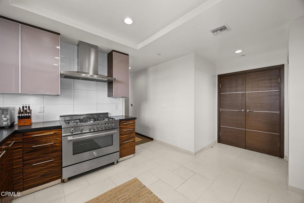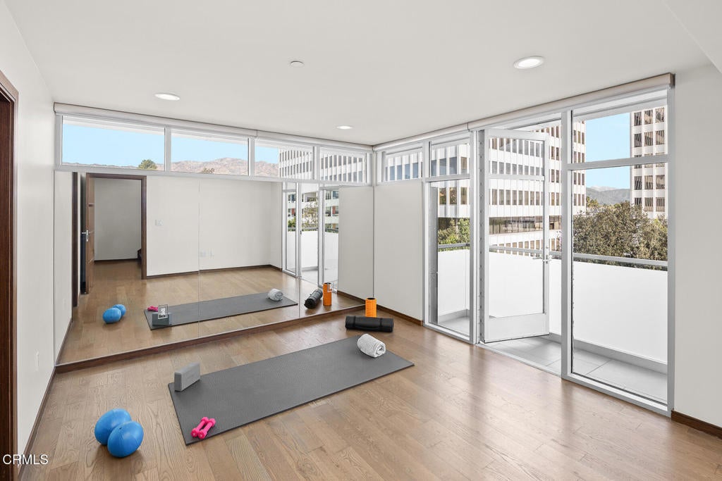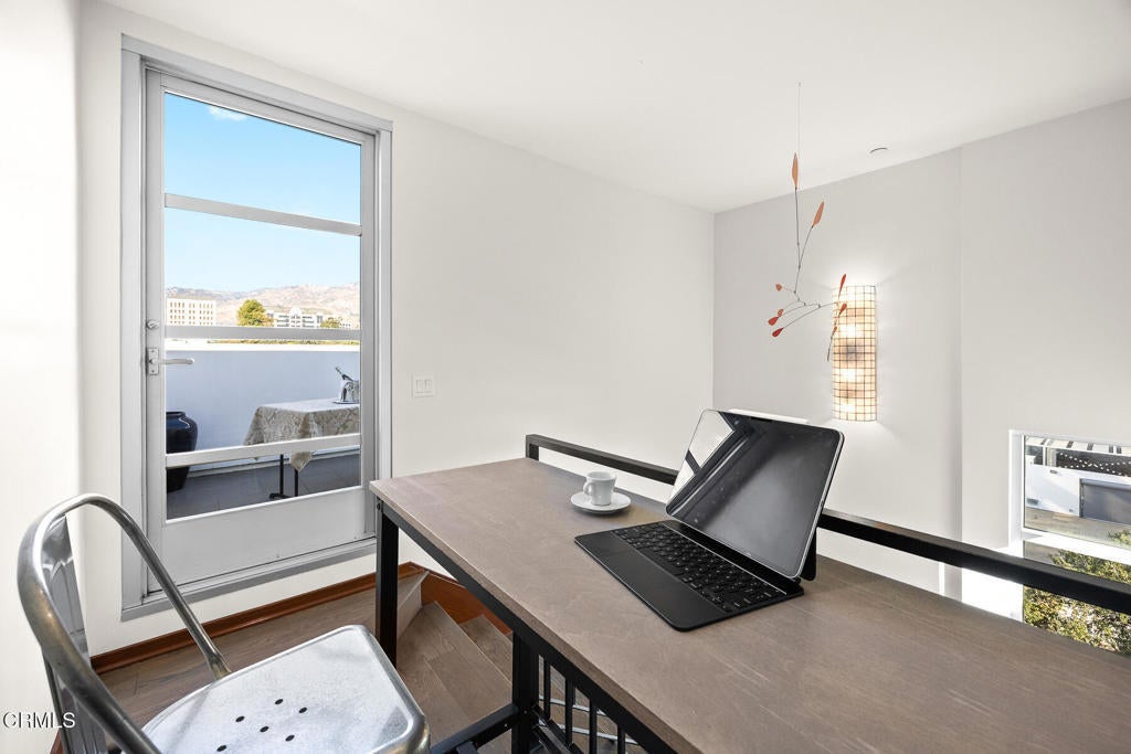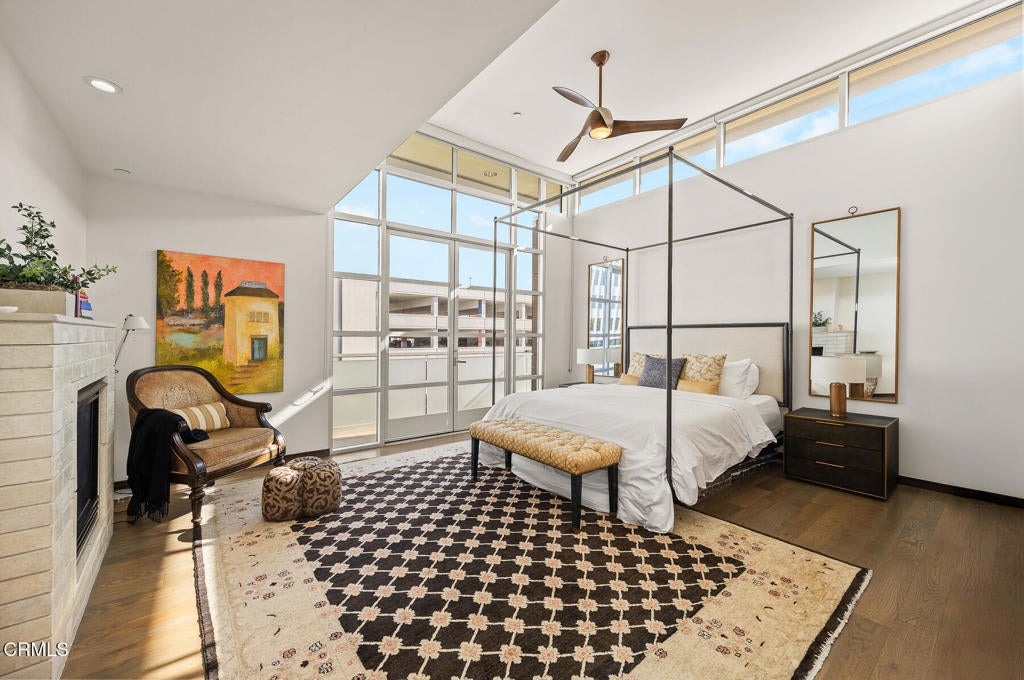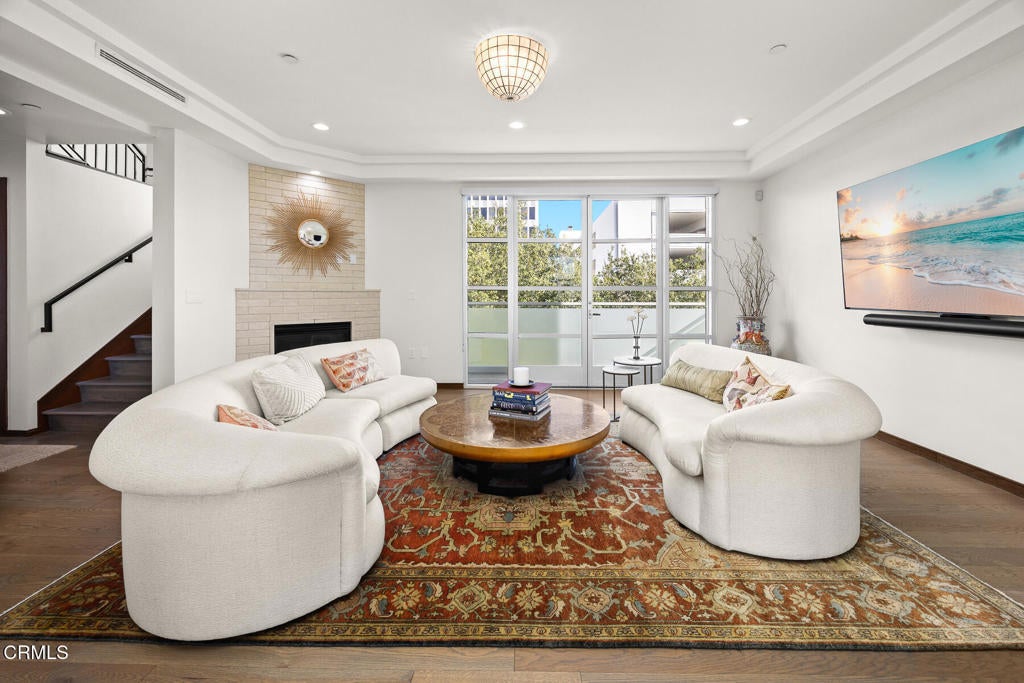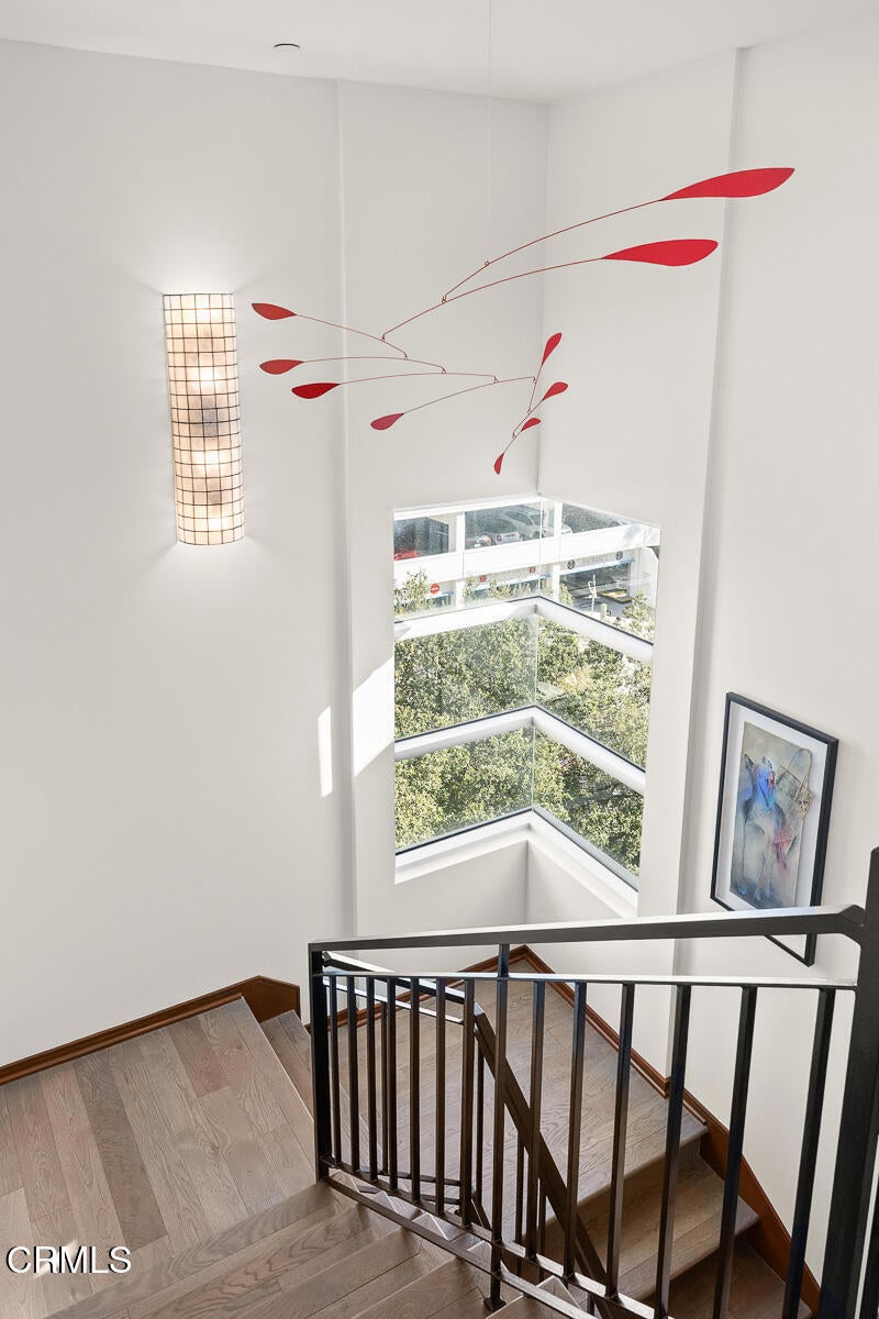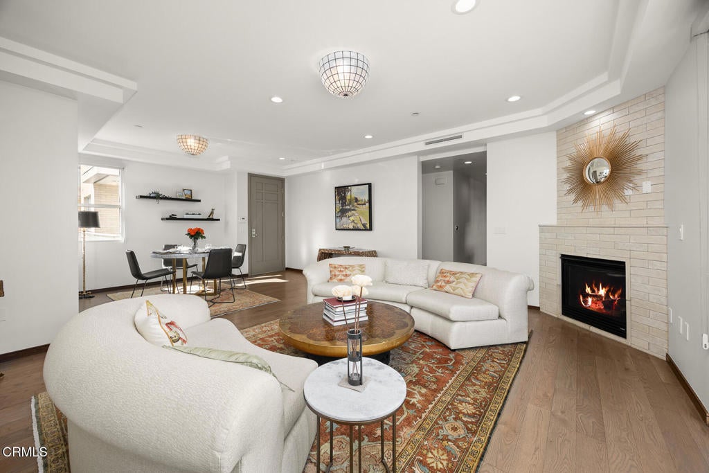 Inspired by Bauhaus architecture, Hudson Terrace is a modern luxury penthouse built in 2009 in Pasadena's vibrant South Lake Avenue District. Ideally positioned across from the Pasarroyo Business Complex and 1 block from dining, shopping, and fitness--including Trader Joe's, Erewhon, Macy's, and LA Fitness--this front-facing penthouse offers exceptional urban convenience in one of the city's most desirable neighborhoods. The exterior features a Trespa Meteon rain shield system, ivory brick and stucco detailing, sandblasted glass balcony railings, and expansive floor-to-ceiling windows that fill the home with natural light. This residence provides a loft-like living experience with a dramatic living room showcasing resurfaced hardwood floors, a precast stone corner fireplace, French Deco capiz shell sconces, custom Hunter Douglas roller blinds, and floor-to-ceiling dual-paned glass doors opening to a balcony overlooking oak-lined Hudson Ave. Updated electrical circuitry and Lutron Caseta dimmer-controlled recessed lighting enhance the modern ambiance. An elegant guest bath with marble counters and intricate tilework completes the main level. The gourmet kitchen features sleek Italian-designed cabinetry, honed black granite countertops, a Bertazzoni gas range and hood, Bosch stainless steel appliances, filtered water at both sink & refrigerator, a walk-in storage room, utility closet, and a dedicated balcony with stainless FireCraft smoker grill. The primary suite offers vaulted ceilings, remote-controlled roller shades, a craftsman wood ceiling fan, a gas fireplace, and a custom Dall'Agnese walk-in closet. The spa bath includes a 6 jet soaking tub, floor-to-ceiling glass shower, double Duravit sinks with Kohler polished nickel fixtures, and imported stone. A second bedroom with a mirrored wall functions as a guest room, gym, or office, with an adjacent bath featuring a spacious travertine and mosaic steam shower. A private rooftop terrace crowns the penthouse, offering sweeping city & mountain views. Additional highlights include 4 balconies, 2 side-by-side parking spaces near the elevator and storage room. Upgrades: Nest climate control, Lutron Caseta lighting, Hunter Douglas blinds, Restoration Hardware lighting, Bosch refrigerator, LG ThinQ washer/dryer. This pristine residence is moments from Pasadena's iconic: Caltech, ArtCenter, Langham, Huntington Library, Norton Simon, Old Town, Playhouse & Rose Bowl.
