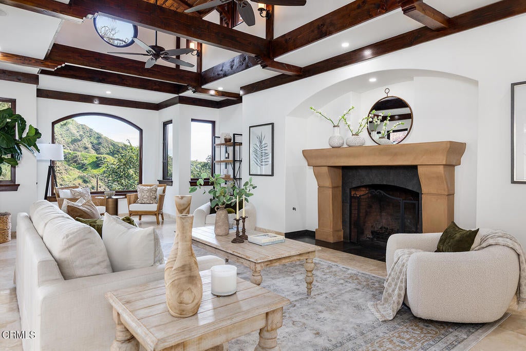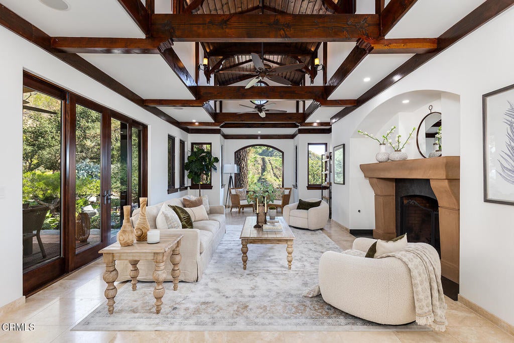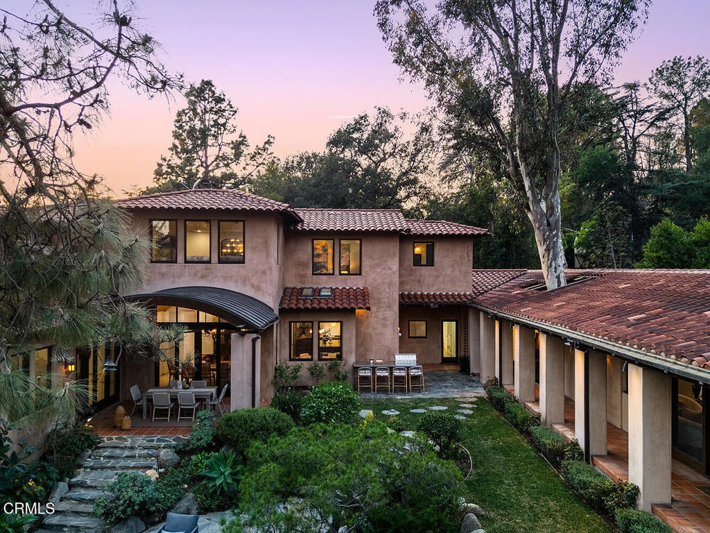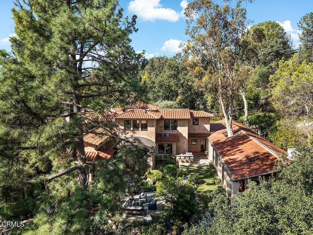 Nestled in the foothills of Altadena, this gated California Mediterranean Estate is a masterwork of architectural design and premium craftsmanship. Set on an expansive, private lot, the property was built in 2009 and offers a seamless connection to nature with dramatic panoramas spanning mountains, treetops, and lush green surroundings. The residence is defined by exceptional finishes, including recurring arches, open wood-beamed and trussed ceilings, and custom wrought-iron work. The dramatic two story entry with grand staircase and wood paneled ceiling is adjacent to the wood-paneled library with fireplace. The formal living room boasts travertine floors, rich wood beams, stone fireplace mantle, picturesque windows and sliding doors to the covered patio. The formal dining room features seamless hand-plastered barrel ceilings and sliding glass doors. The heart of the home is the gourmet kitchen with a large island and breakfast nook that flows effortlessly to outdoor verandas and a built-in barbecue. Steps down to a comfortable family room with travertine floors and two sets of sliding doors accessing the backyard and side yard to a basketball court. The main residence features five bedroom suites, highlighted by a secluded primary retreat occupying its own level to maximize the breathtaking views, balcony, fireplace and sitting room. The upper level consists of a dedicated secondary wing featuring its own den. There are two laundry rooms on each level for maximum convenience. Designed for grand-scale entertaining, the grounds feature covered verandas, lush landscaping, and a vast lower-level yard for all recreational events. A full guest house provides a private sanctuary for visitors, complete with vaulted wood ceilings, a fireplace, a kitchenette, and a full bath. Two separate garages offer ample storage to complete this unparalleled canyon-side estate.