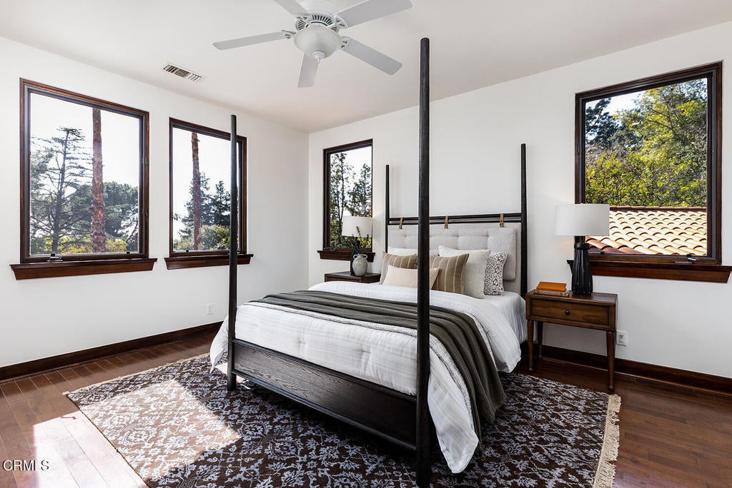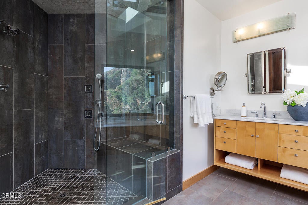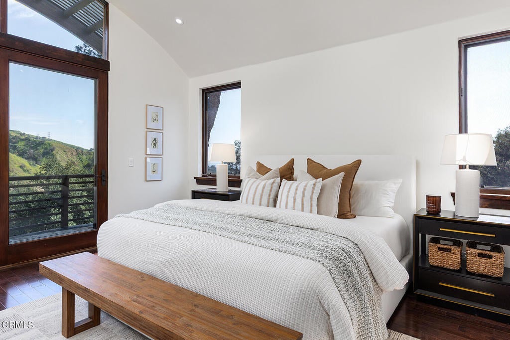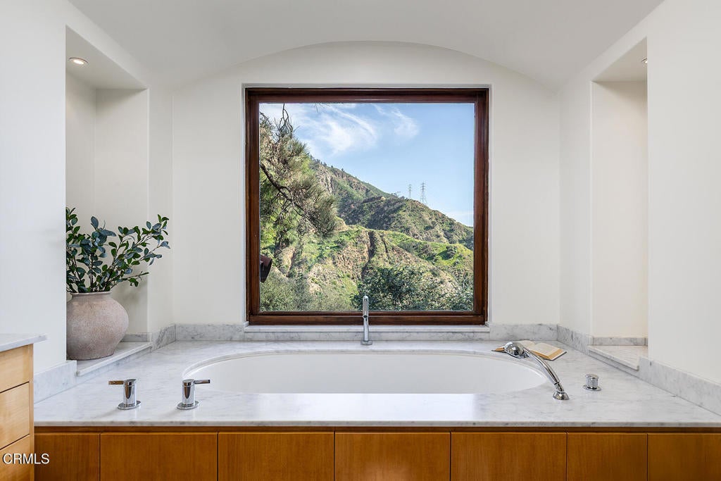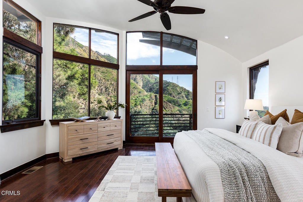 Nestled in the foothills of Altadena, this gated California Mediterranean Estate is a masterwork of architectural design and premium craftsmanship. Set on an expansive, private lot, the property was built in 2009 and offers a seamless connection to nature with dramatic panoramas spanning mountains, treetops, and lush green surroundings. The residence is defined by exceptional finishes, including recurring arches, open wood-beamed and trussed ceilings, and custom wrought-iron work. The dramatic two story entry with grand staircase and wood paneled ceiling is adjacent to the wood-paneled library with fireplace. The formal living room boasts travertine floors, rich wood beams, stone fireplace mantle, picturesque windows and sliding doors to the covered patio. The formal dining room features seamless hand-plastered barrel ceilings and sliding glass doors. The heart of the home is the gourmet kitchen with a large island and breakfast nook that flows effortlessly to outdoor verandas and a built-in barbecue. Steps down to a comfortable family room with travertine floors and two sets of sliding doors accessing the backyard and side yard to a basketball court. The main residence features five bedroom suites, highlighted by a secluded primary retreat occupying its own level to maximize the breathtaking views, balcony, fireplace and sitting room. The upper level consists of a dedicated secondary wing featuring its own den. There are two laundry rooms on each level for maximum convenience. Designed for grand-scale entertaining, the grounds feature covered verandas, lush landscaping, and a vast lower-level yard for all recreational events. A full guest house provides a private sanctuary for visitors, complete with vaulted wood ceilings, a fireplace, a kitchenette, and a full bath. Two separate garages offer ample storage to complete this unparalleled canyon-side estate.