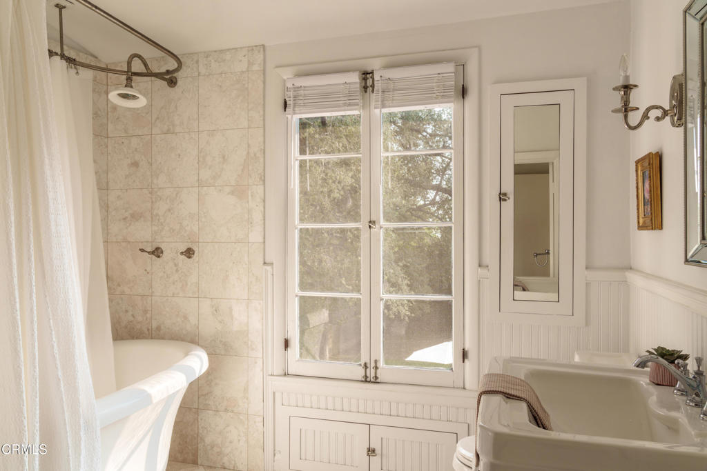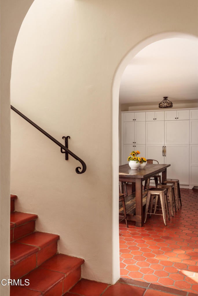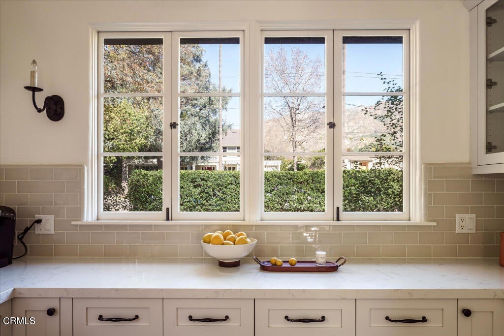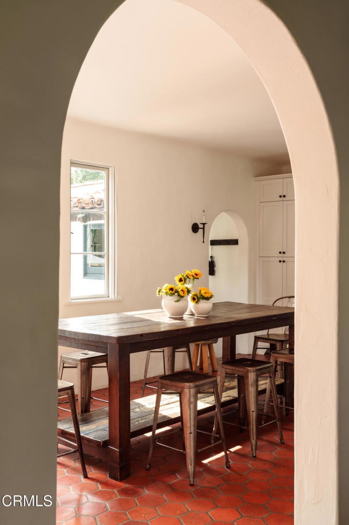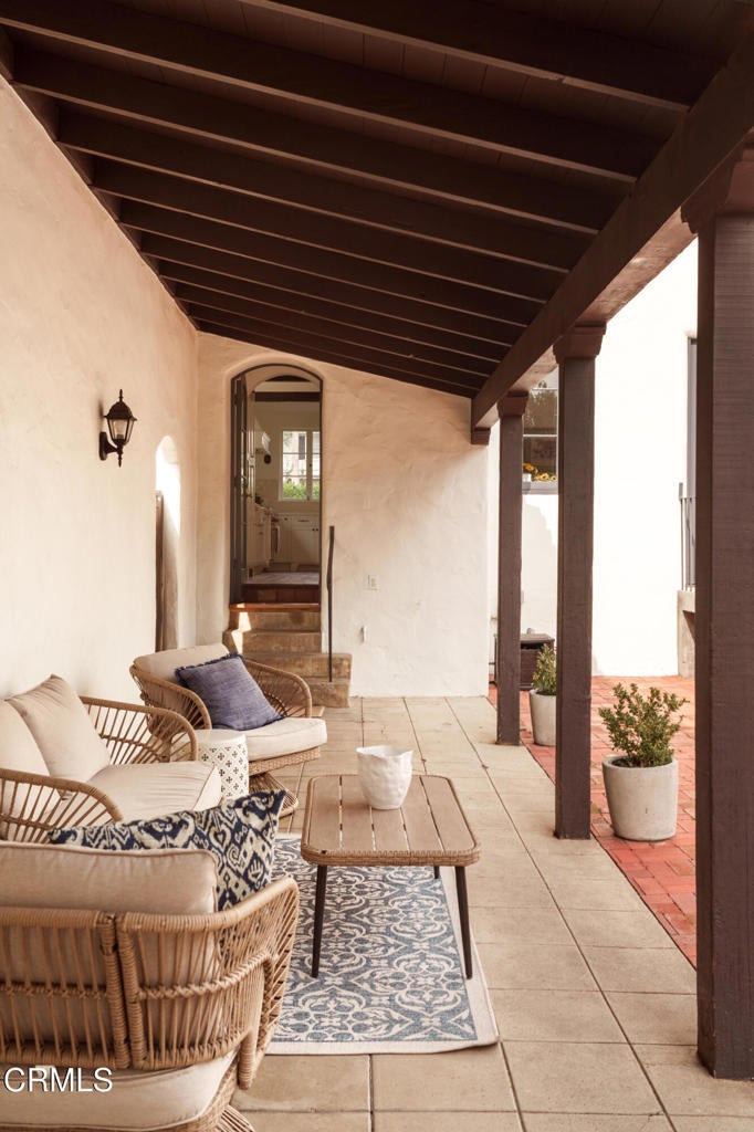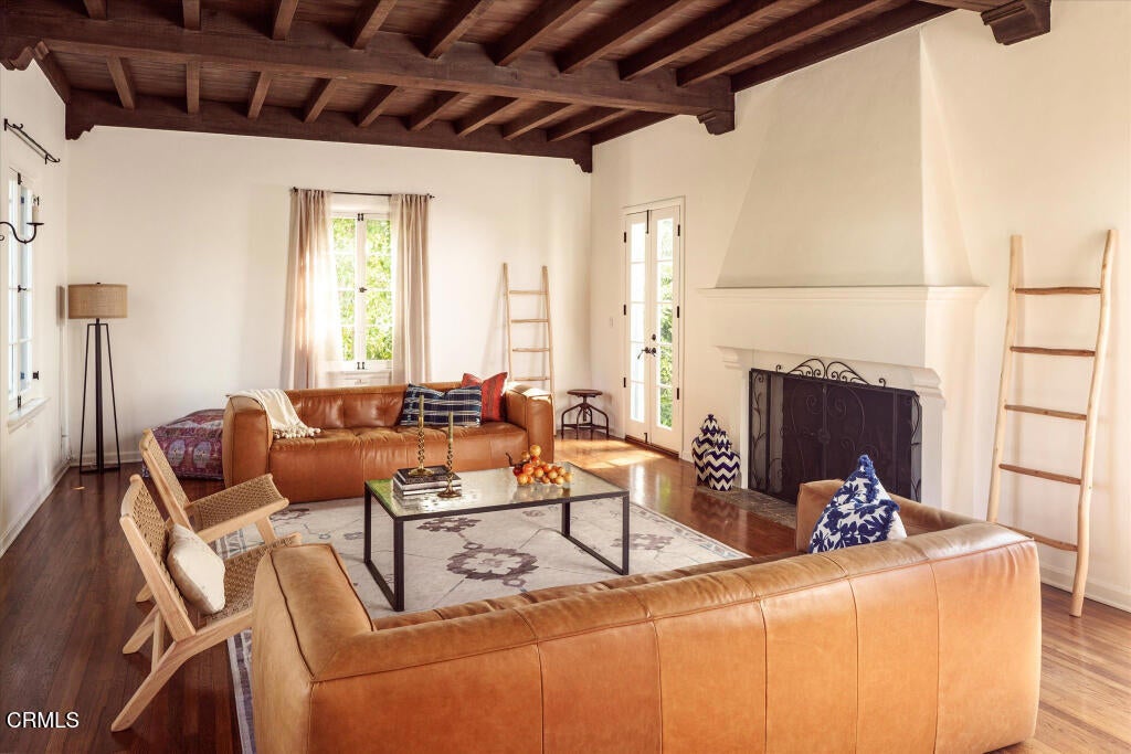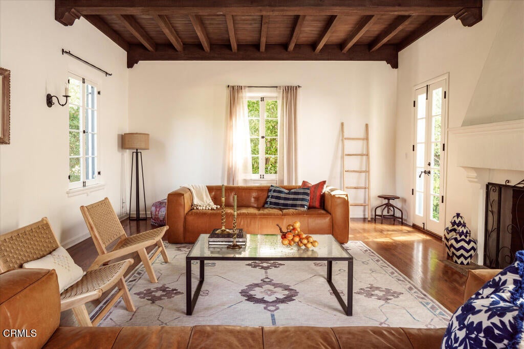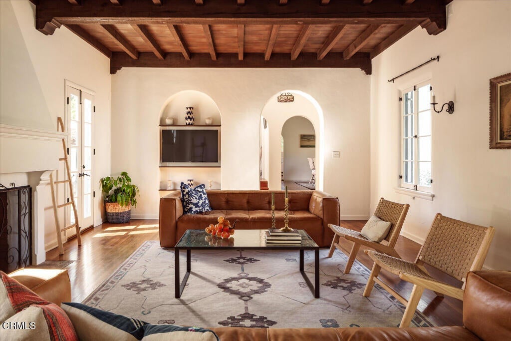 A beautifully restored and thoughtfully updated Spanish Colonial Revival, 1200 Morada Place blends timeless architectural character with elegant modern updates. The home was built in 1926 by esteemed architect John Danley Atchison who built several homes in Pasadena, Altadena and Beverly Hills. From the moment you arrive, the fantastic curb appeal makes an impression--an inviting entry framed by classic saltillo pavers sets the tone for what lies beyond. Inside, hardwood floors run throughout the home, leading to a dramatic step-down living room with exposed beam ceilings and a stunning plaster fireplace. French doors flanking the fireplace open directly to the expansive backyard, creating a seamless indoor-outdoor flow that's ideal for both entertaining and everyday living. Through traditional arched doorways, the large formal dining room opens to the updated kitchen, where white quartzite countertops, stainless steel appliances, and a Viking range combine elegance and functionality. Every detail feels intentional, honoring the home's Spanish roots while elevating it for today's lifestyle. Upstairs, a generous primary suite complete with its own fireplace and beautiful mountain views feels serene and sunfilled. A second en-suite bedroom, a spacious third bedroom, and a large hall bathroom complete the upper level, offering comfort and flexibility for family or guests. The oversized backyard is a true highlight--featuring a beautifully redone pool, an expansive grassy area perfect for gardening or play, and ample space to accommodate a future guest house or ADU. A charming covered loggia overlooks the pool and includes an additional bathroom with convenient garage access, making outdoor living effortless year-round. This incredible property is not just classic California, it's classic Altadena.
