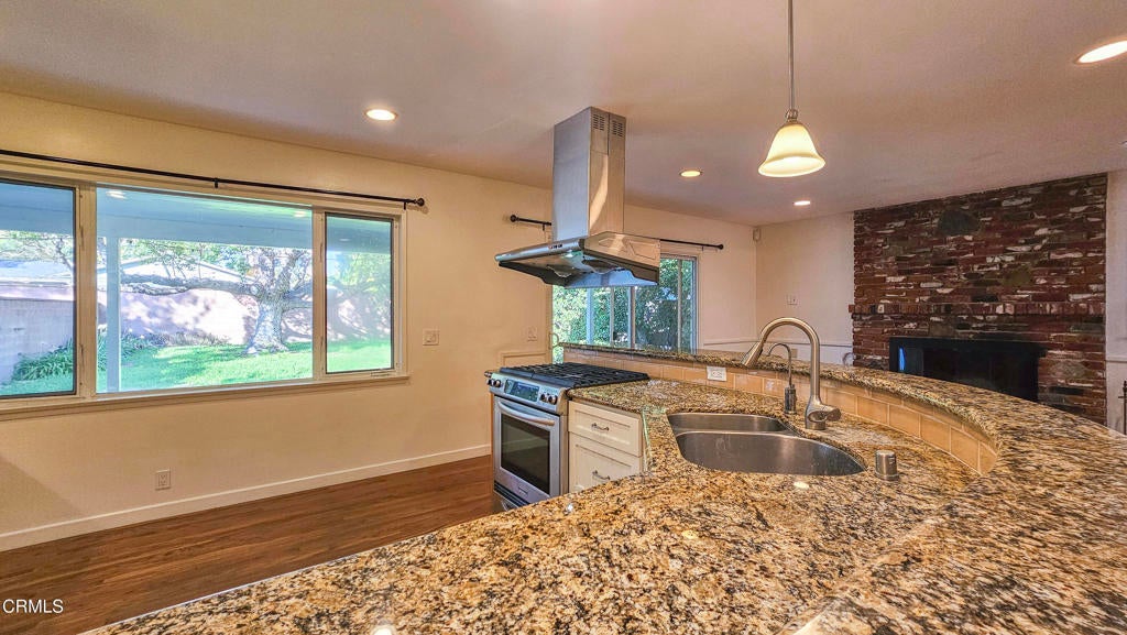 Located on a desirable corner lot in the sought-after city of Arcadia, this inviting single-story home offers comfort, character, and a wonderful sense of space. A welcoming covered front porch and neatly landscaped walkway lead you to the entryway, setting the tone for what awaits inside. The living room features rich hardwood flooring, crown molding, recessed lighting, and a striking chandelier that adds a touch of elegance. Flowing seamlessly into the dining area, a brick-surround fireplace with a raised hearth creates a warm and inviting focal point. Sliding glass doors open to a spacious backyard where a large shade tree and covered patio provide the perfect setting for outdoor dining, play, or relaxation. The updated kitchen offers granite countertops, a four-burner KitchenAid gas range with oven and hood, a stainless steel KitchenAid dishwasher, and abundant cabinetry, including a buffet-style counter for extra storage or serving space. Just beyond, a convenient laundry room with a side-by-side washer and dryer provides backyard and side access. Down the hallway, you'll find three comfortable bedrooms with hardwood flooring throughout. The hallway bathroom includes tile flooring, a granite-topped vanity, and a full tub and shower combination with tile extending to the ceiling. The primary suite at the end of the hall offers a spacious closet and a private ensuite bathroom featuring a deep jetted soaking tub, a separate glass-enclosed shower with a bench seat, and a single-sink vanity. A detached two-car garage and generous driveway provide ample parking. Located within Arcadia's award-winning school district and close to shopping, dining, and local amenities, this home combines classic charm with everyday convenience, a perfect place to call home.