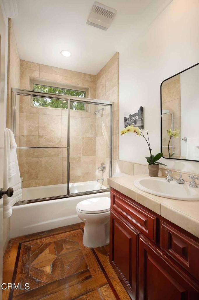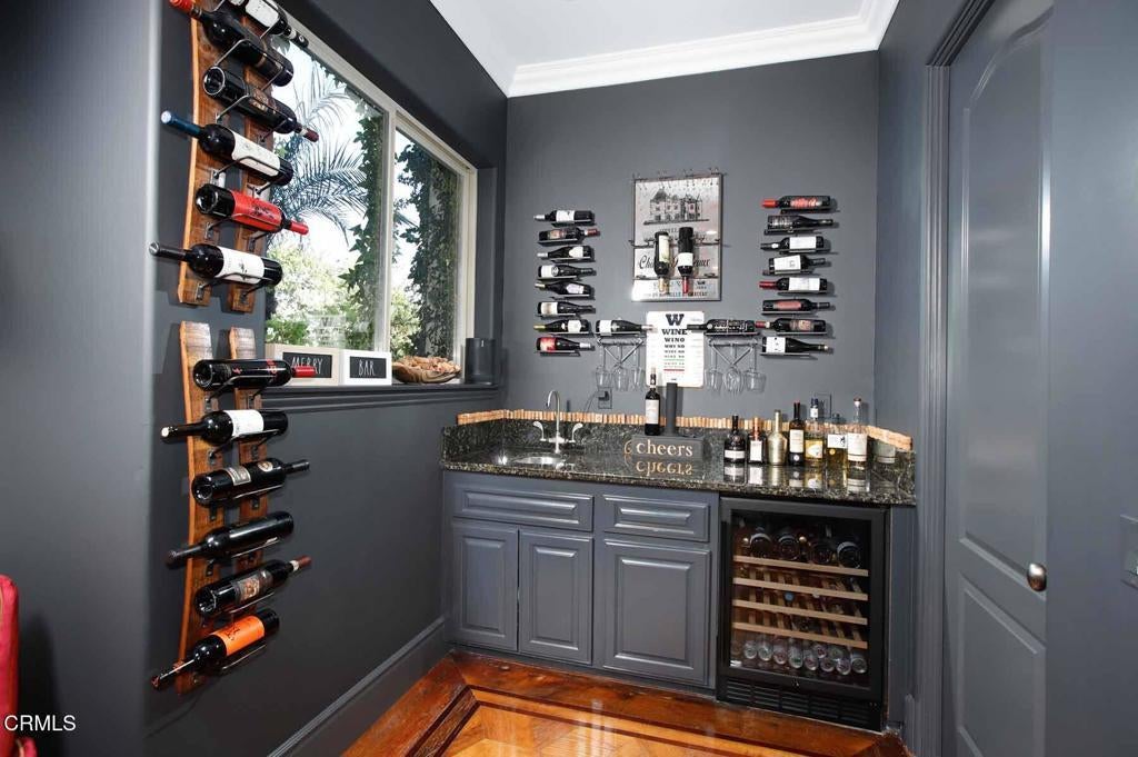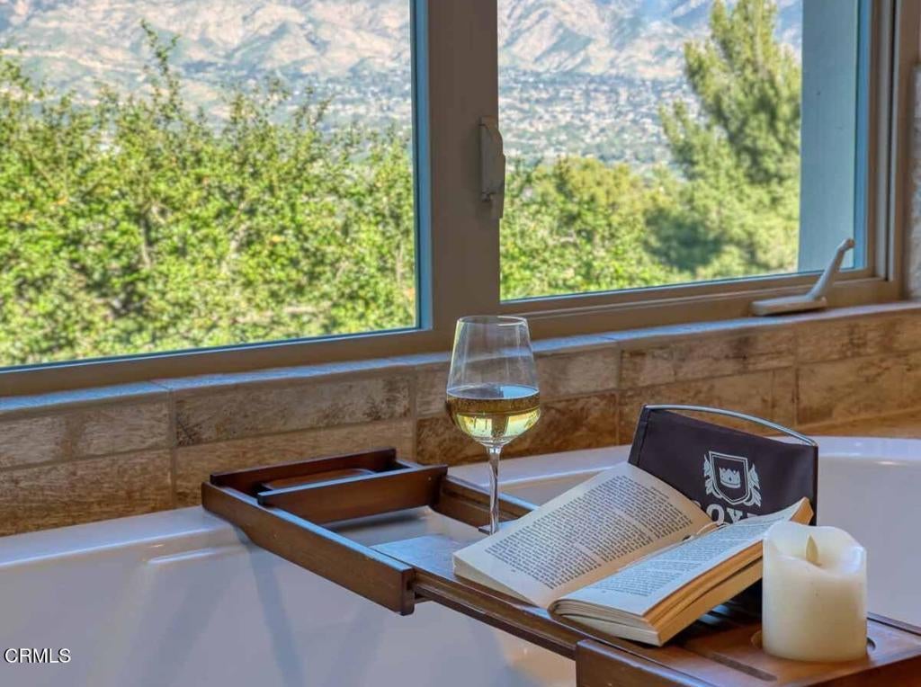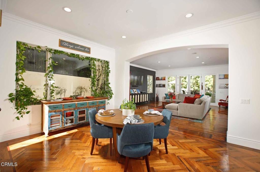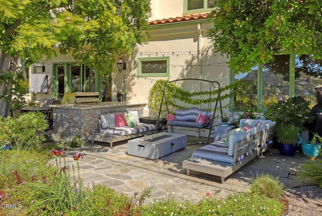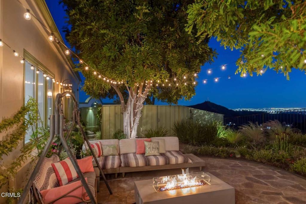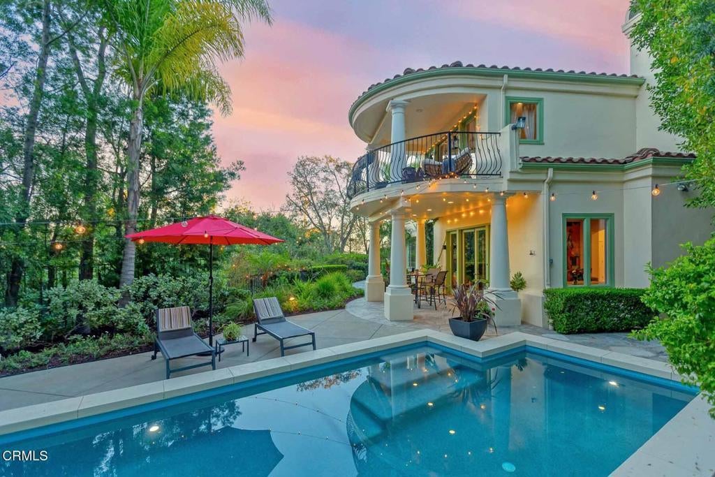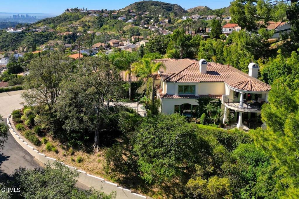 This luxurious Flintridge estate offers rare privacy and has been thoughtfully updated over the years. The home features 5 beds, 4 full baths, 1/2 bath, and located just minutes from downtown La Canada, local schools, and the freeway, yet feels worlds away with sweeping views of downtown Los Angeles and San Gabriel Mountains. From the moment you enter through the secure, beautifully landscaped courtyard and step inside through custom wood double doors, you will see dramatic 19-foot entry ceilings, curved staircase with wrought iron balusters, arched doorways, reclaimed oak and rosewood floors, and detailed crown molding that create a sense of warmth and character that carries throughout the home. The spacious step-down living room features 11-foot ceilings, oversized windows that fill the space with natural light, a grand fireplace, and illuminated built-in shelving. The generous family room offers another fireplace, wet bar with wine cooler, storage closet designed to accommodate larger wine units, and direct access to the private heated pool and patio. Surrounded by lush landscaping, this creates a seamless indoor-outdoor flow that is ideal for entertaining or relaxing. The gourmet kitchen sits beside the casual dining area and provides abundant storage and counter space. A large central island with sink anchors the room, complemented by top-of-the-line appliances, including Sub-Zero refrigerator, Viking 6-burner gas cooktop with griddle and double ovens, separate warming oven, and spacious walk-in pantry. The elegant dining room features double French doors that open to multiple patios designed for outdoor dining and gathering. The outdoor kitchen includes a built-in BBQ, sink, and refrigerator, while a cozy spa with a rock waterfall provides a tranquil place to unwind. Completing the main level is a spacious bedroom, full bathroom, guest powder room, and a well-appointed laundry room. Upstairs, the expansive primary retreat includes vaulted ceilings, fireplace, large walk-in closet, and spa-inspired bathroom with dual sinks, a generous shower, and separate soaking tub. A covered balcony provides peaceful space to enjoy views of the San Gabriel Mountains. The upper level also includes a bedroom with private en-suite bath and 2 additional bedrooms connected by shared bath with dual sink areas and walk-in closets. A 3-car garage with charging station, 7-car motor court, and access to La Canada's award-winning schools complete this exceptional property.