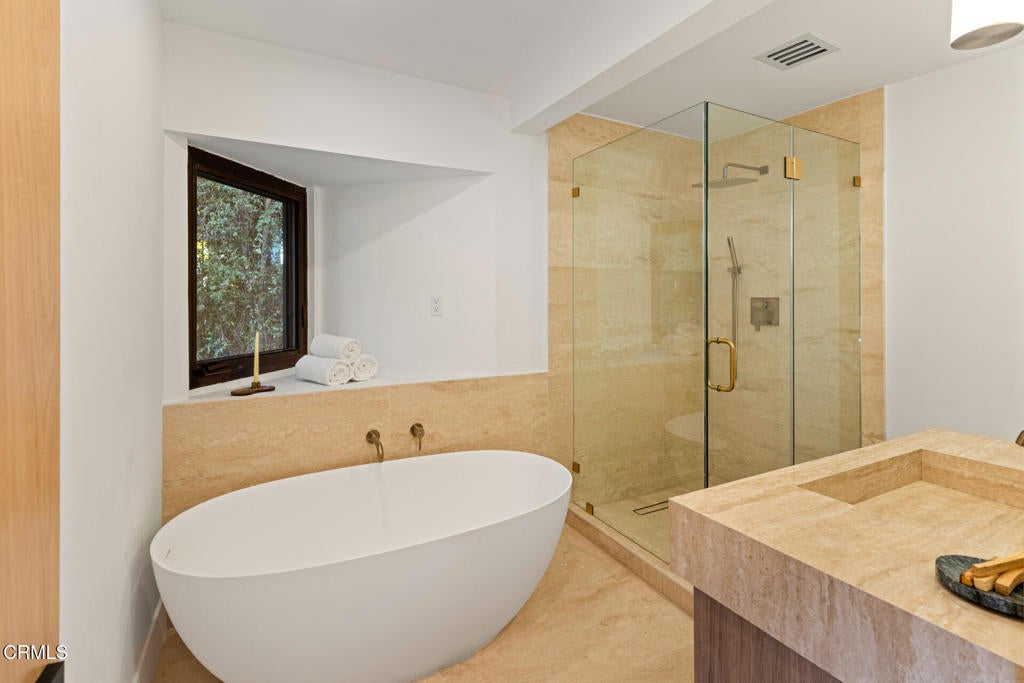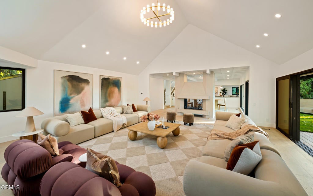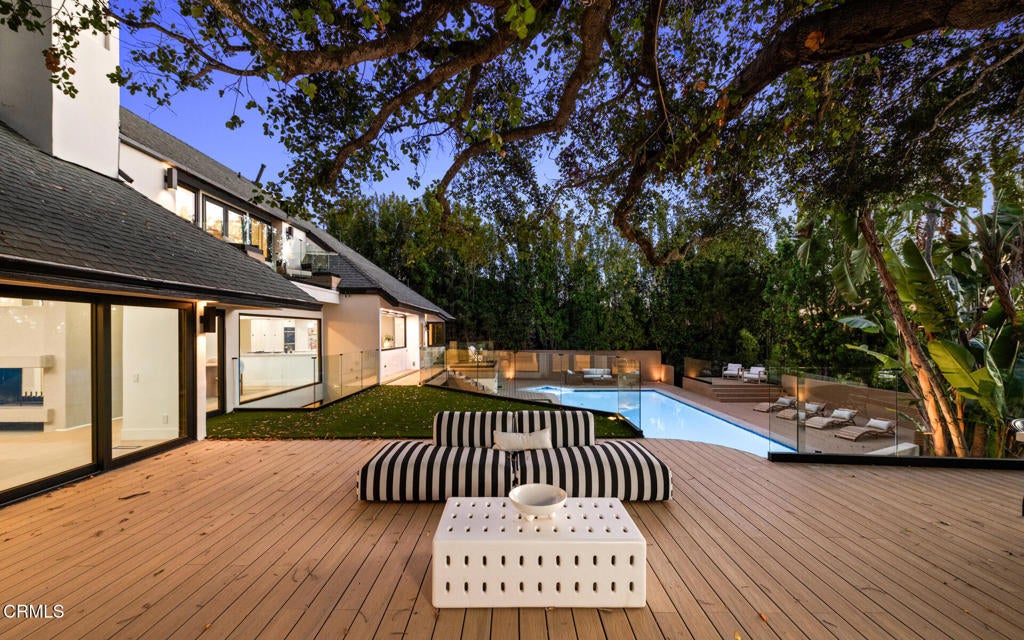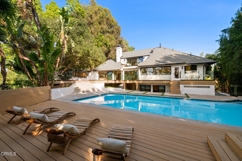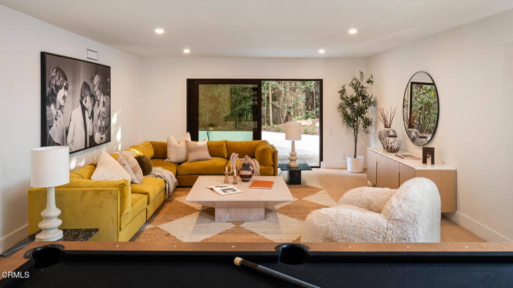 Tucked behind a long private driveway and secured by double gates, this newly renovated residence offers exceptional privacy and tranquility within the exclusive gated enclave of Oak Pass Road--an intimate Beverly Hills community celebrated for its serene setting and notable celebrity residents.Surrounded by mature landscaping and natural canyon beauty, the 4,000+ square-foot home is a peaceful retreat just minutes from the world-class shopping, dining, and lifestyle offerings of Beverly Hills. The main level welcomes you through a striking grand pivot entry door into an open, light-filled floor plan designed for gracious living and entertaining. Architectural highlights include vaulted ceilings, a central fireplace, refined custom details, wide-plank French oak flooring, and designer Spanish alabaster lighting throughout.The expansive chef's kitchen seamlessly blends elegance and functionality, showcasing striking Taj Mahal marble countertops, a center island, breakfast nook, abundant storage, and top-of-the-line Miele and Viking appliances--ideal for both everyday living and effortless entertaining.The upper level is dedicated entirely to the primary suite, a private sanctuary complete with a fireplace, balcony, walk-in closet with custom built-ins, and a spa-inspired ensuite bathroom adorned with full-slab travertine stone finishes.The lower level offers a spacious entertaining lounge with direct access to the pool and outdoor living areas, creating a seamless indoor-outdoor experience. The backyard is framed by sleek glass railings that preserve unobstructed canyon views, enhancing the sense of openness and connection to the surrounding landscape. With a private entrance, this level also includes a versatile bonus room with an adjacent bathroom--perfect for use as an additional bedroom, gym, studio, playroom, or home theater.Set within one of Beverly Hills' most coveted and tranquil gated communities, this turnkey five-bedroom, four-bathroom residence delivers a rare blend of privacy, scenic canyon surroundings, and proximity to city amenities--an exceptional opportunity to own a newly renovated home offering gated seclusion, captivating views, and an elevated outdoor lifestyle.
