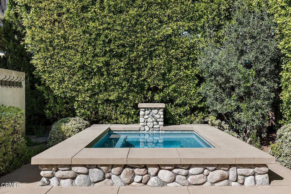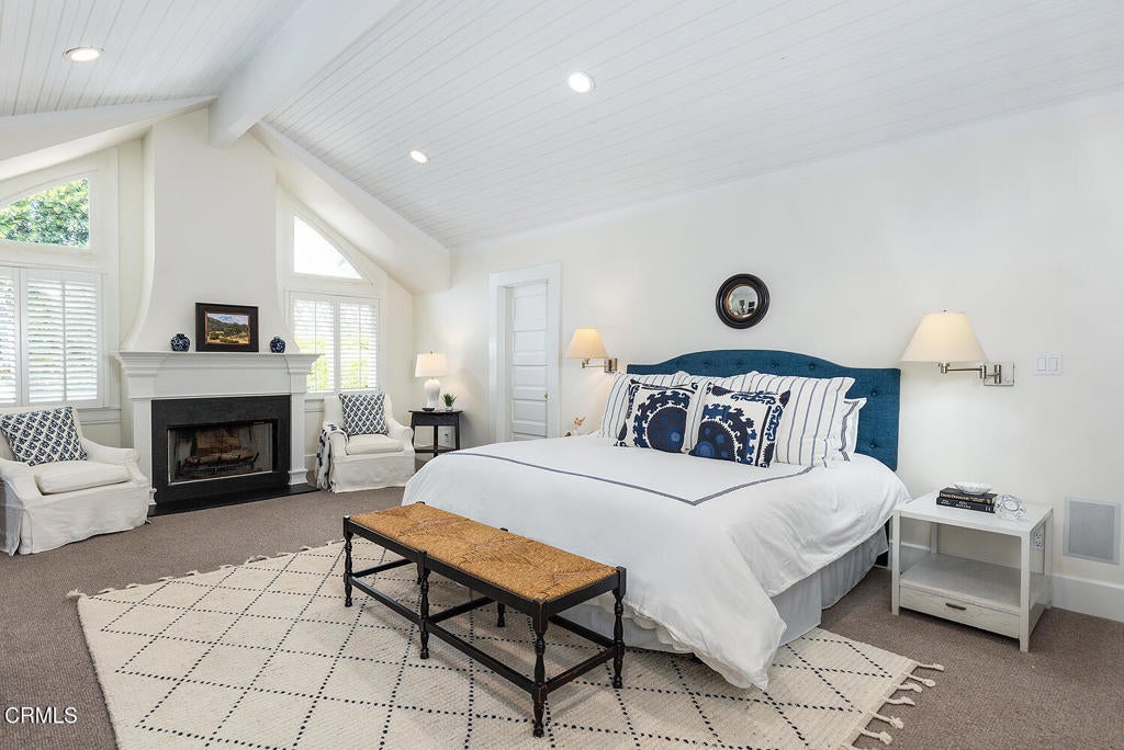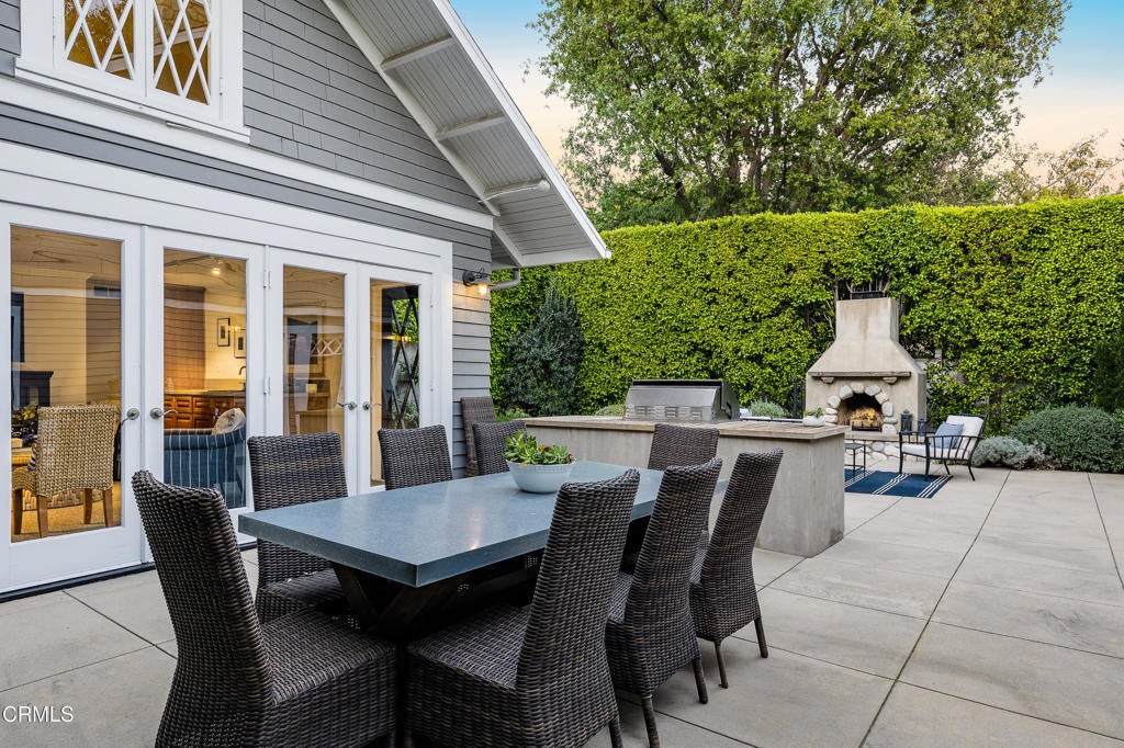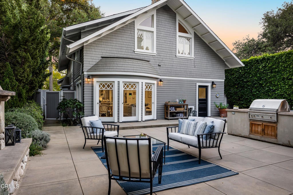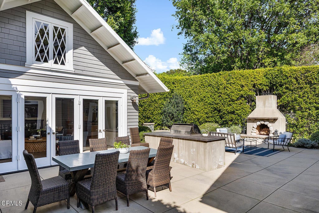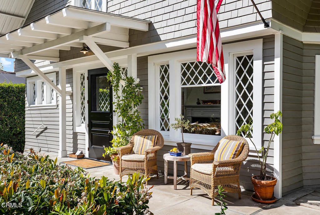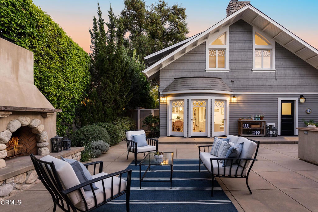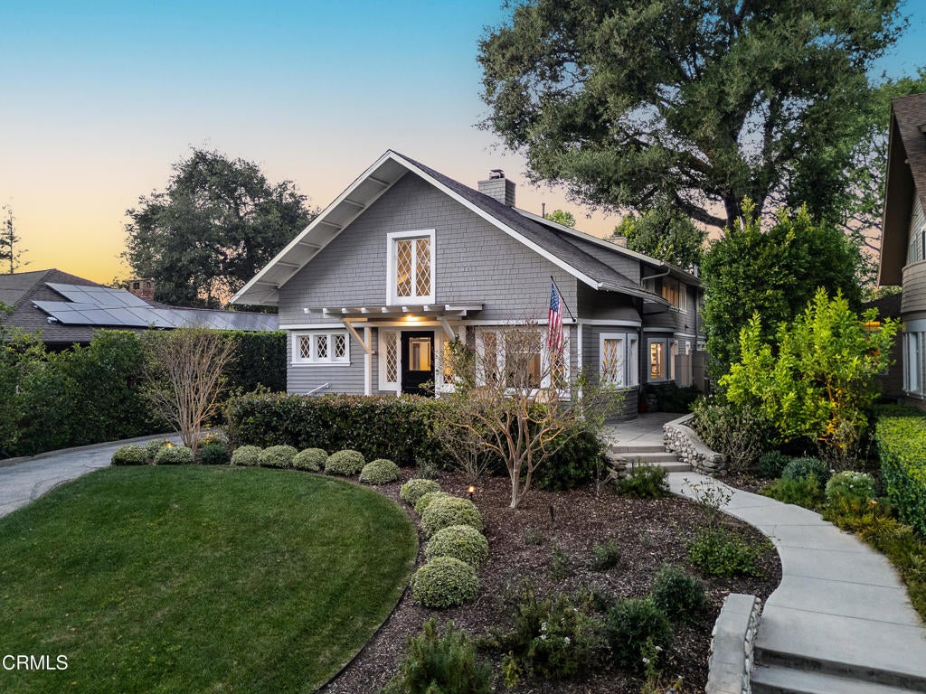 This captivating farmhouse-style residence, built shortly after the turn of the century, is situated on one of West Pasadena's most prestigious estate streets and showcases many architectural details of the era. The dramatic living room features 25-foot vaulted ceilings, a commanding fireplace, and streams of natural light through period diamond-paned windows.The dining room and butler's pantry are complete with custom built-in cabinetry, adding both charm and functionality. The generous floor plan offers four bedrooms, including a spacious primary suite with soaring ceilings and serene treetop views. An office adjacent to the living room offers a convenient workspace or library.The kitchen and family room flow seamlessly to a rear patio, creating an ideal setting for indoor-outdoor entertaining. The grounds offer a private garden setting with mature trees, natural landscaping, and towering verdant hedges. A distinctive river rock motif is carried throughout the property, from the low river rock wall and welcoming front steps leading to the expansive porch to the outdoor fireplace and spa with river rock detailing in the backyard.The garage currently serves as a large bonus room with a finished second-floor loft, providing ample storage and includes a split air system.