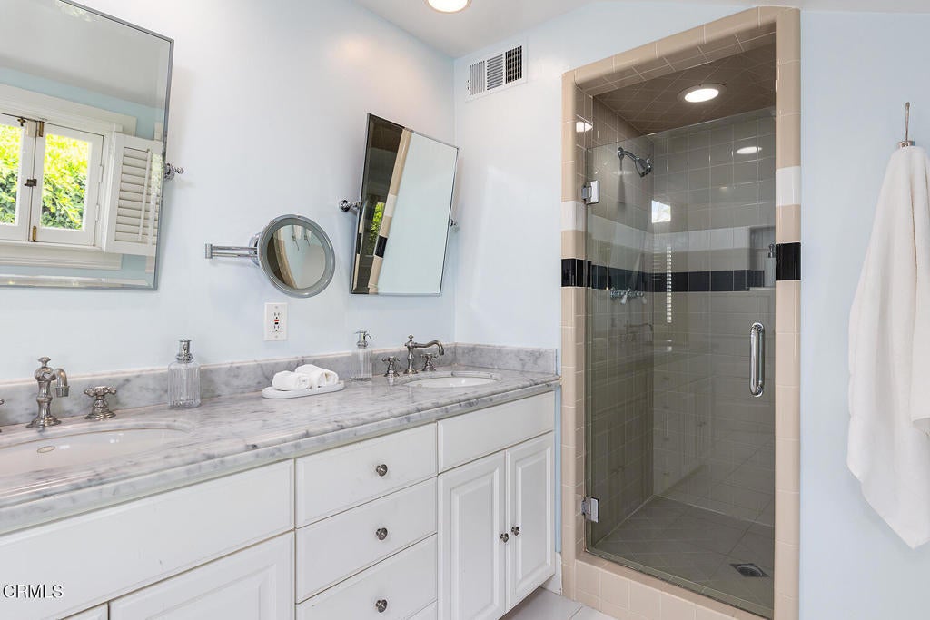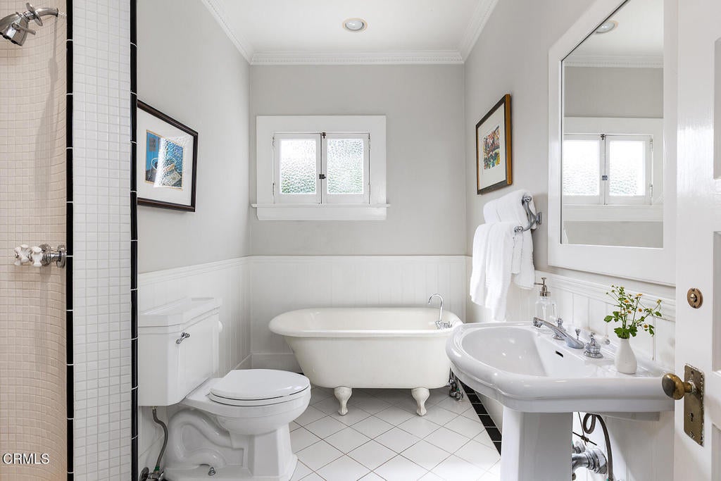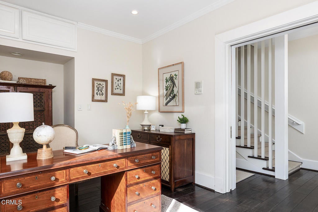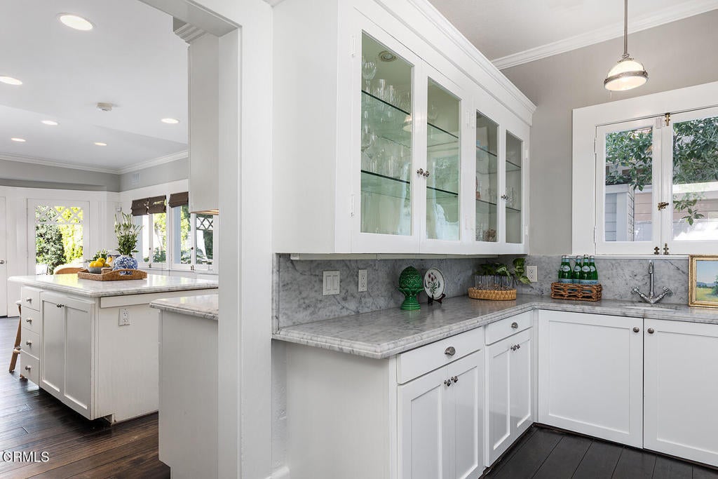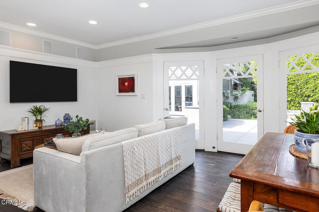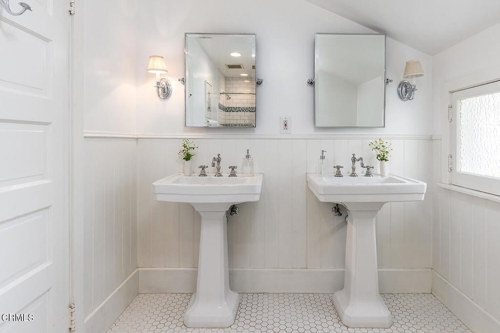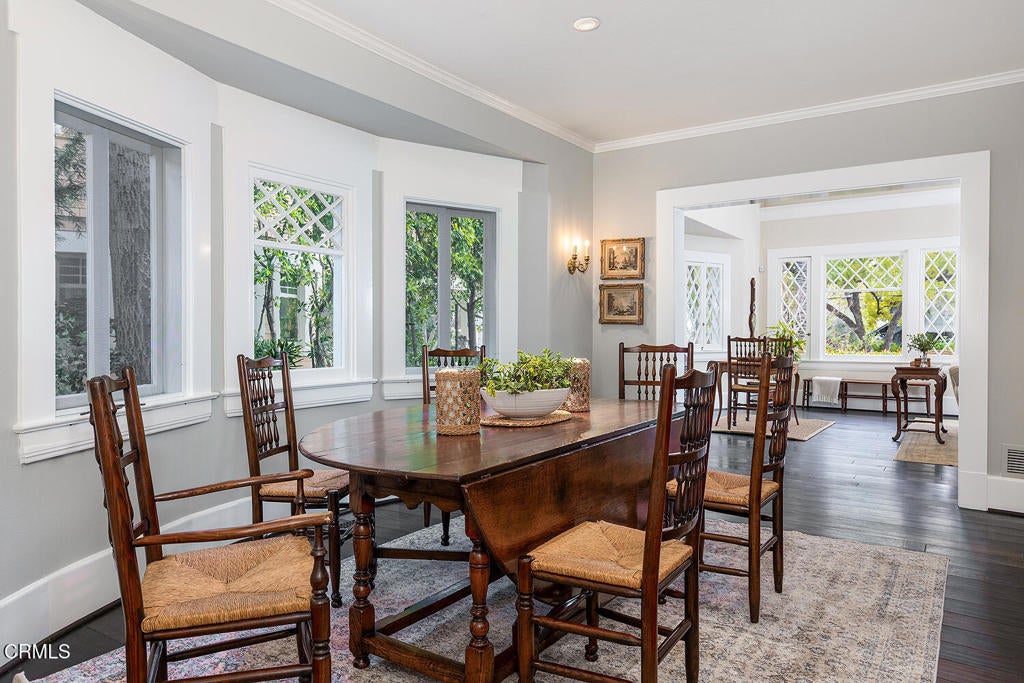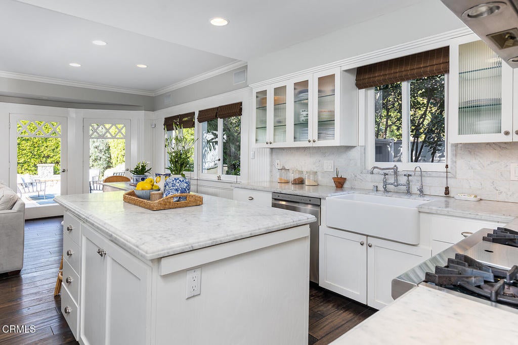 This captivating farmhouse-style residence, built shortly after the turn of the century, is situated on one of West Pasadena's most prestigious estate streets and showcases many architectural details of the era. The dramatic living room features 25-foot vaulted ceilings, a commanding fireplace, and streams of natural light through period diamond-paned windows.The dining room and butler's pantry are complete with custom built-in cabinetry, adding both charm and functionality. The generous floor plan offers four bedrooms, including a spacious primary suite with soaring ceilings and serene treetop views. An office adjacent to the living room offers a convenient workspace or library.The kitchen and family room flow seamlessly to a rear patio, creating an ideal setting for indoor-outdoor entertaining. The grounds offer a private garden setting with mature trees, natural landscaping, and towering verdant hedges. A distinctive river rock motif is carried throughout the property, from the low river rock wall and welcoming front steps leading to the expansive porch to the outdoor fireplace and spa with river rock detailing in the backyard.The garage currently serves as a large bonus room with a finished second-floor loft, providing ample storage and includes a split air system.
