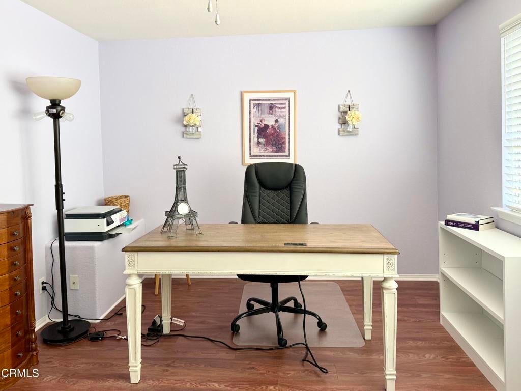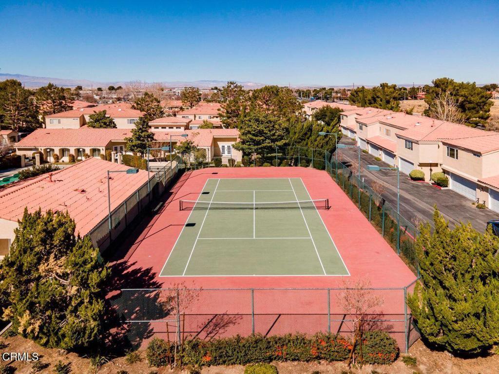 Welcome to this beautifully maintained 2-bedroom condo in the gated Marbella Villas community. Located around the corner from Antelope Valley College. This home features laminate wood flooring on the main level and newer laminate flooring upstairs as well. Both bedrooms are spacious en-suites, each with a walk-in closet, full bathroom, and ceiling fans. The inviting living room offers a cozy gas fireplace and wet bar, perfect for entertaining or unwinding at the end of the day. Step outside to your own private, gated courtyard with pavers and lush landscaping, an ideal space for morning coffee or evening relaxation.Residents of Marbella Villas enjoy a wide range of amenities, including a pool, spa, tennis court, recreation center, fitness room and playground. The HOA includes water and trash.Each unit comes with a private 2-car attached garage and upstairs laundry.