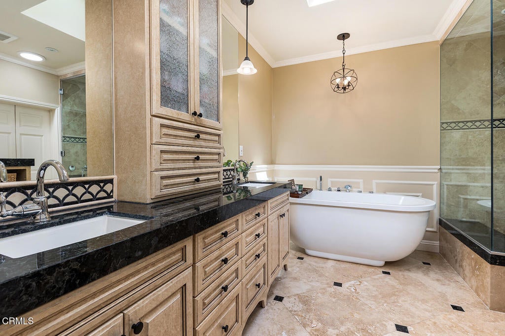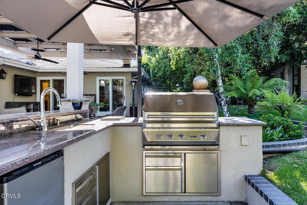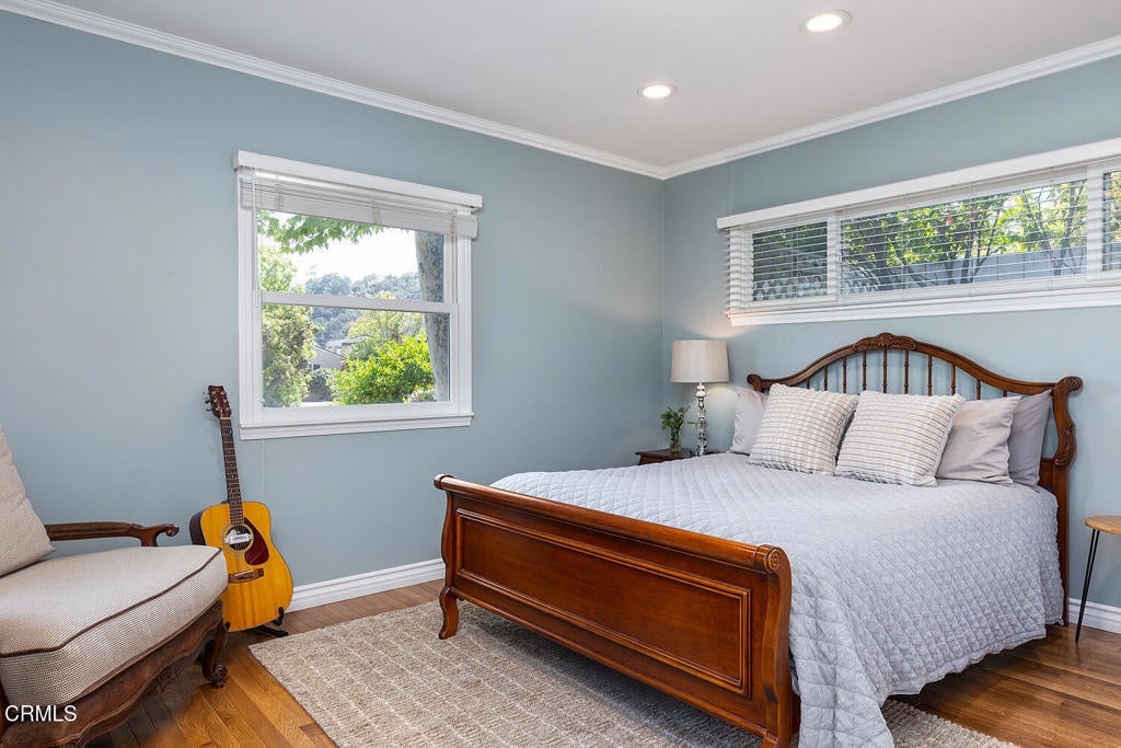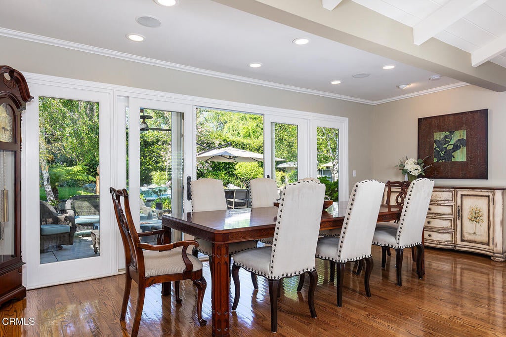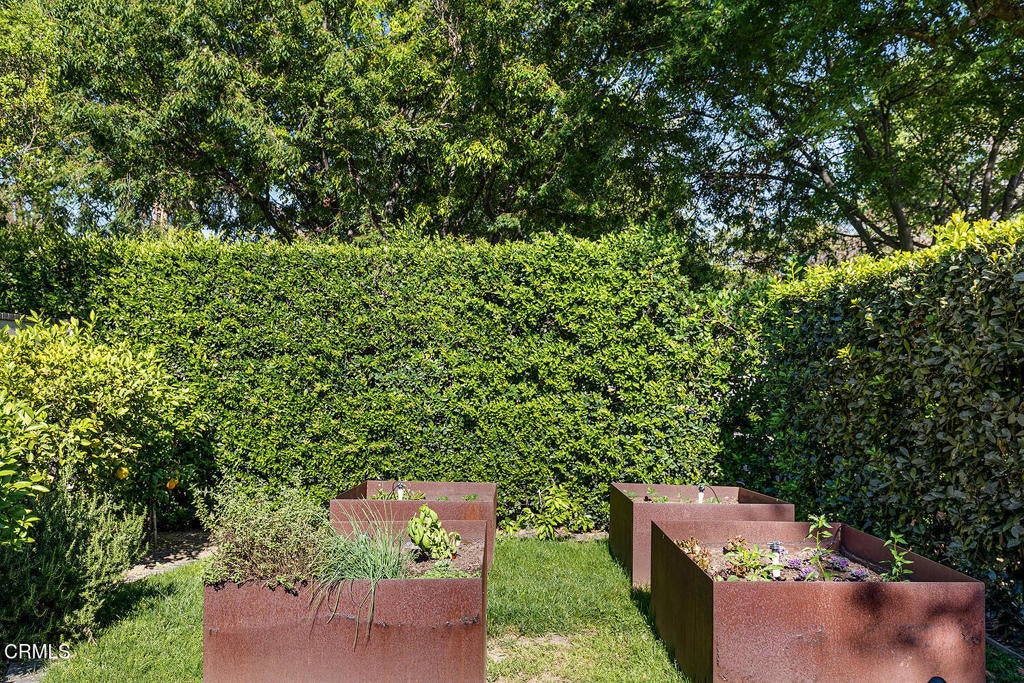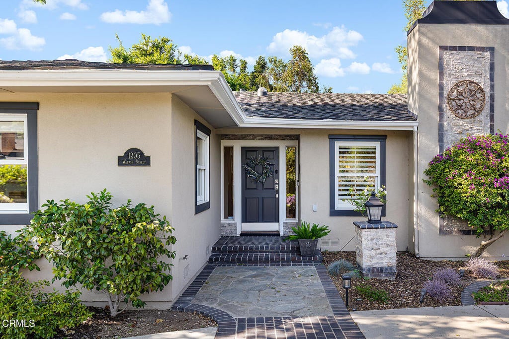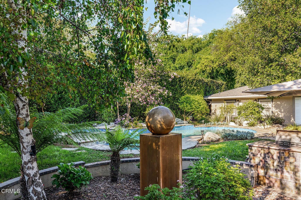 The ultimate Linda Vista dream! This single-level updated Midcentury ranch on a quiet cul-de-sac offers privacy, upgrades, and prime Southern California lifestyle. Located on a large corner lot, this 3 bedroom, 4 bath home with gardens, pool, spa and bonus studio space is exceptional. The front yard boasts olive, sycamore, birch and avocado trees, and a rainbow of drought tolerant pollinator-friendly plants bordering the circular driveway. Inside, the formal entry draws visitors into a harmonious space with oak hardwood floors, handsome crown and base moulding indicating quality and pride of ownership. The living room features vaulted, beamed ceilings and a large decorative fireplace flanked by south-facing windows. With the dining room to the north boasting a wall of windowed doors, this space is drenched in natural light. The dining room's access to the back yard entertaining patio is right on theme: 1205 Wabash is defined by elegant year round indoor-outdoor living. The large chef's kitchen and family room serve as the home's central hub, and also offer access to the backyard. The kitchen features rich wood cabinetry, paneled appliances, granite countertops and a sizable island with breakfast bar seating for four. A cozy second fireplace in the den makes for a perfect setting to enjoy movie nights in, guests optional! The updated powder bath is close by and easy. Bedrooms and bath throughout the home are upgraded, with wood and stone tile floors and dual-pane windows, each enjoying pretty garden views. This home offers two primary suites, both with generous closet space and direct outdoor access. The primary suite on the eastern side of the home also features the home's third fireplace, vaulted ceilings and skylights. Its spa-worthy bath with dual sink vanity boasts a jetted soaking tub, radiant heat flooring AND a steam shower. Outside, the fantasy continues with a saltwater pool, cascading spa, enviable outdoor kitchen with a built-in grill, and a covered entertainment patio. A separate conditioned studio space is tucked away under trees, a quiet room of one's own if respite or focus is required. The back yard enjoys an ideal mix of sun and shade, with prolific fruit trees and a custom iron raised-bed garden enveloped in a Bay laurel hedge adjacent to the fully finished 3-car garage. In arguably the best location in Pasadena, this home enjoys convenient access to Old Town, Rose Bowl and Aquatic center recreation plus the trails of the Arroyo Seco.