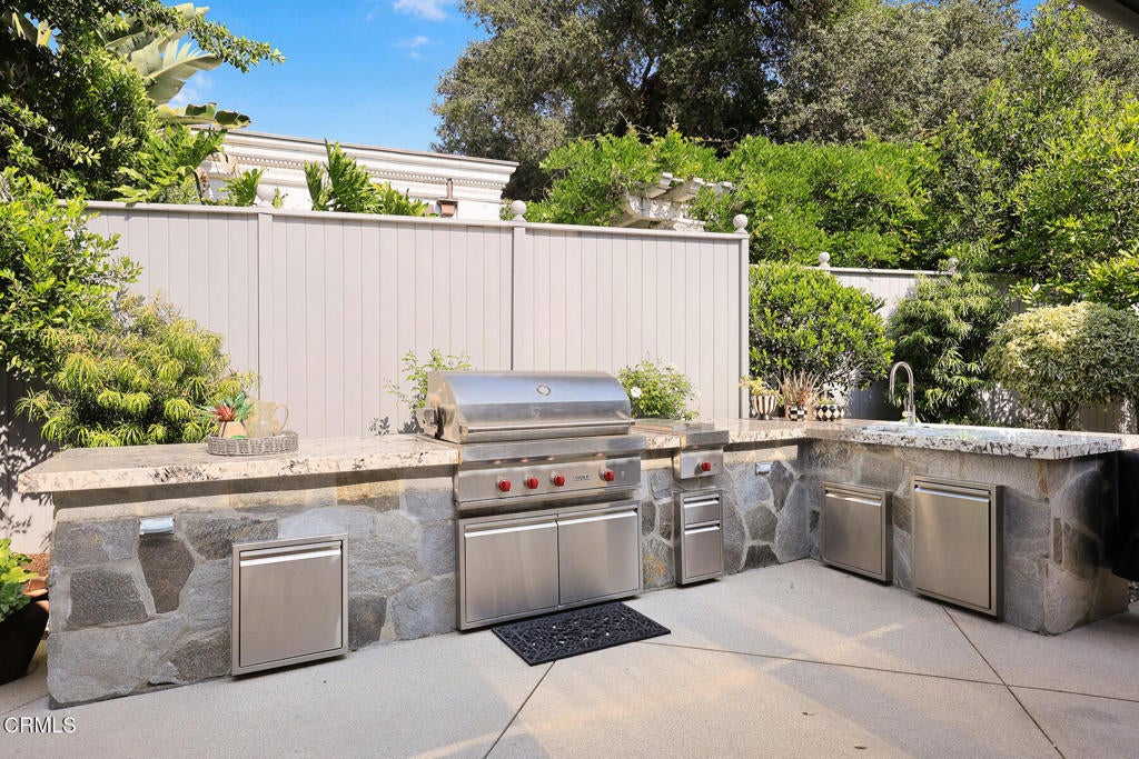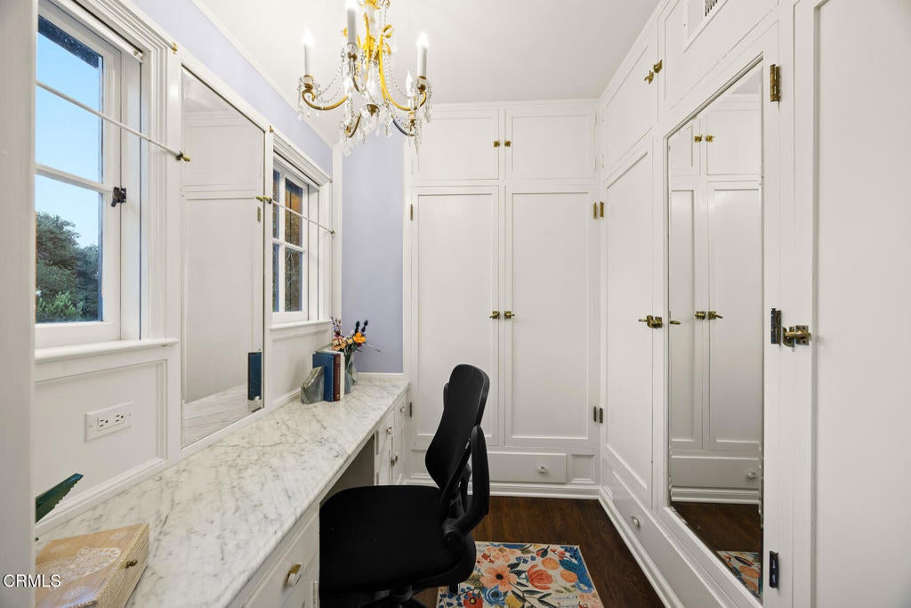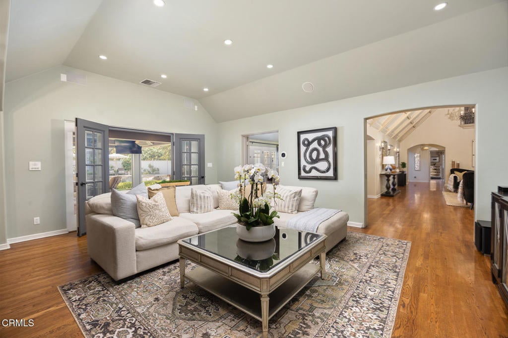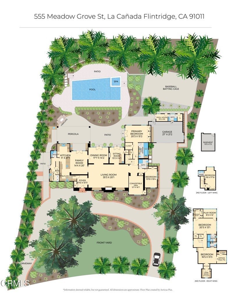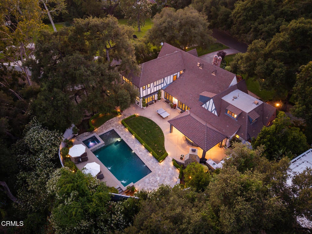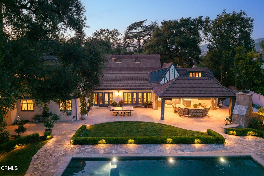Elegantly nestled on over half an acre in the prestigious Meadow Grove enclave of La Canada Flintridge, this 1926 English Revival Estate is a masterpiece of architectural heritage and modern refinement. Designed by the esteemed Ray J. Kieffer and crafted by renowned builder Glenn O. Winget, the home exudes timeless charm while seamlessly integrating thoughtful updates for contemporary living. From the moment you arrive, the estate captivates with its commanding presence, framed by a circular drive and lush, park-like grounds that radiate privacy and tranquility. The arched entryway welcomes you into a grand living room, where soaring beamed coffered ceilings, leaded glass windows, and a stately fireplace create an ambiance of classic sophistication. Beyond, a warm and inviting family room unfolds into a chef's kitchen that's both stylish and functional, featuring a central island, custom cabinetry, and luxurious stone countertops. High-end appliances, including double ovens, a six-burner range, wine fridge, and an oversized refrigerator, make this space a culinary dream, while an adjacent laundry room with a three-quarter bath and a second-floor bedroom with half bath add thoughtful convenience.Perfectly suited for entertaining, the formal dining room flows effortlessly to a chic lounge-style bar, while just beyond a comfortable den offers an additional space for relaxation. A private hallway leads to a generously sized guest bedroom with detached guest bathroom. A separate wing offers a serene primary suite, complete with sophisticated finishes and a spa-inspired bathroom designed for ultimate relaxation. Two guest bedroom ensuites sit upstairs, featuring large closets and each with it's own office alcove. Step outside to discover a professionally landscaped oasis designed for both leisure and entertainment. A sprawling covered patio, accessible from the main living areas, is equipped with an outdoor kitchen, built-in BBQ, space heaters, and a cozy outdoor fireplace. The elevated pool and spa, adorned with tranquil water features, promise endless enjoyment, while a batting and golfing cage tucked under the shade of mature oak trees adds a touch of playful luxury. For car enthusiasts, the detached garage with attic storage accessed by pull-down ladder, and additional gated parking provide ample space. This estate is the perfect blend of timeless elegance and modern functionality, with award-winning schools, offering an unparalleled lifestyle opportunity
