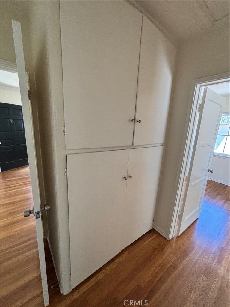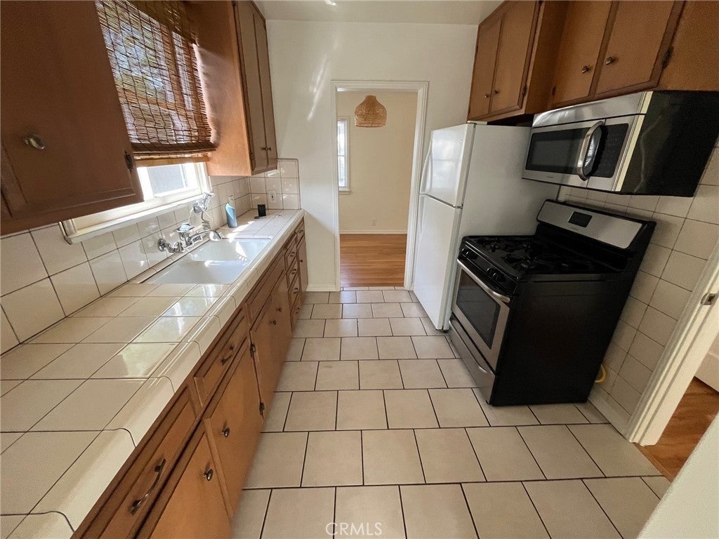 Tucked away in a quiet court of just six cottages, this delightful freestanding one-bedroom, one-bath home offers the perfect blend of privacy, charm, and convenience. With no shared walls. Inside, a bright single-level layout welcomes you with a cozy living room featuring a bay window, gleaming hardwood floors, elegant crown molding, and both wall and window A/C units for year-round comfort. A separate dining area with a built-in corner hutch adds vintage appeal and extra storage, while the galley-style kitchen boasts tiled counters and floors, ample cabinetry, and all essential appliances—including a gas stove, refrigerator, and extractor fan. A built-in vintage ironing board adds a charming touch. The bathroom includes a shower over tub and classic tile flooring. Additional storage is found in both the linen and hall closets, plus a dedicated laundry room with washer, dryer, and extra space. A detached one-car garage provides secure parking, and water and trash services are included. Conveniently located near public transportation and local eateries, this rare cottage combines comfort, character, and location in one inviting package.