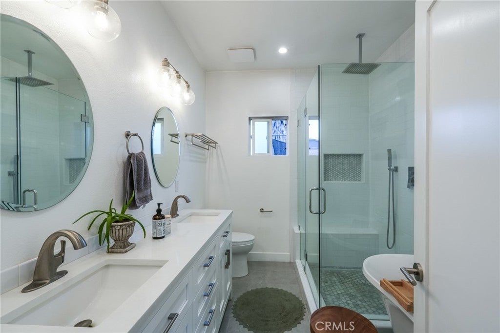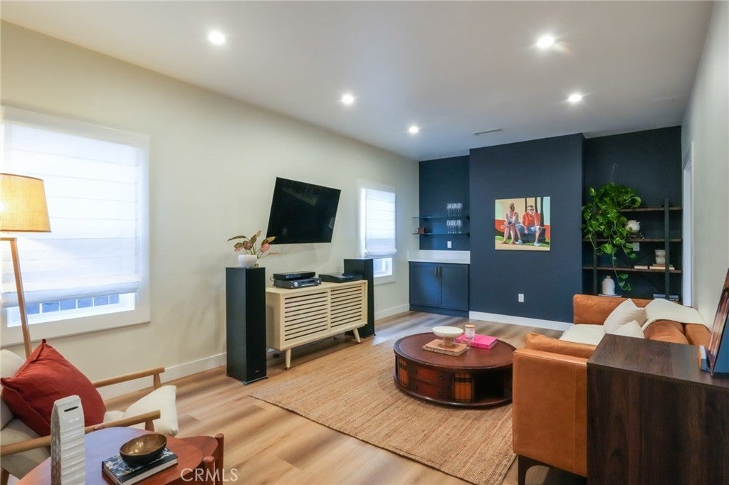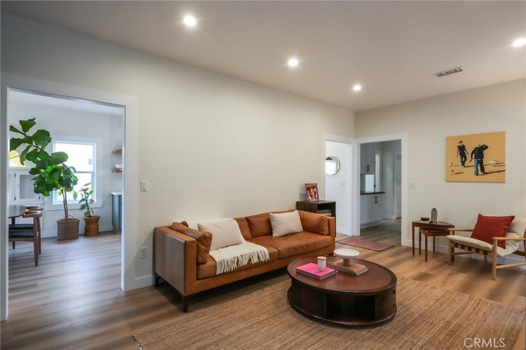 Private Gated Retreat in the Heart of Atwater Village! Tucked behind a vine-draped trellis, this reimagined Atwater Village home offers privacy, modern design, and relaxed California living. Set back from the street, it welcomes you with a charming front yard framed by planters and greenery. Inside, a foyer with nine-foot ceilings opens to a bright dining area accented by an early 1900s built-in and an adjacent sitting space. The remodeled kitchen anchors the home with a large island, quartz countertops, high-end finishes, a 36-inch Thor gas range, and an expansive pantry. A separate living room with a built-in bar creates an ideal space for entertaining or unwinding. Three bedrooms include a serene primary suite with a walk-in closet and a spa-like bath featuring a clawfoot tub, oversized rain shower, and dual vanity. Two full bathrooms plus a powder room serve the home, and a spacious basement offers excellent storage or potential for a wine cellar. The backyard is designed for effortless outdoor living with a large covered patio and a detached bonus room perfect for a private office or studio. Additional features include dual-pane windows, updated plumbing and electrical, a separate laundry room, tankless water heater, 220V EV outlet, CAT-6 wiring, and fruit trees including key lime, pomegranate, and mandarin. Located in Central Atwater, moments from cafés, boutiques, and bike paths, this private sanctuary embodies modern Los Angeles living—stylish, functional, and inviting.