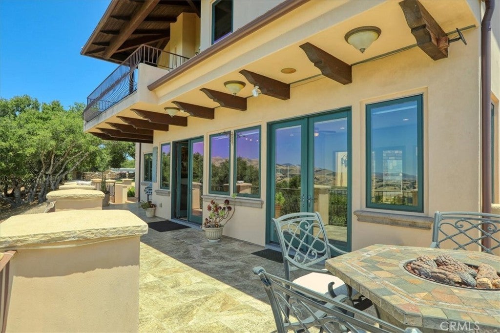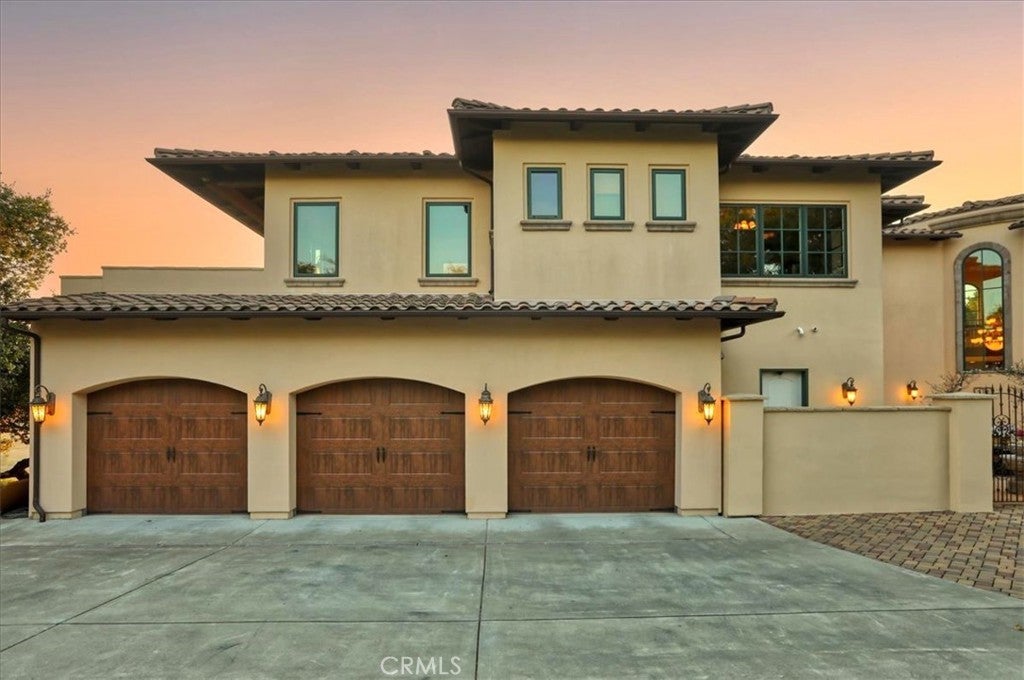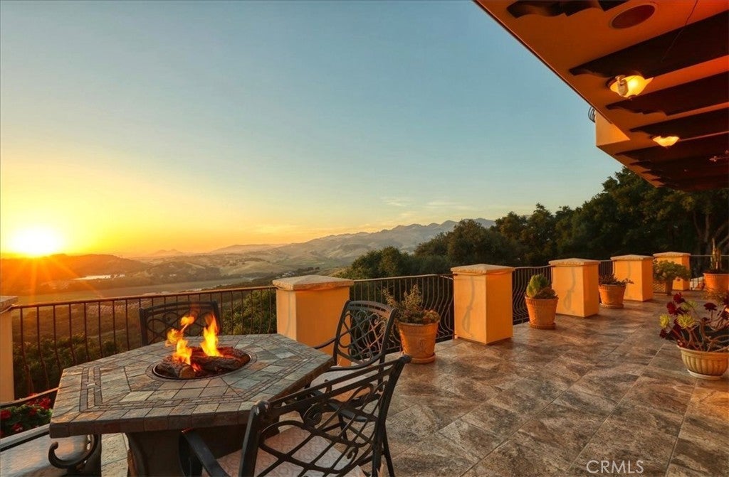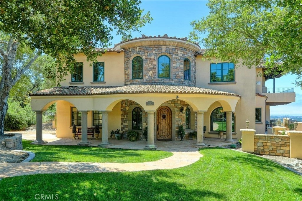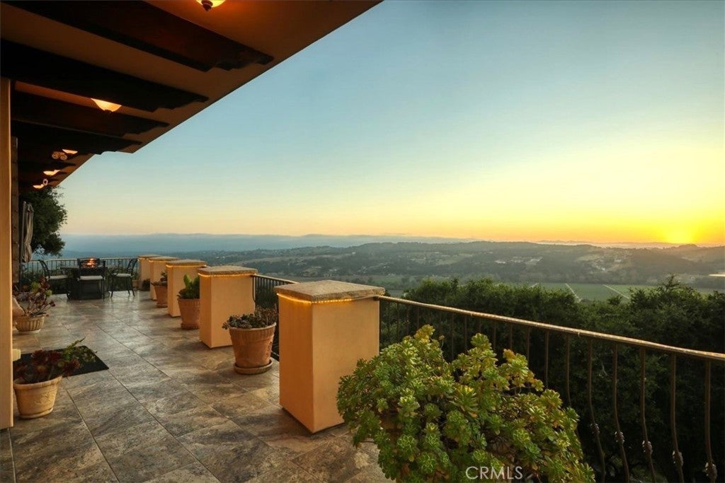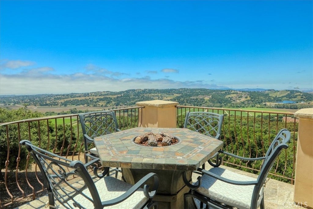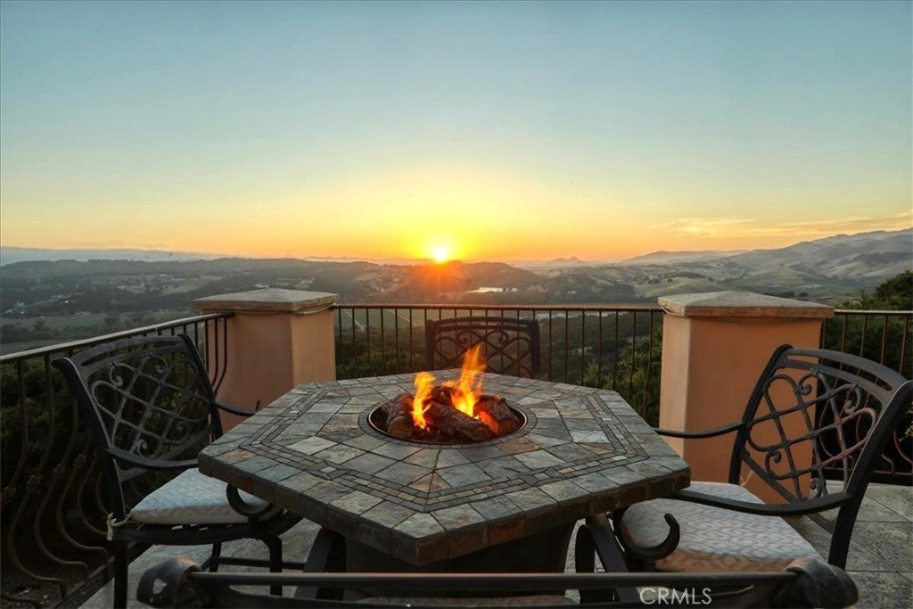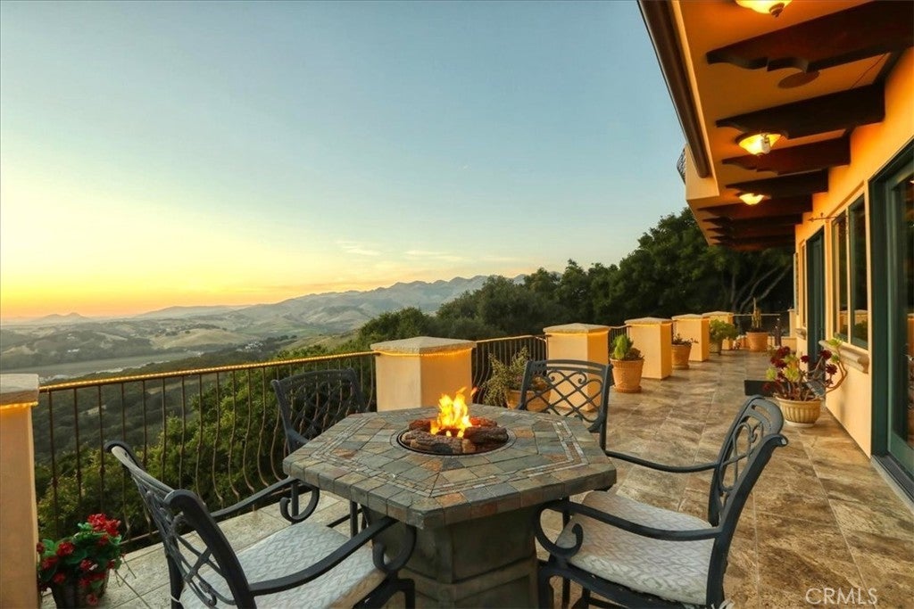 Enjoy the elegance and serenity of this magnificent Tuscan inspired villa that creates a sophisticated yet relaxing atmosphere. Absolutely incredible panoramic views stretch to the Pacific Ocean, the Edna Valley and beyond to the peaks of San Luis Obispo. Entering the home, you will find a welcoming foyer with elevated beam ceiling and beautiful custom wood and iron staircase. The versatile and thoughtfully designed floorplan includes elegant engineered wood flooring throughout the main level and natural wood beamed ceilings. Five fireplaces throughout create an intimate atmosphere. Numerous Jeld–Wen windows provide abundant natural light and outdoor views. On the main level a gourmet kitchen features beautiful natural wood cabinetry with convenient sliding pull out drawers in each cabinet, a Wolf cooktop with custom hand-crafted vent hood, built-in refrigerator, wine fridge, spacious granite counters, and more. The adjoining great room with wood burning fireplace offers access from both sides to outdoor spaces making it ideal for entertaining. On one side, picturesque vistas of the valley, vineyards and ocean await you from the view deck that is over 50’ in length. While on the other side is a protected courtyard with its own fireplace creating a relaxed ambiance to enjoy more views and sunsets. In addition to these amazing outdoor spaces is another courtyard at the southside of the residence that is a perfect place for morning coffee or breakfast as the sun rises above the oak trees. The owner’s suite with its elevated ceiling, fireplace and view deck is a tranquil place to start and end your day. The en-suite bathroom has a separate tub, walk in closet and spacious step-in shower with its own valley and ocean views. There are also two additional guest suites that include their own bathrooms, one with it's own view deck. There is a library, a gym and an office, each with the potential for many other uses or could be converted to additional bedrooms. There is an abundance of storage closets throughout, including two intentionally placed for a future elevator if needed. On the lower level is a 500 sq ft guest studio complete with kitchenette, a full bath, private access and private view deck. There is also a hobby room near the oversized 3 car garage. Surrounded by over 4,500 acres of protected open space, Las Ventanas Ranch is a highly sought after, exclusive custom home community just a few minutes from the Village of Arroyo Grande and San Luis Obispo.
