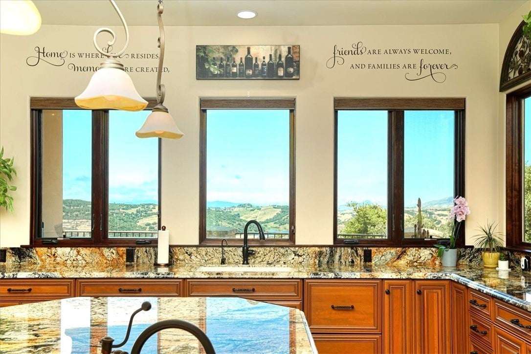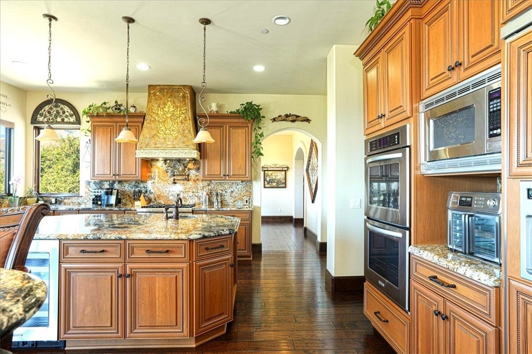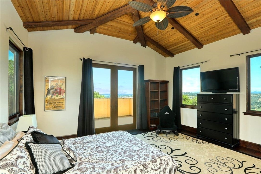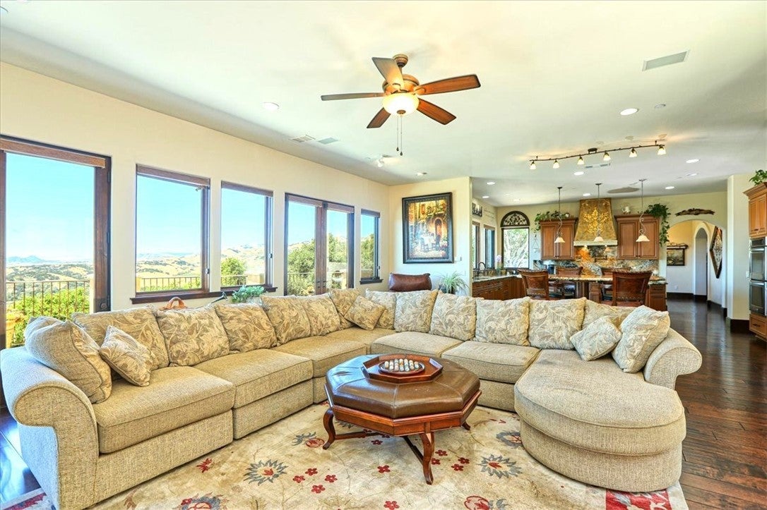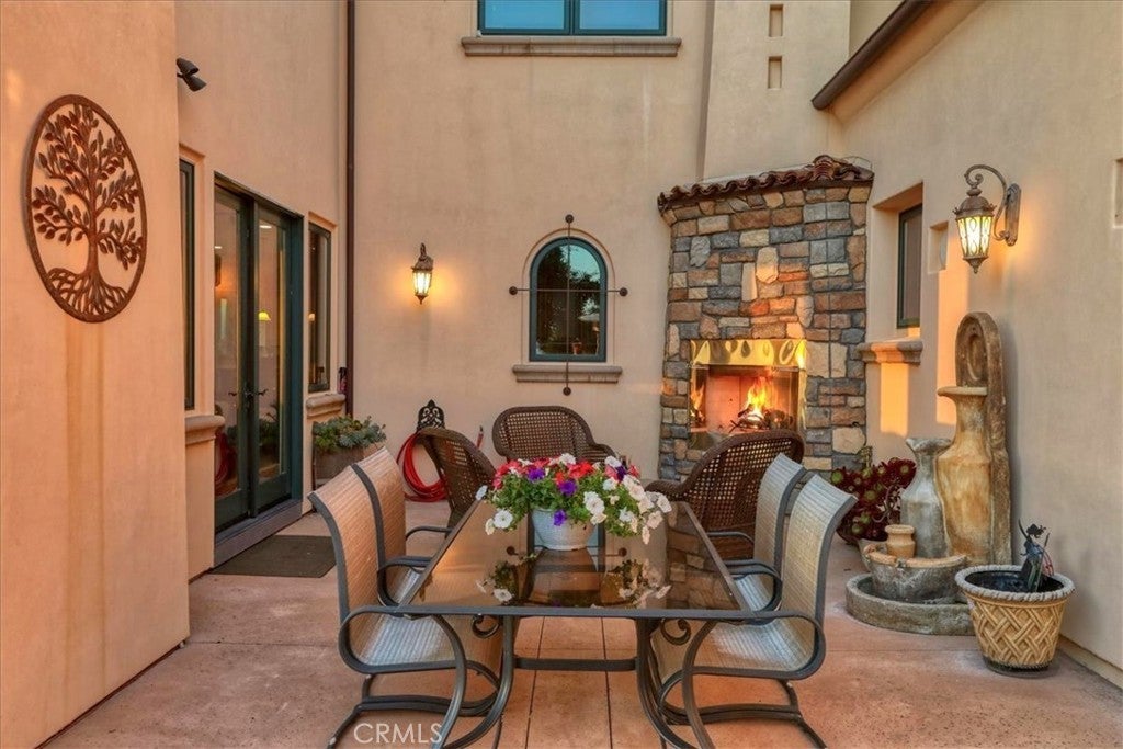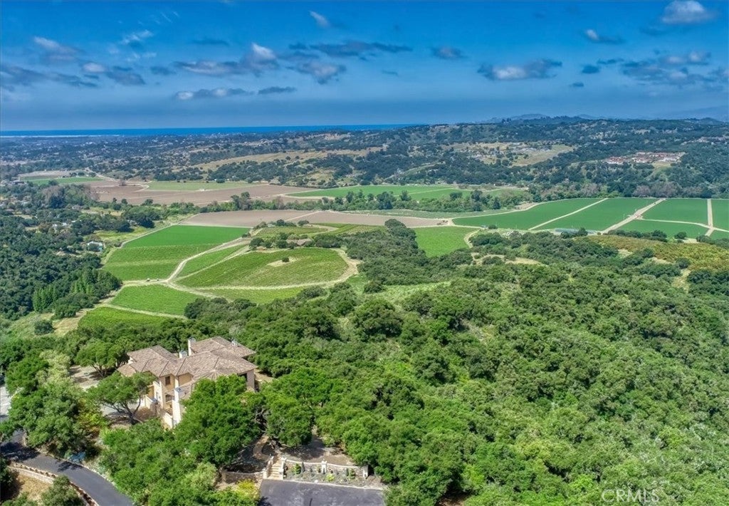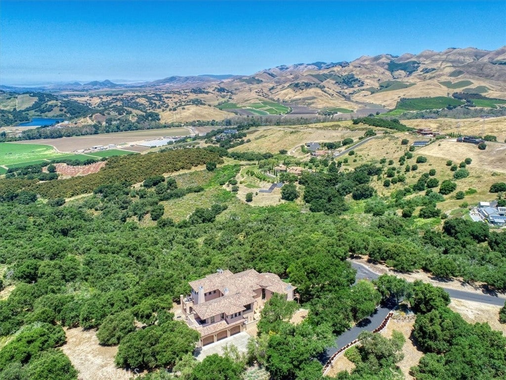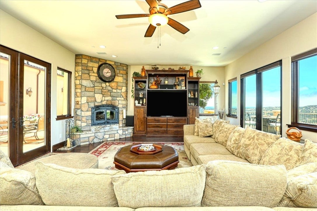 Enjoy the elegance and serenity of this magnificent Tuscan inspired villa that creates a sophisticated yet relaxing atmosphere. Absolutely incredible panoramic views stretch to the Pacific Ocean, the Edna Valley and beyond to the peaks of San Luis Obispo. Entering the home, you will find a welcoming foyer with elevated beam ceiling and beautiful custom wood and iron staircase. The versatile and thoughtfully designed floorplan includes elegant engineered wood flooring throughout the main level and natural wood beamed ceilings. Five fireplaces throughout create an intimate atmosphere. Numerous Jeld–Wen windows provide abundant natural light and outdoor views. On the main level a gourmet kitchen features beautiful natural wood cabinetry with convenient sliding pull out drawers in each cabinet, a Wolf cooktop with custom hand-crafted vent hood, built-in refrigerator, wine fridge, spacious granite counters, and more. The adjoining great room with wood burning fireplace offers access from both sides to outdoor spaces making it ideal for entertaining. On one side, picturesque vistas of the valley, vineyards and ocean await you from the view deck that is over 50’ in length. While on the other side is a protected courtyard with its own fireplace creating a relaxed ambiance to enjoy more views and sunsets. In addition to these amazing outdoor spaces is another courtyard at the southside of the residence that is a perfect place for morning coffee or breakfast as the sun rises above the oak trees. The owner’s suite with its elevated ceiling, fireplace and view deck is a tranquil place to start and end your day. The en-suite bathroom has a separate tub, walk in closet and spacious step-in shower with its own valley and ocean views. There are also two additional guest suites that include their own bathrooms, one with it's own view deck. There is a library, a gym and an office, each with the potential for many other uses or could be converted to additional bedrooms. There is an abundance of storage closets throughout, including two intentionally placed for a future elevator if needed. On the lower level is a 500 sq ft guest studio complete with kitchenette, a full bath, private access and private view deck. There is also a hobby room near the oversized 3 car garage. Surrounded by over 4,500 acres of protected open space, Las Ventanas Ranch is a highly sought after, exclusive custom home community just a few minutes from the Village of Arroyo Grande and San Luis Obispo.
