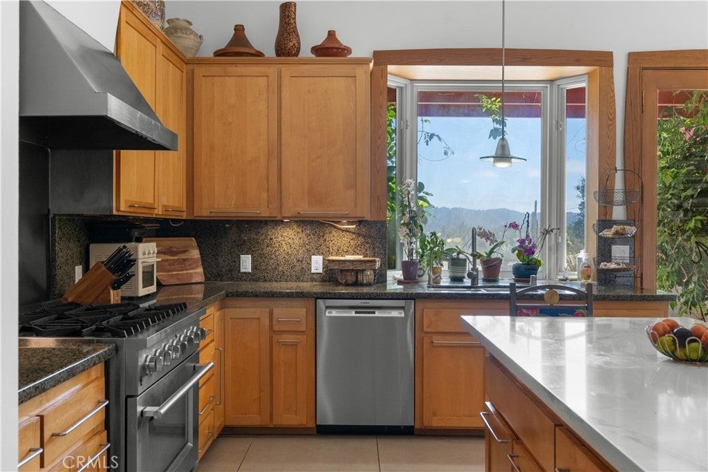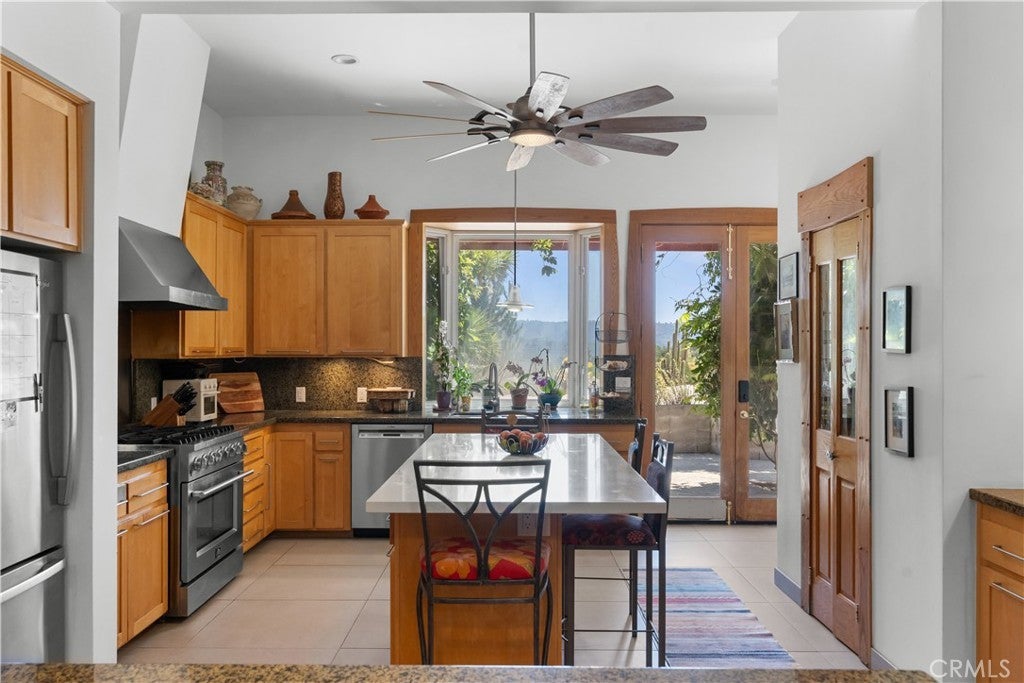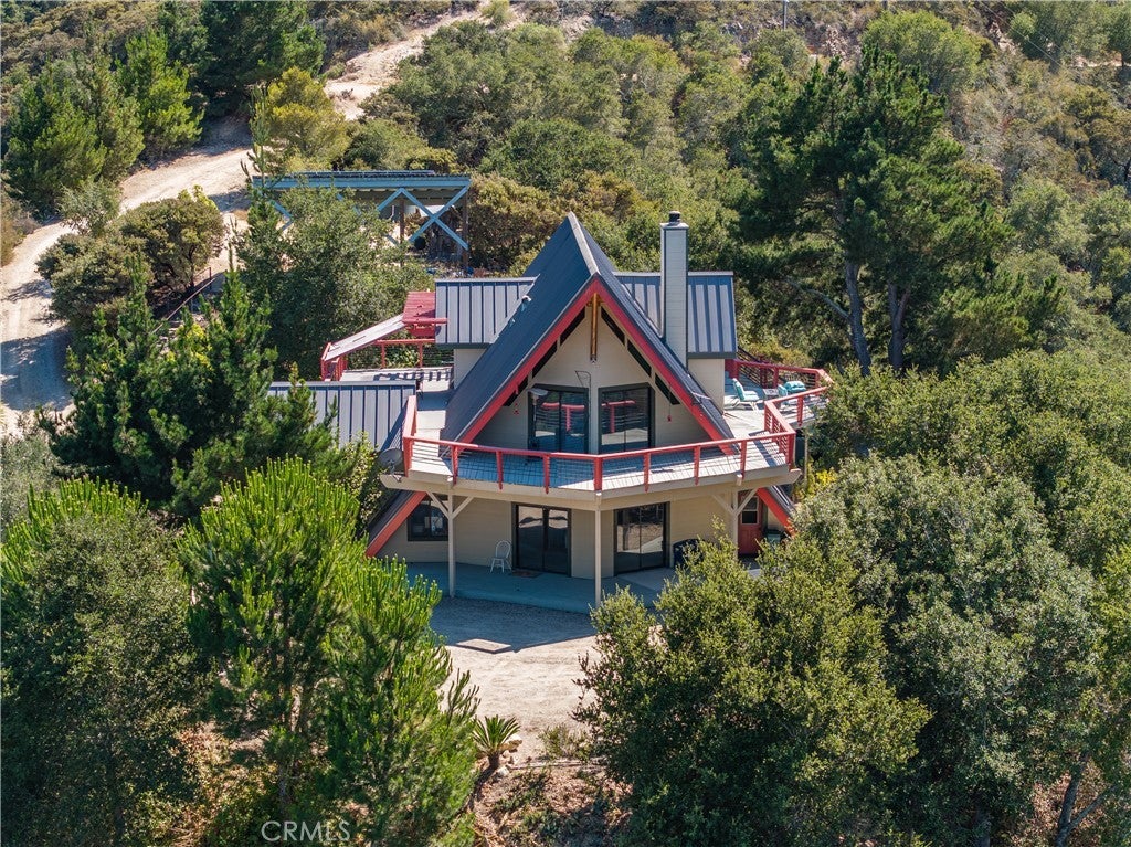 This stunning home is framed with hillside, blue sky, stelar, and sunrise to sunset views from the wrap-around deck, abundant windows, and illuminating skylights. Enjoy this exclusive setting + the architectural and artistic achievement of the home. Upon entering you are struck by the dazzling interior, featuring an expansive great room with an adjoining office, impressive sweeping ceilings and richly-colored walls suitable for a gallery. The kitchen gleams with granite, quartz, and stainless, plus a deep pantry, island/dining bar and additional serving bar shared with and open to the sparkling dining room. The spacious 1st-floor bedroom adjoins a full bath offering the versatility of a 2nd master suite. Attractive porcelain tile throughout the 1st floor is easy to maintain. The staircase and 2nd level flooring are crafted in rich wood with accent inlay. The spectacular master suite highlights magnificent views with glass doors to the extensive deck, and is warmed by a stylish fireplace. A large walk-in closet expands the abundant built-in storage cabinets. The master bath offers heated floors, 2 sinks, and a large dual-head shower. The versatile loft above the master suite is ideal as a library/retreat. There is a corrosion-resistant metal roof, water filtration system, tankless water heater, solar system, a back-up generator, and gracious patio spa. There are 2 residential rentals + barn/garage. one is a 2-BR/1BA manufactured home + a beautiful studio + loft unit w/in the barn. Rentals are at 1010 Upper Los Berros. Water is supplied by 2 wells.