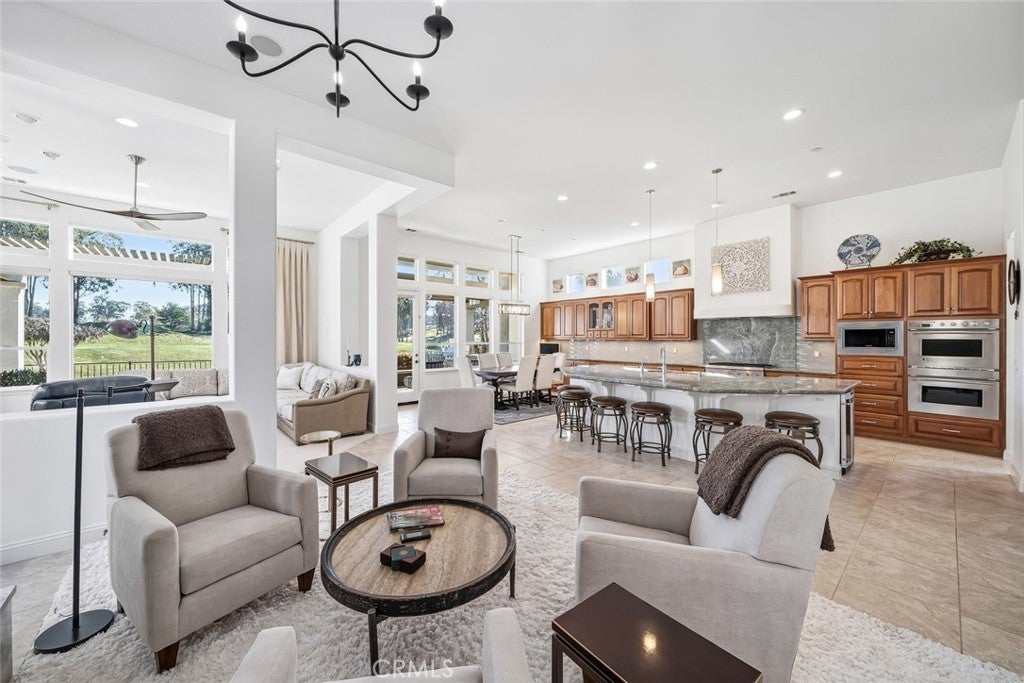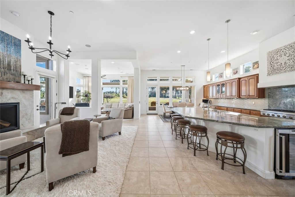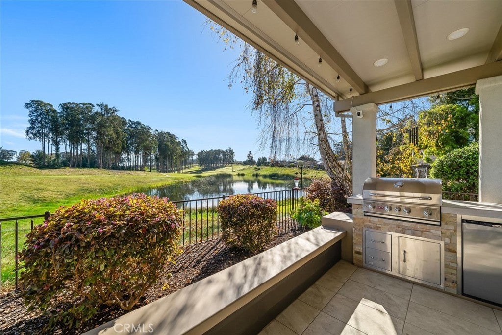 Welcome to a slice of paradise! This exquisite Estate home showcases panoramic views of the pristine 8th hole fairway, tranquil lake, and soaring trees—offering one of Trilogy’s most coveted golf course settings. Enter through the foyer and experience 3,232 sq. ft. of refined living space featuring 12-foot ceilings, transom windows, and an abundance of natural light designed to capture the breathtaking views. This 3-bedroom + den, 3.5-bath, solar home is modern elegance personified, enhanced by over $122,000 in recent improvements. At the heart of the home, the gathering space is anchored by a newly redesigned fireplace, now featuring a Heat & Glo insert and elegantly wrapped in Taj Mahal Leather Quartz, with a custom-built hearth and mantel—creating a stunning focal point for both everyday living and entertaining. The great room flows seamlessly into the sensational kitchen, boasting a Thermador 6-burner professional gas cooktop, stainless steel appliances, wine cooler, butler’s pantry, rich raised-panel cabinetry, glass tile/quartz backsplash, and an expansive island. A spacious dining nook and formal dining room with buffet/display complete the entertaining spaces. Retreat to the luxuriously reimagined primary suite, featuring a spacious bedroom with sitting area, built-in entertainment center, spectacular views, and courtyard access. The remodeled spa-inspired primary bath showcases Cambria Beaumont quartz slab surrounds, a new jetted soaking tub, updated sinks and fixtures, new LVP flooring, and a custom walk-in closet. Automatic blackout blinds elevate comfort and convenience in the bedroom. Step outside and prepare to be awed. The backyard is an entertainer’s dream with breathtaking golf course and lake views, a dramatic triple fountain with bench seating, gas fire pit, modern tile flooring, and pristine landscaping. A newly upgraded insulated Elitewood patio cover enhances year-round outdoor living, while the custom-built BBQ island—complete with gas line, electrical, premium BBQ, and outdoor refrigerator—creates the ultimate al fresco kitchen. Ambient outdoor lighting completes the setting, perfect for evening gatherings. Located on a premiere street in the heart of Trilogy, this extraordinary estate blends luxury, comfort, and resort-style living. Start living your best life in one of the community’s most exceptional homes.