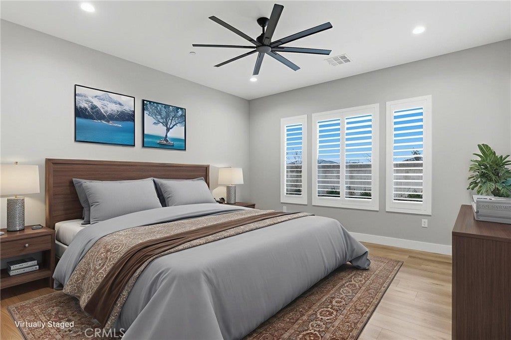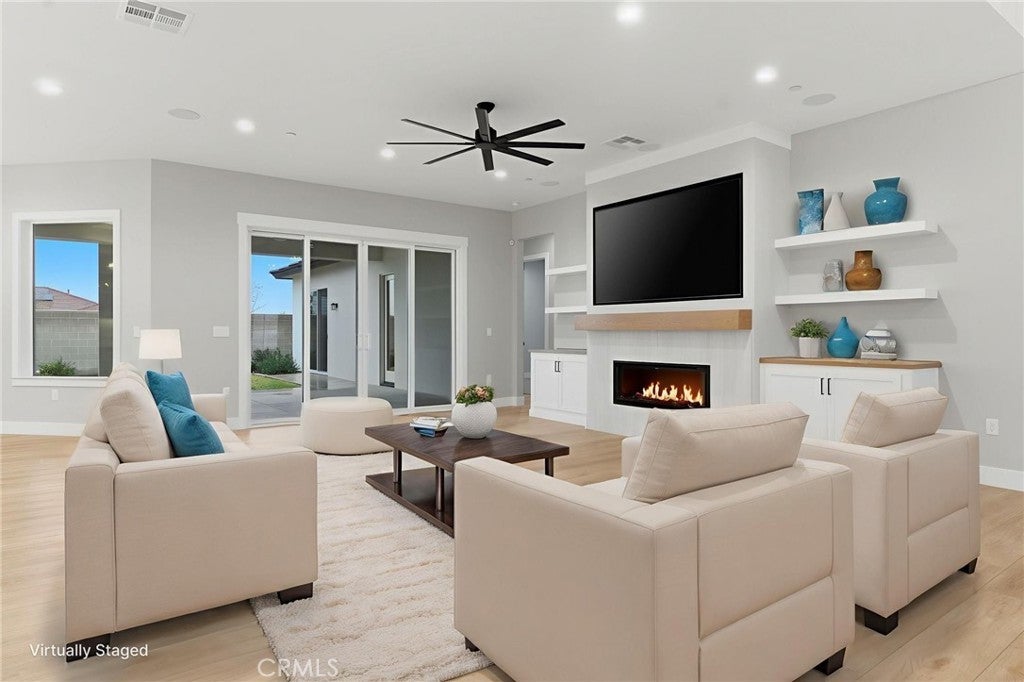 Step into classic modern luxury in the Manorwood Square community by Brian Rice Construction. This former model home offers 4 bedrooms, 2.5 baths, and a spacious game room with an open-concept layout ideal for living and entertaining. The home features a gourmet kitchen with KitchenAid appliances, a custom 36-inch Thermador built-in refrigerator, quartz countertops, and soft-close custom cabinetry. Luxury plank flooring, wood shutters throughout, and a spa-style walk-in shower elevate the design. The great room includes a sleek, flush-mounted 85-inch TV. Situated on a 13,068 sq ft lot, the property offers over 40 feet of concrete pad behind the RV gate, perfect for RV or trailer parking. Owned solar panels add efficiency and long-term value.