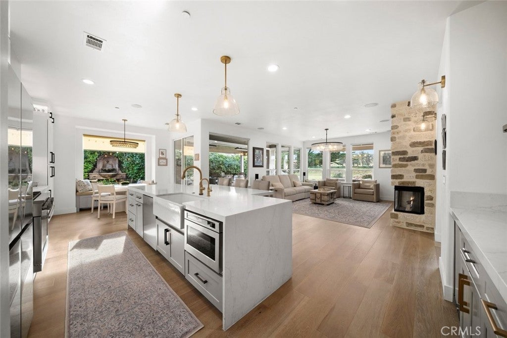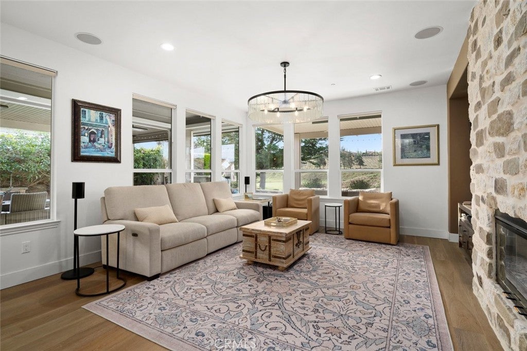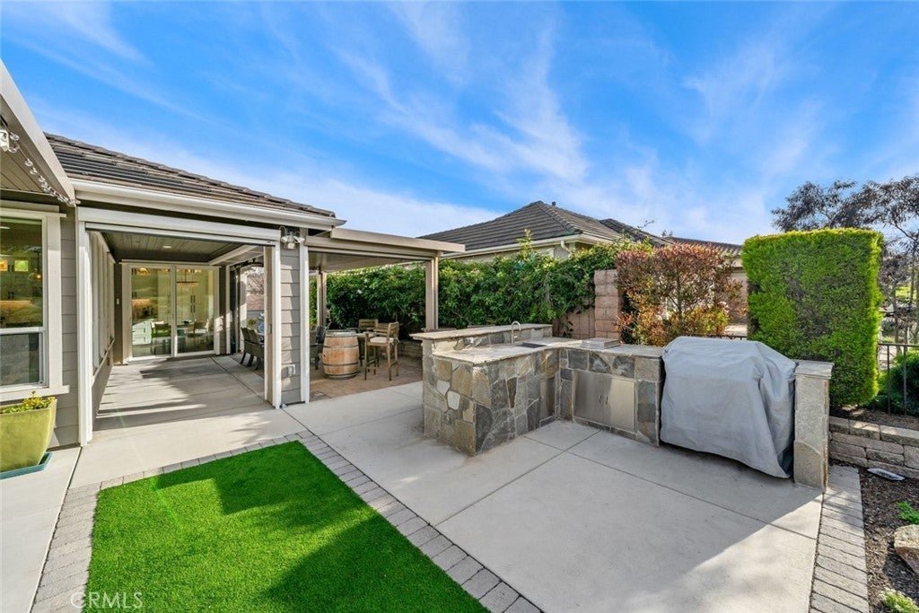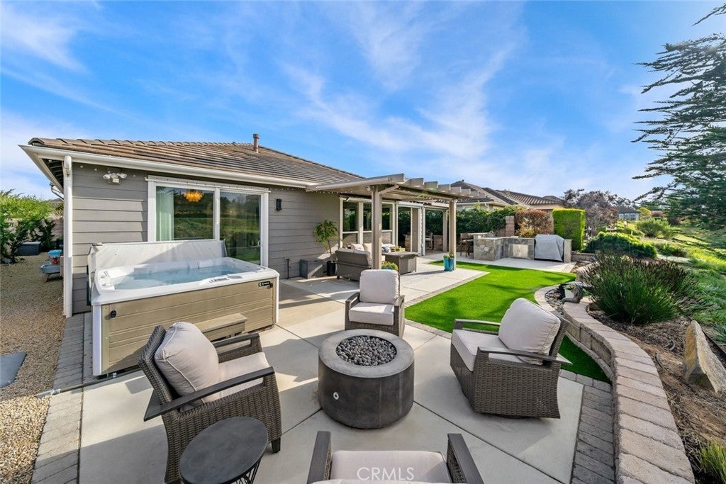 Presenting the Monterey, featuring warm, expansive, south facing views of the 9th hole of The Challenge golf course with its manicured green, serene pond and vineyard backdrop. This 3 bedroom, 2.5 bath home is unlike other Montereys - it’s been completely remodeled with over $275,000 in beautifully innovative and modern designer upgrades. You’ll love the engineered hardwood flooring, custom window treatments, shutters and shades, Pottery Barn light fixtures, new Minka ceiling fans, Serena & Lily wallpaper and brushed gold fixtures throughout. The culinary kitchen is brand new and gorgeous - modern white cabinets that reach to the ceiling with top row lit display fronts, striking quartz waterfall island with storage cabinets, farmhouse sink, quartz countertops, backsplash and range hood for a fresh, seamless look. The chef in you will appreciate the high-end stainless appliances including a GE Monogram 6-burner gas stovetop/oven, lower drawer microwave, dishwasher, Samsung refrigerator, and built-in wine bar/buffet area with wine fridge. A delightful in-kitchen dining space features banquet seating with extra storage, lush garden/fountain view and slider to the outdoor oasis. The great room sports incredible views and an impressive floor-to-ceiling stone fireplace. The backyard is magnificent - a covered patio with 2 extension pergolas, 3 ceiling heaters, 2 motorized screens, a wraparound retaining wall, beautiful low-maintenance landscaping, artificial turf, multiple seating areas, a built-in stone barbecue island with high top seating, fountains, built-in gas fire pit and a 6-person hot tub. Back inside, the owner’s retreat features a large, tastefully designed bedroom with patio/hot tub access and a luxurious en-suite bath with dual sinks, quartz countertop, custom mirrors/lighting, wallpaper, walk-in tile shower with seamless glass enclosure and customized walk-in closet. An equally incredible guest wing includes a bright bedroom, fully-remodeled bath next door, laundry w/innovative half bath addition and a den/flex room with Murphy bed/storage. Add a 2-car garage, plenty of coastal curb appeal and fabulous Trilogy Monarch Dunes resort-style amenities. This home shows like a model and will not last long - call today!