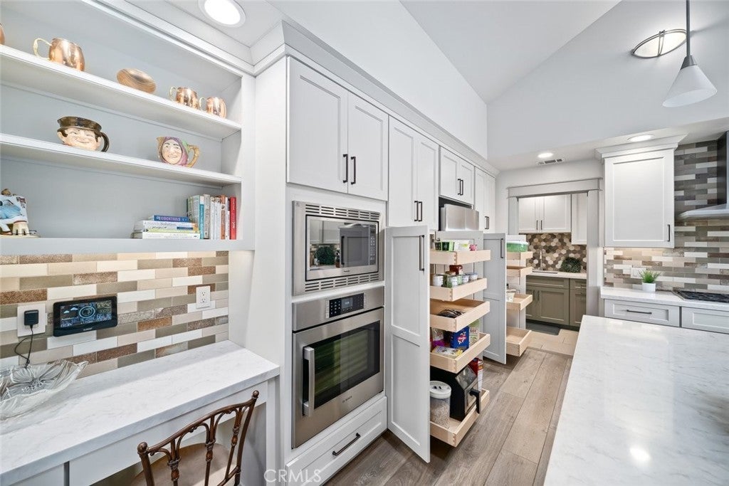 Breakfast Bar, Ceiling Fan(s), Cathedral Ceiling(s), Separate/Formal Dining Room, High Ceilings, Open Floorplan, Pantry, Quartz Counters, Recessed Lighting, Bedroom on Main Level, Instant Hot Water, Primary Suite, Walk-In Pantry, Balcony, Built-in Features, In-Law Floorplan, Paneling/Wainscoting, See Remarks, Storage, Two Story Ceilings, Utility Room