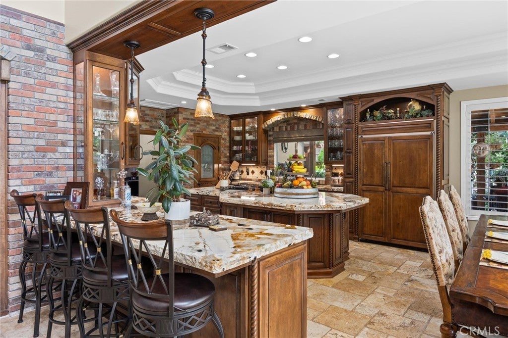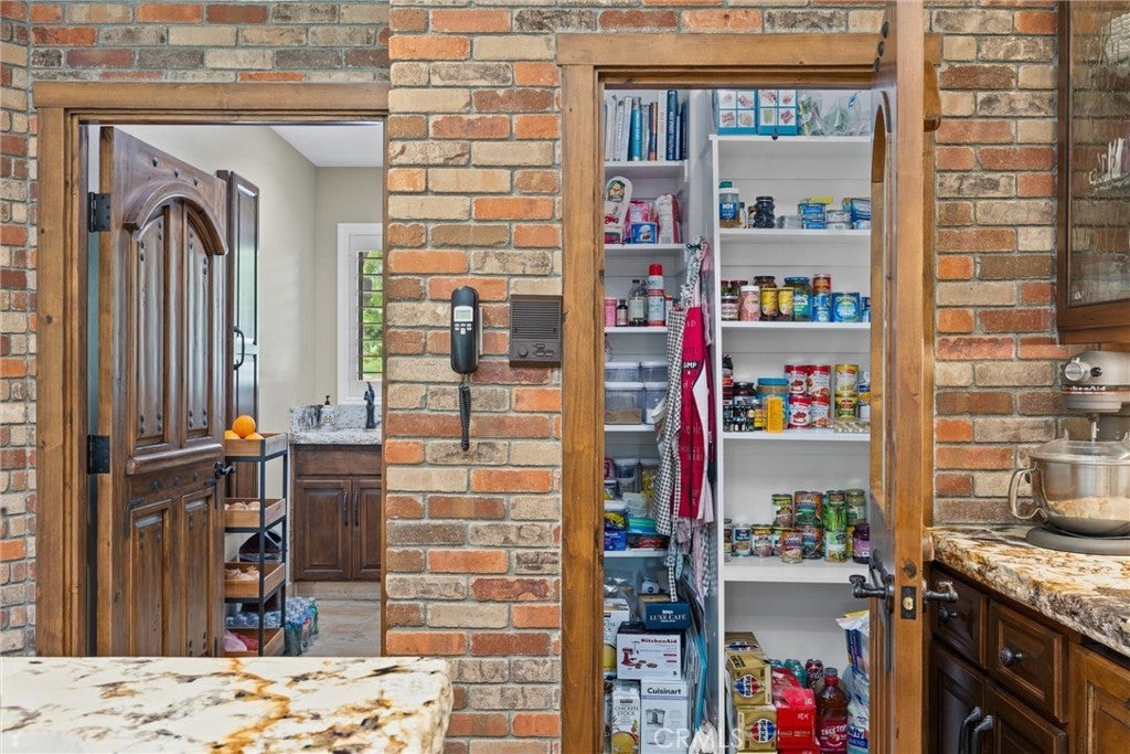 Breakfast Bar, Built-in Features, Balcony, Ceiling Fan(s), Separate/Formal Dining Room, Eat-in Kitchen, Granite Counters, High Ceilings, Living Room Deck Attached, Open Floorplan, Pantry, Pull Down Attic Stairs, Stone Counters, Recessed Lighting, Storage, Wired for Sound, Bedroom on Main Level, Dressing Area, Brick Walls, Central Vacuum, Intercom