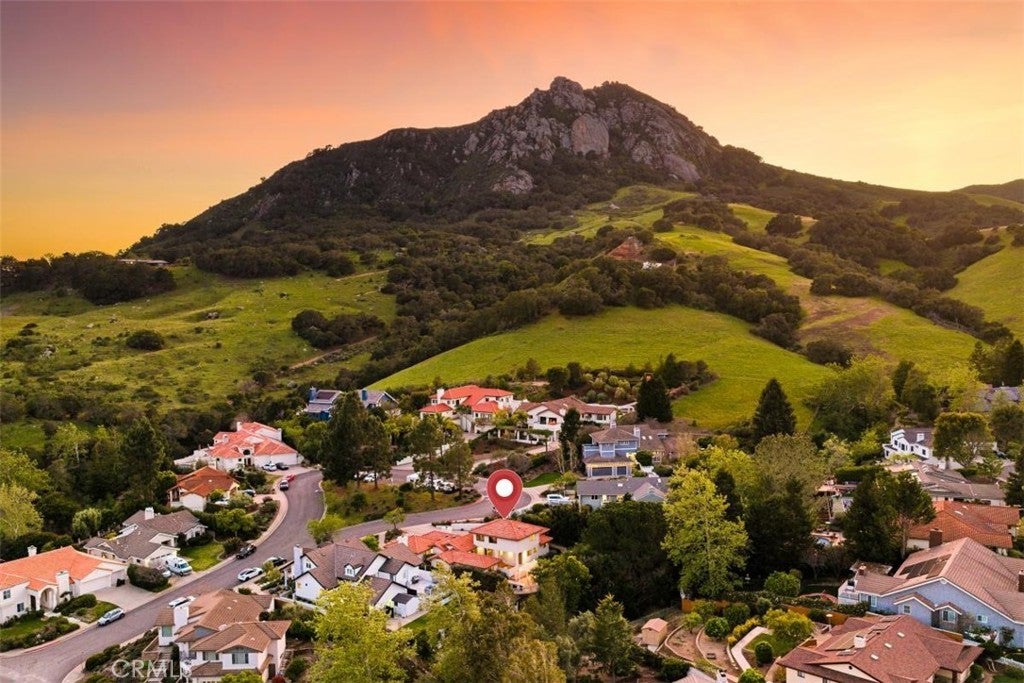 Don’t miss the opportunity to live in the highly desirable Ferrini Heights neighborhood of San Luis Obispo. This spacious approximately 3,200-square-foot home offers a versatile split-level layout with impressive views of Bishop Peak, Cerro San Luis, and the Cal Poly/Cuesta Grade. The home features two bedrooms and a full bathroom on the lower level, while the private primary suite upstairs includes a walk-in closet, full bathroom, and sweeping mountain views. On the main level, just off the entry hall, you’ll find a convenient half bathroom and a large flexible room that can serve as a parlor, office, bedroom, or family room. The living and dining areas flow naturally toward the kitchen with quartz countertops and a welcoming breakfast nook or reading area. Toward the back of the home are a pantry/storage room, three-quarter bathroom, laundry room, hobby rooms, and direct access to the attached two-car garage. Attractive laminate flooring and tile are found throughout. Comfort is ensured year-round with like-new central heating and air conditioning, along with two gas/wood-burning fireplaces. Central vacuum ports are installed throughout the home. Outside, the front and backyards have been professionally landscaped with automatic sprinklers, drip irrigation, and lighting. The front yard offers inviting sitting areas where you can enjoy sunrise views of Bishop Peak, with the trailhead located just half a block away. The backyard is designed for relaxing and entertaining with two sets of sliding doors opening to the patio and outdoor living areas. A custom-built barbecue station includes a sink, storage, small refrigerator, and large granite countertop. Enjoy meals under the shaded pergola that wipes clean with no need to paint. The lower backyard includes storage sheds and mature fruit-bearing avocado, orange, and lime trees. During the rainy season frogs can be heard in the small creek beyond the fully fenced yard, while birds and squirrels are year-round companions in this peaceful natural setting. Owned solar panels are included. Situated on a .28-acre lot in a quiet, friendly cul-de-sac with a pine-shaded parking area, the home is also close to local elementary schools and Cal Poly.