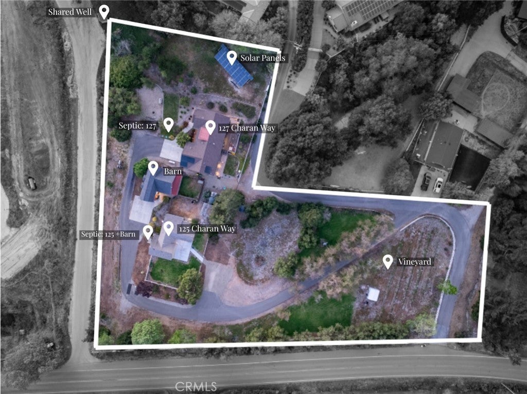 Introducing "Sonterra Estates" — a rare, refined multi-residence property blending timeless character, modern comfort, and rural sophistication. Set on a peaceful parcel on the outskirts of Arroyo Grande, this thoughtfully designed property offers two independent homes, a barn, and curated outdoor spaces that balance connection, flexibility, and everyday ease. Whether envisioned for multi-generational living, a private retreat, or income potential, "Sonterra Estates" delivers a lifestyle rooted in comfort and possibility. The newer residence at 127 Charan Way (built in 2008) is a light-filled 2-bedroom, 1-bath home spanning approximately 926 sq ft. Vaulted ceilings, skylights, and expansive windows create an airy, open-concept living space anchored by a fireplace. The kitchen features a center island, breakfast bar seating, stone tile backsplash, built-in appliances, and generous cabinetry, plus a built-in desk. The primary suite offers vaulted ceilings, ample storage, and a private en-suite, while a secondary bedroom provides flexibility. A fenced deck off the kitchen overlooks a private yard with a grassy area and stone walkway, plus a separate firepit space. An oversized 800 sq ft garage with an upper-level loft adds versatility—ideal for an office, studio, or workspace. The original residence at 125 Charan Way (built in 1900) offers 3 bedrooms and 1 bath across approximately 1,168 sq ft, blending historic character with everyday comfort. Natural light fills the living spaces, while the kitchen includes a breakfast bar, built-in storage, and a dedicated dining area. Bedrooms are well-sized, and a separate laundry area adds convenience. A fully fenced yard provides privacy and space to garden, relax, or entertain. The grounds feature a 798 sq ft barn with utilities, two storage sheds, and a small collection of grapevines alongside mature fig and apple trees—adding subtle countryside charm. Additional highlights include leased solar servicing both homes and the barn, plus two separate septic systems supporting independent functionality. Located minutes from Arroyo Grande Village and Highway 101, Sonterra Estates offers a rare balance of privacy and accessibility—close to dining, shopping, and Central Coast amenities while maintaining a peaceful, estate-like setting.