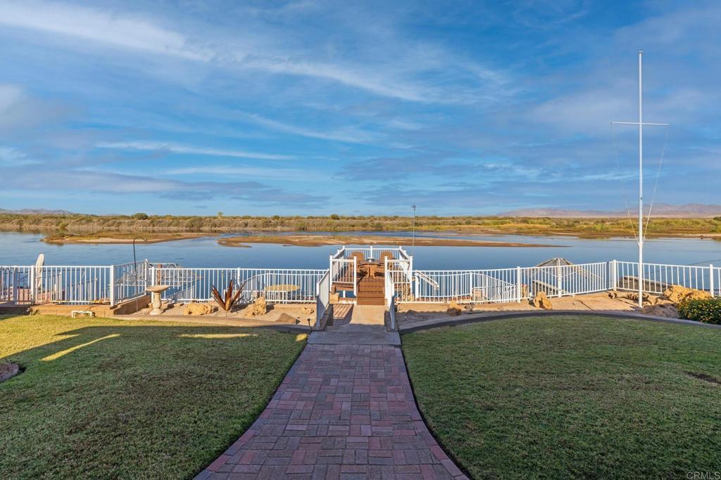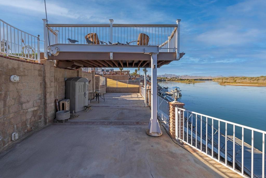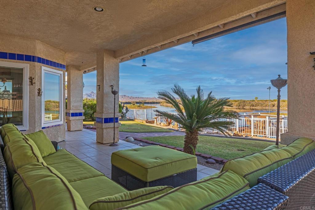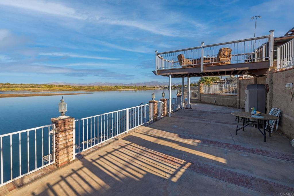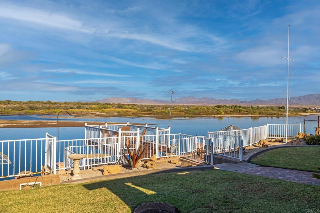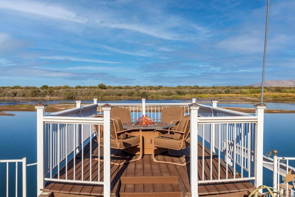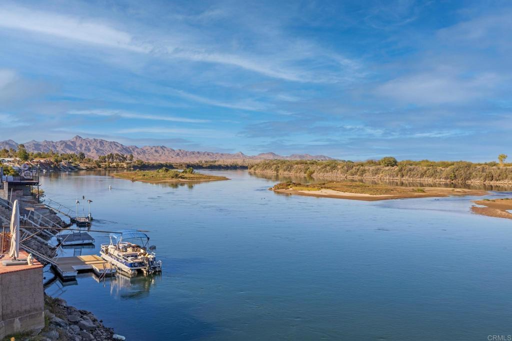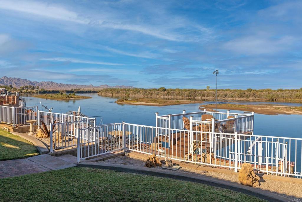 Welcome to your private riverfront oasis — where stunning panoramic views, thoughtful design, and ultimate comfort come together in perfect harmony. Tucked behind a secure gated entry, this beautifully crafted home is positioned to capture breathtaking 180° views of the Colorado River and distant mountains. A long, private concrete drive leads to an oversized detached garage, ideal for storing boats, jet skis, desert toys — or converting into a workshop or casita. The fully fenced property features professionally finished landscaping, irrigation, and hardscaping, offering a clean, low-maintenance exterior that’s ready to enjoy. Step inside to soaring vaulted ceilings and an open-concept living space bathed in natural light, thanks to large newer double-pane vinyl windows. The kitchen is both functional and welcoming, with ample cabinetry, expansive countertops, and a bar-height seating area perfect for entertaining. Wake up to water views in the spacious primary suite, which features a sliding glass door with direct access to the backyard and patio. Whether you’re hosting guests or enjoying a quiet morning coffee, the covered patio and terraced backyard offer multiple areas to unwind — including a cozy elevated deck with propane fire pit right near the water’s edge. Head down to the lower terrace, complete with a private outdoor shower, shaded seating area, and direct access to your private dock — perfect for launching into river adventures. Additional highlights include: • Two RV parking spaces with full hookups • Completely move-in ready and sold fully furnished • Ideal for full-time living, a weekend retreat, or short-term rental potential This is more than a home — it’s a lifestyle. Live your best life on the river, where every day feels like a getaway.