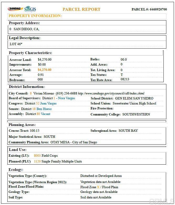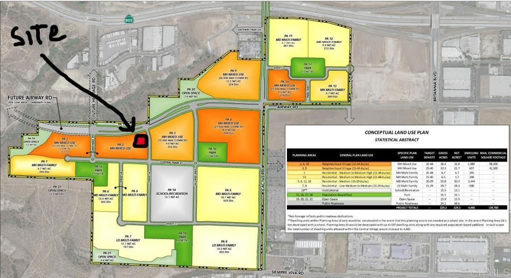 Prime Land for Sale, Incredible Opportunity! Vacant Land Parcel adjacent to Otay Mesa Central Village. Great investment in the New "Otay Central Village" Development zone. Level Lot. 39,640 S/F (.91 Acres) Lot 46 APN# 646-092-07-00. Zoned CC-3-6. This allows for "development with a high intensity, pedestrian orientation and permits a maximum density of 1 dwelling unit for each 1,000 square feet of lot area" allowing around 40 units for development, Mixed use, Commercial, etc.. Additional Permitted Uses include: Parking, Retail Sales, Groceries, Food & Beverage, bars, restaurants, offices and much more... Street access within 200' of property (see arrow in image). Seller 'may' carry note.