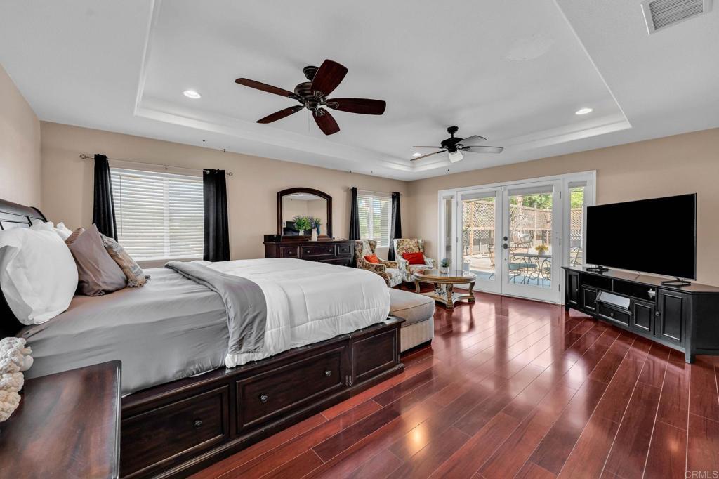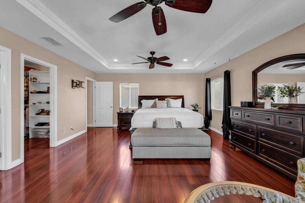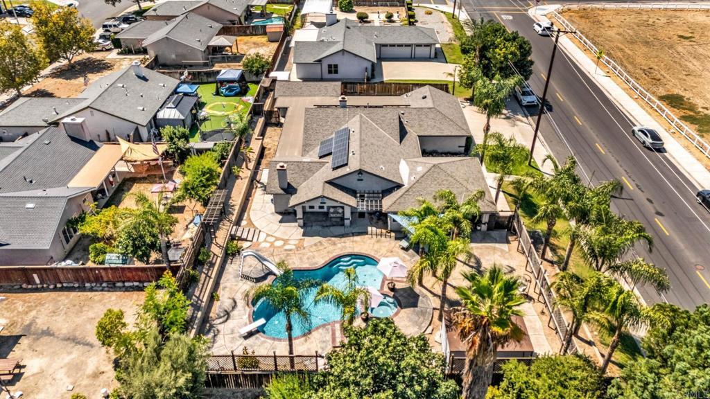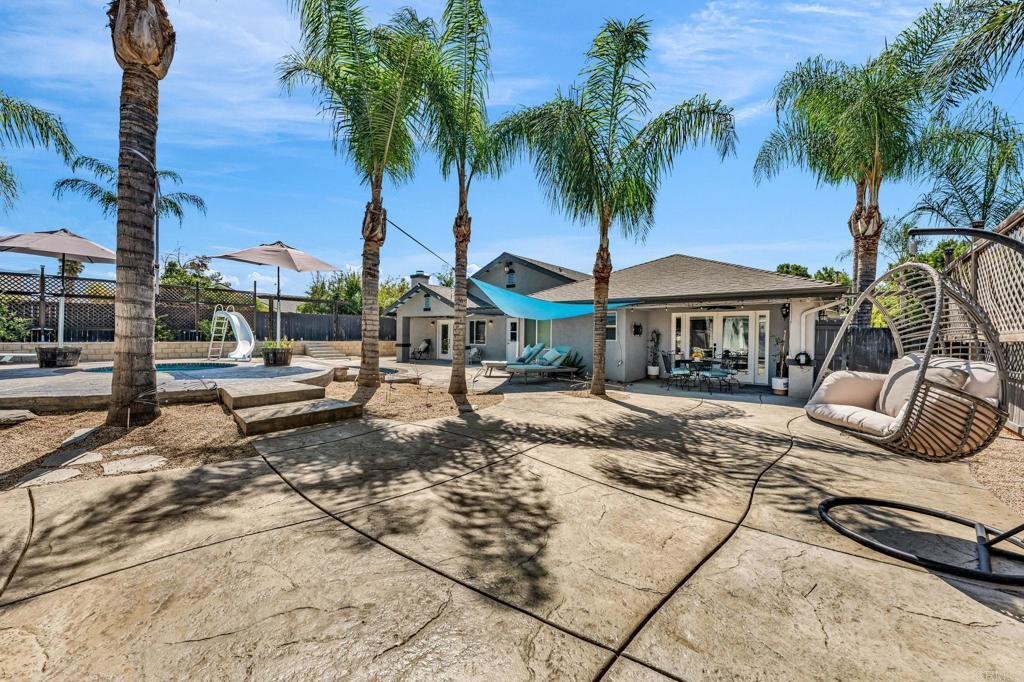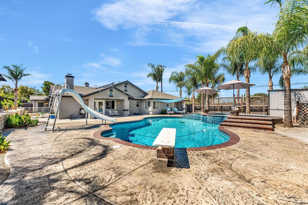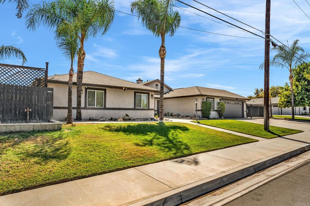 RESORT -STYLE LVING ON .35 ACRE! Welcome to your own private retreat! This stunning home sits on over a third of an acre and is designed for comfort, entertainment, and true California living. Outdoor Oasis, sparkling pool with slide, Hot tub, jumping board, water fountain and two shell waterspouts. Stamped concrete. Pool: custom art designs decorative touches throughout. Plus, pool lights. Outdoor: Patio by Principal Suite: boats, fan, tv hookup, surround system, refreshing water mist Perfect for entertaining. Outlet for holiday lights all around the house. 5 bedrooms, including the two primary suites. The main suite features French door to the pool, walk-in-closet, luxurious bath with jetted tub, dual vanities, make -up vanity. Suite boats an elegant architectural ceiling design. Fans, recessed lighting and its own Private entrance. Second Suite boats its own bathroom with tub & shower and a private entrance. Detached garage can be converted to an ADU. RV or Boat Parking. Iron gate. 14 Queen Palms. Back yard, Retaining wall. Dog run gates. 18 security camaras will stay. Kitchen, many outlets never suffer looking for one. Plenty of storage, space for a trash compactor, New Kitchen water faucet, double dishwasher, Stainless steel appliances. Two fireplaces, one in dining room and second in the beautiful living room, Spacious, High ceilings, fans, surround system connection. Gas fireplace, Pergo floors, Double pane French doors, with blinds. Most window have shutter window covers. Water heater new with overflow tank. 37 PAID, solar panels & two back up batteries. Seller upgraded the pool. Chimneys serviced and repair gas connections, house boast drainage all around the property. New shower spout and shower head in principle suite. Two AC units and two control for each section of the house. Rain Gutters. Many other details that you need to come and see in your future beautiful home. "Seller willing to help buyer with interest rate buy down"