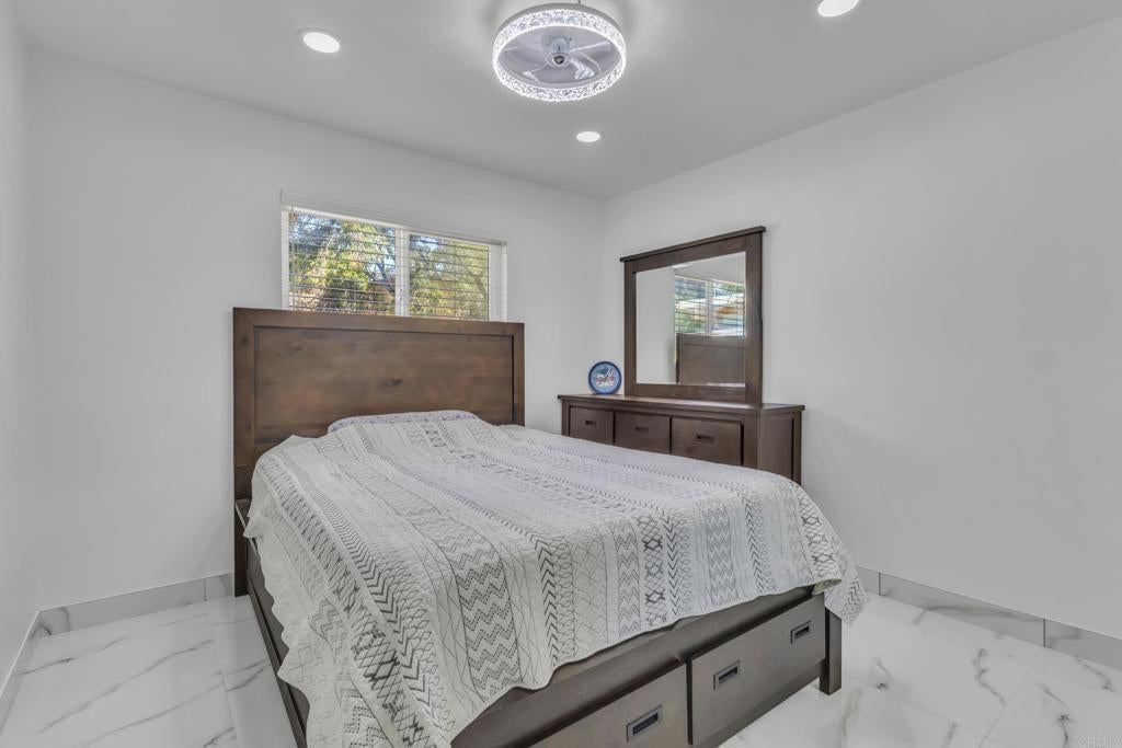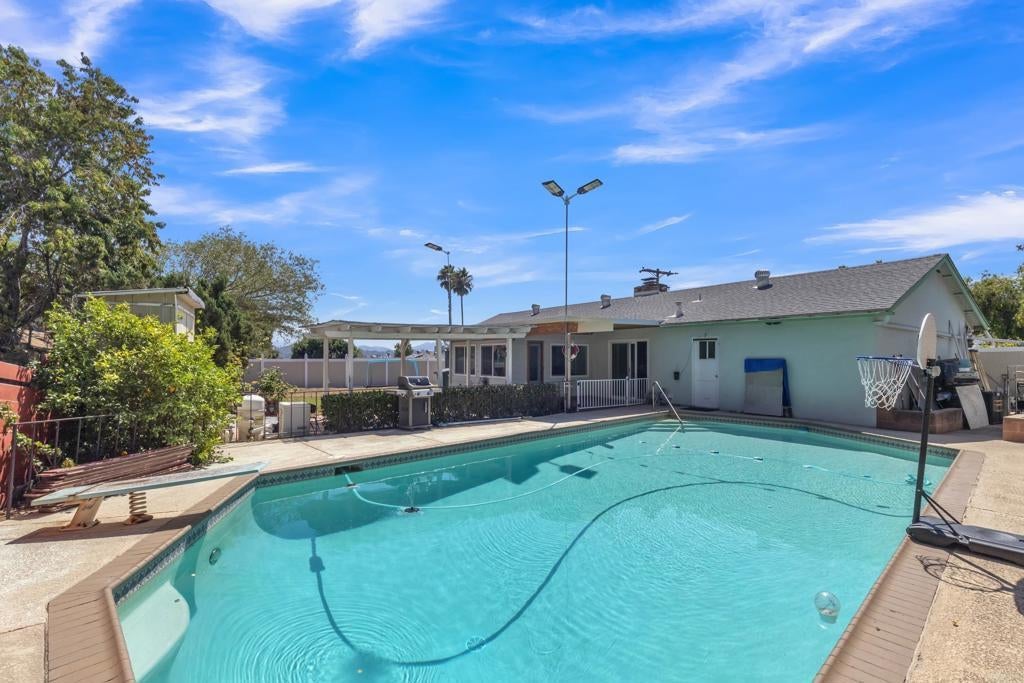 Welcome to 1545 Meadow Rd, El Cajon, CA 92021. Step inside to gorgeous tile flooring throughout and fresh interior paint, complemented by classic kitchen cabinets (installed in 2021) and a newer stove. The home features updated electrical wiring with LED lighting throughout, six LED chandeliers with fans and remote controls, an Energy Star whole-house fan, auto shut-off bathroom vent fans and heaters, newer windows, a newer AC system, a newer boiler, and updated attic insulation. Step outside to your beautiful backyard with a low-maintenance, gas-heated pool, solar lights with auto dusk-to-dawn sensors, four storage sheds, and established grape, lemon, and mandarin fruit trees—plus plenty of space to plant your own fruits and vegetables. The front yard is fully landscaped with artificial grass, a new retaining wall, and a paver walkway. There are also new fences with key-lock gates. The fully remodeled 2-car garage includes attic storage with pull-down stairs and a new insulated door with a quiet side-mount motor. The large backyard offers great potential for expansion or an ADU. This home is move-in ready and waiting for you to make it your own!