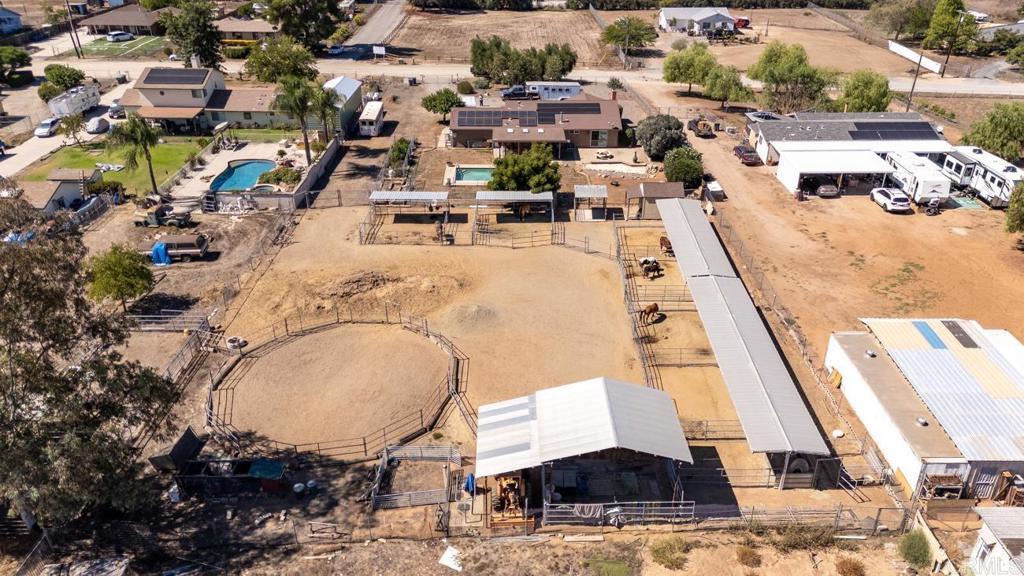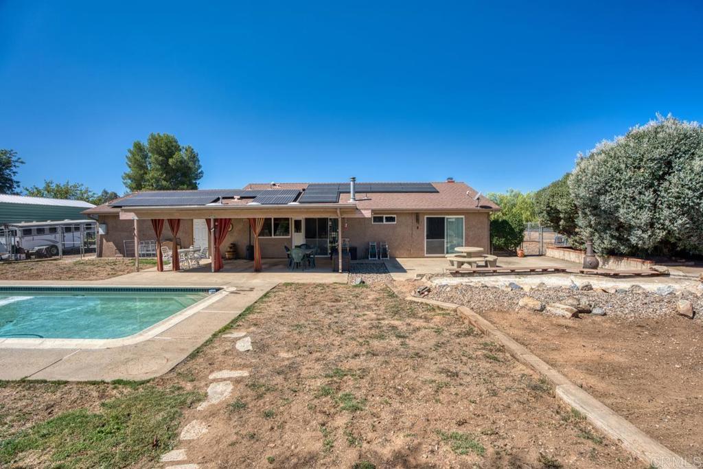 PRICE IMPROVEMENT!! Motivated Seller!! Welcome to this beautifully upgraded property, thoughtfully designed for comfortable living and equestrian, or animal use. This ranch-style setting home combines modern amenities, energy efficiency, and extensive outdoor features. Inside, the home boasts custom-built bathroom cabinetry with maximum storage, and elegant travertine countertops. The kitchen is enhanced with granite tile counters, a brand-new refrigerator, microwave, and a spacious pantry complete with ShelfGenie pull-out drawers and organizers. Dual-paned windows, a whole house vacuum system, a newer water heater, a new heater, and a Mirantec garage door opener with a newer garage door ensure both comfort and efficiency. Energy features include 26 solar panels, 2 Tesla Power walls, a Tesla EV charger, and a new Lopi wood-burning stove, offering sustainable living without compromise. A home security system also adds peace of mind. Outdoors, the property is fully fenced and cross-fenced with a powered front gate. Equestrian enthusiasts will love the impressive 108-ft steel beam custom horse structure, 6 oversized 24x24 corrals, an additional 12x24, a 54-ft round pen for exercising, 2 wash racks/grooming stalls, and a hay barn with electricity. A 12x10 wood shed/tack room adds convenience. The backyard is perfect for entertaining or relaxing, featuring a covered patio, a sparkling in ground-ground pool with a new upgraded variable-speed pump, and raised garden beds for your seasonal plantings. Mature fruit trees—olive, grapefruit, lemon, tangerine, lime, avocado—and blackberry vines provide an abundance of fresh produce right at home. There is all new insulation in the attic, along with an attic fan to help keep the house cool. There is plumbing that extends throughout the property, making every corner functional. This unique property offers a rare combination of modern upgrades, energy independence, and equestrian amenities, creating a private retreat with everything you need.