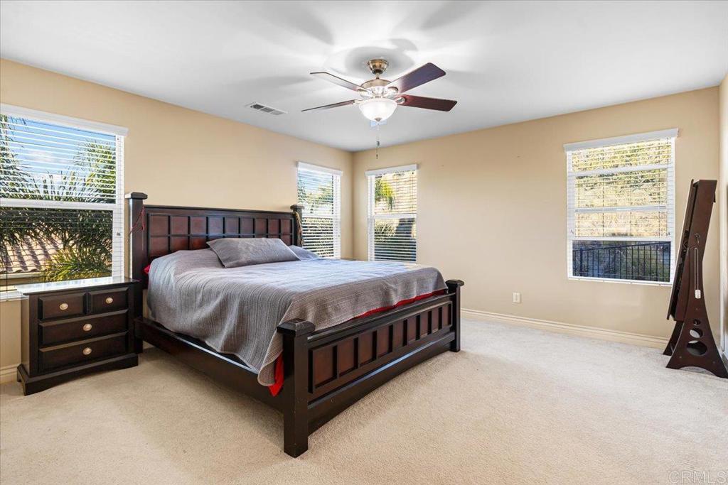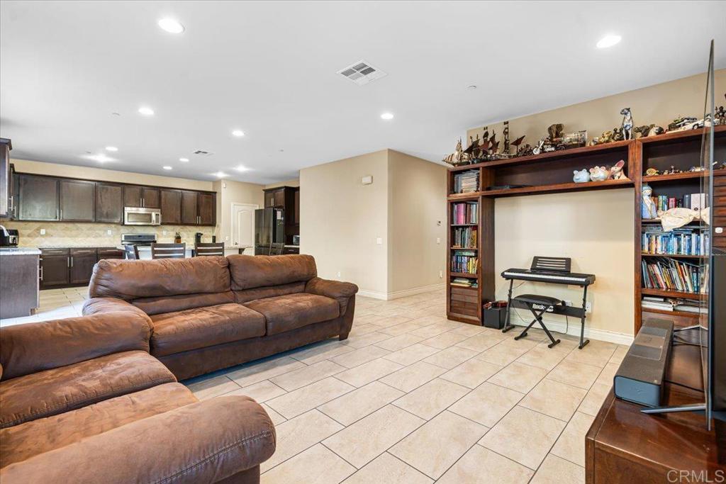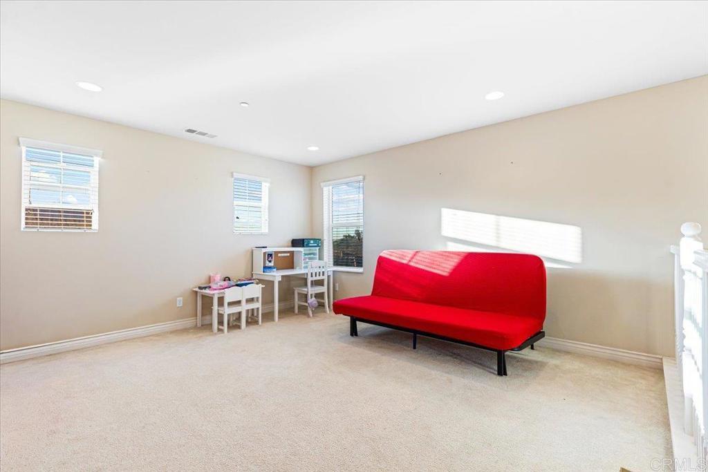 Welcome to this beautifully maintained 4-bedroom, 3-bath home in the desirable Rancho Santalina community of San Marcos! Built in 2013, this spacious 2,376 sq ft residence features an open-concept floor plan with a bright great room, modern kitchen with granite counters, stainless-steel appliances, and a large center island—perfect for entertaining. The downstairs bedroom and full bath are ideal for guests or a home office. Upstairs offers a generous loft, convenient laundry room, and a luxurious primary suite with a walk-in closet and spa-like bath. Energy-efficient with owned solar and dual-zone HVAC. Enjoy outdoor living with a private, low-maintenance backyard featuring paver patio, mature landscaping, and no rear neighbors. Located near top-rated schools, parks, and shopping with easy freeway access. Low HOA, move-in ready and beautifully upgraded throughout!