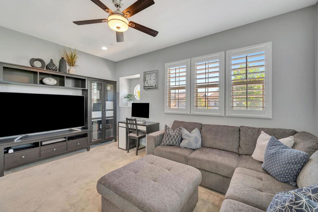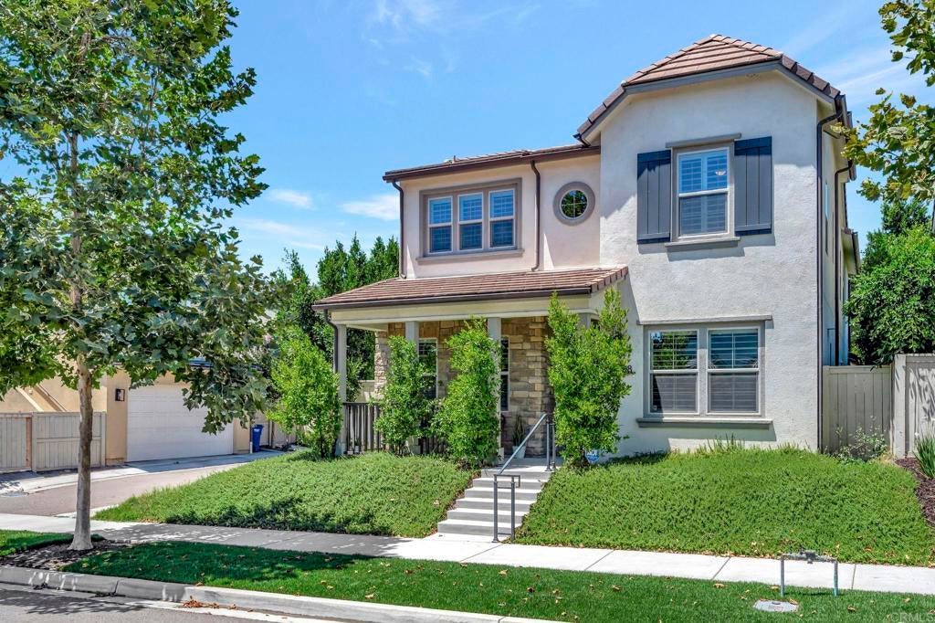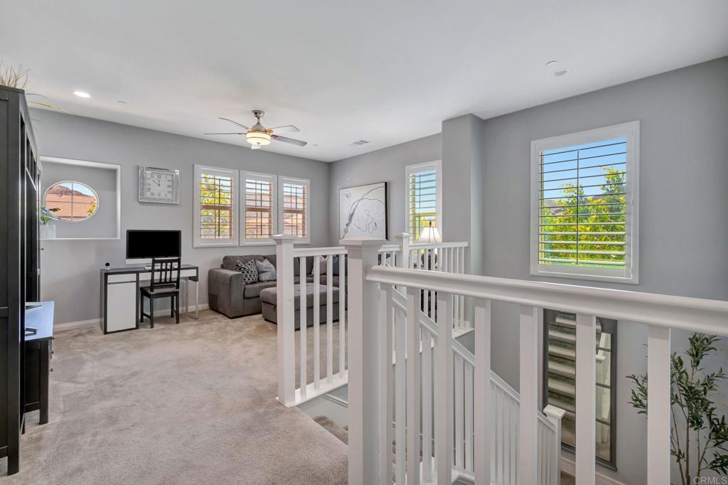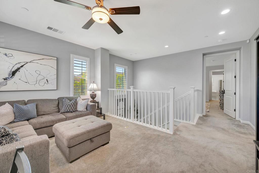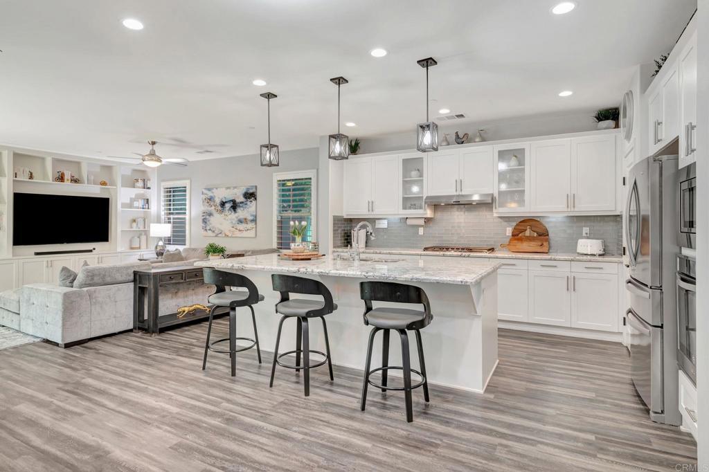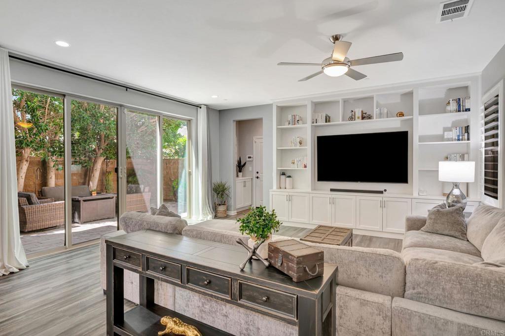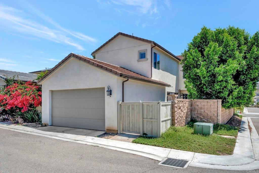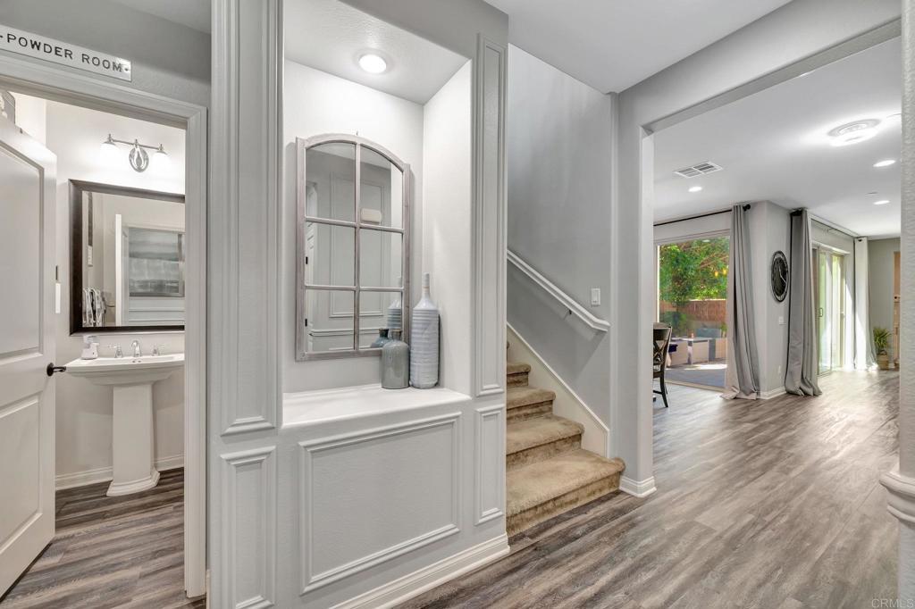 End lot Seabreeze neighborhood home in Harmony Grove Village has 4 bedrooms, 3.5 bathrooms and features multiple built-ins, picture frame wainscoting, accent walls, and upgraded flooring throughout. The flexible floor plan includes a first-level bedroom with an attached private bathroom, a dedicated office with a walk-in closet, an upstairs loft, and thoughtful storage nooks. Additional highlights include owned solar, plantation shutters, a chef’s kitchen with granite countertops & stainless appliances, built-in media center, tankless water heater, a low-maintenance backyard with pavers, and a spacious primary suite. The kitchen is a true standout, featuring updated flooring, white cabinetry with two upper cabinets showcasing glass-front doors, granite countertops, and a large center island with seating. Additional upgrades include a full custom tile backsplash, under cabinet lights, stainless steel appliances, pendant lighting, and pull-out trash receptacles. The kitchen opens to a bright dining area accented with wainscoting and windows that bring in abundant natural light. Sliding glass doors lead directly to the backyard, creating a seamless indoor-outdoor connection. Throughout the main level, you’ll find elegant picture frame wainscoting, updated flooring, and custom millwork. A stylish hallway nook with a built-in ledge and arched mirror provides visual interest and display space. The powder room is conveniently located and finished with modern upgrades. The family room includes a built-in entertainment system with shelving and lower cabinet storage, a ceiling fan, and plenty of space for comfortable seating. The adjacent paved backyard is low maintenance and ideal for outdoor entertaining or relaxing, with multiple areas for seating and easy access from the main living area. The versatile first-level office offers a picture frame wainscoting accent wall, plantation shutters, updated flooring, and a walk-in closet. The first-level bedroom features a custom wood-paneled wall, plantation shutters, a closet with wood sliding doors, and an attached private bathroom with custom tile backsplash, updated fixtures, and a floor-to-ceiling tile shower with frosted glass doors. Upstairs, the spacious loft offers flexibility for a second living area, office, or media room and includes recessed lighting, a ceiling fan, and a charming round window in a custom-cut nook. Additional upstairs bedrooms include ceiling fans, plantation shutters, and closets with sliding wood doors. A built-in storage nook with storage cabinets adds function to the upper hallway. The upstairs bathroom features white countertops, a custom tile backsplash, an extra-large mirror, and a shower/tub combo. The upstairs laundry room is fully equipped with upper and lower cabinetry and multiple hanging racks for added convenience. The primary suite features a ceiling fan, plantation shutters, a built-in shelving nook with lower storage, and accent wall. The en-suite bathroom includes dual sinks, tile backsplash, a wall-to-wall mirror, a soaking tub, a walk-in tile shower with bench seating and glass doors, a private toilet room, and a spacious walk-in closet with recessed lighting. Harmony Grove Village is a master planned community with gorgeous mountain ridgeline views, multipurpose trails, gated pool for homeowners, multiple private parks and huge 4th of July Park (open to the public). The Grove is the perfect place to enjoy the outdoors- it includes the pool, jacuzzi, wading pool, barbeques, shaded tables, play structure and a covered lounge area with outdoor furniture and fireplace.