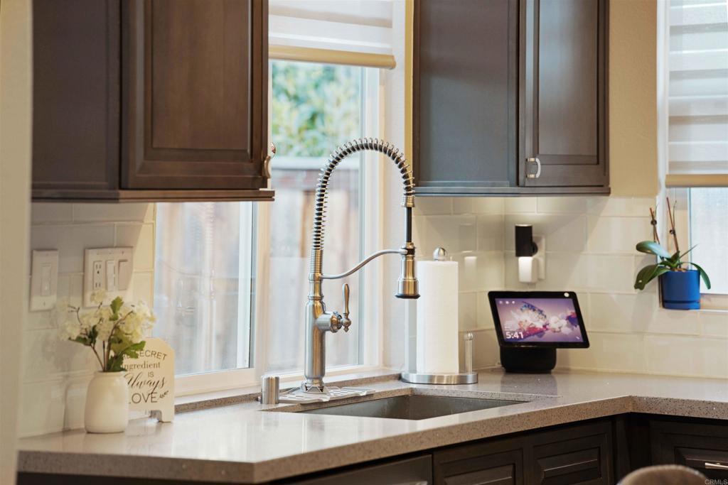 Move right into this fully upgraded 5-bed/4-bath dream home, featuring a full bed/bath downstairs ideal for guests or an office. The home boasts elegant new finishes, including a remodeled kitchen with new cabinets, quartz countertops, and LG stainless steel appliances, stylish tile flooring downstairs, and dual-paned windows with shutters throughout. The upstairs includes a dedicated laundry room, a luxurious Primary Suite with a large walk-in closet, a second bedroom with its own full bathroom, and two other bedrooms with shared bath. The exterior offers low-maintenance luxury with artificial turf, a fantastic outdoor kitchen for entertaining, and a charming side house courtyard off the main hall entryway, all complemented by a 3-car garage with storage and the massive benefit of a PAID 20 panel SOLAR System and Water Softener System!