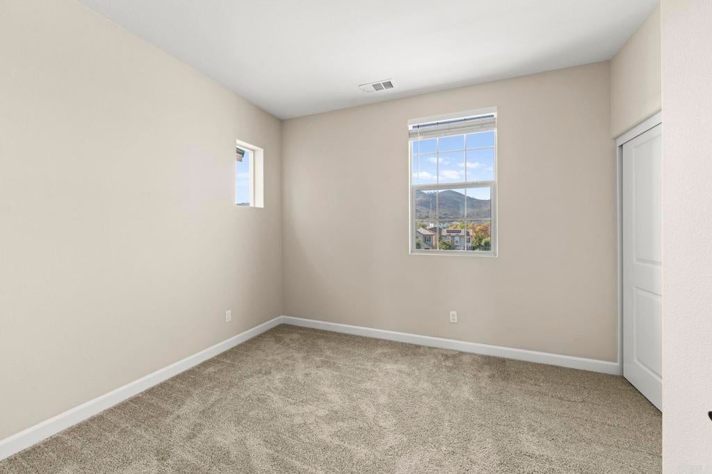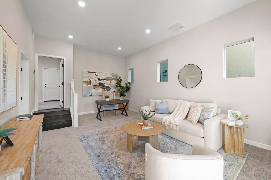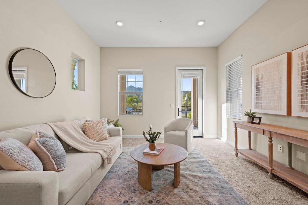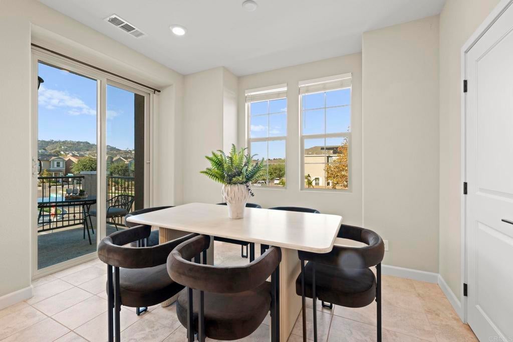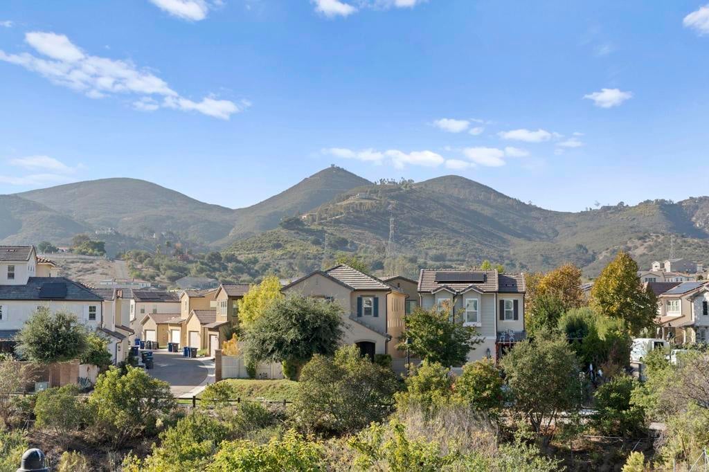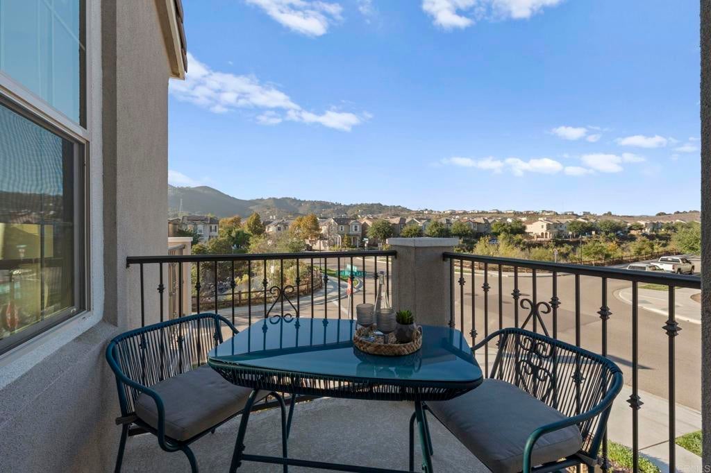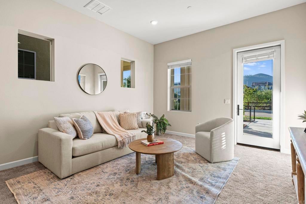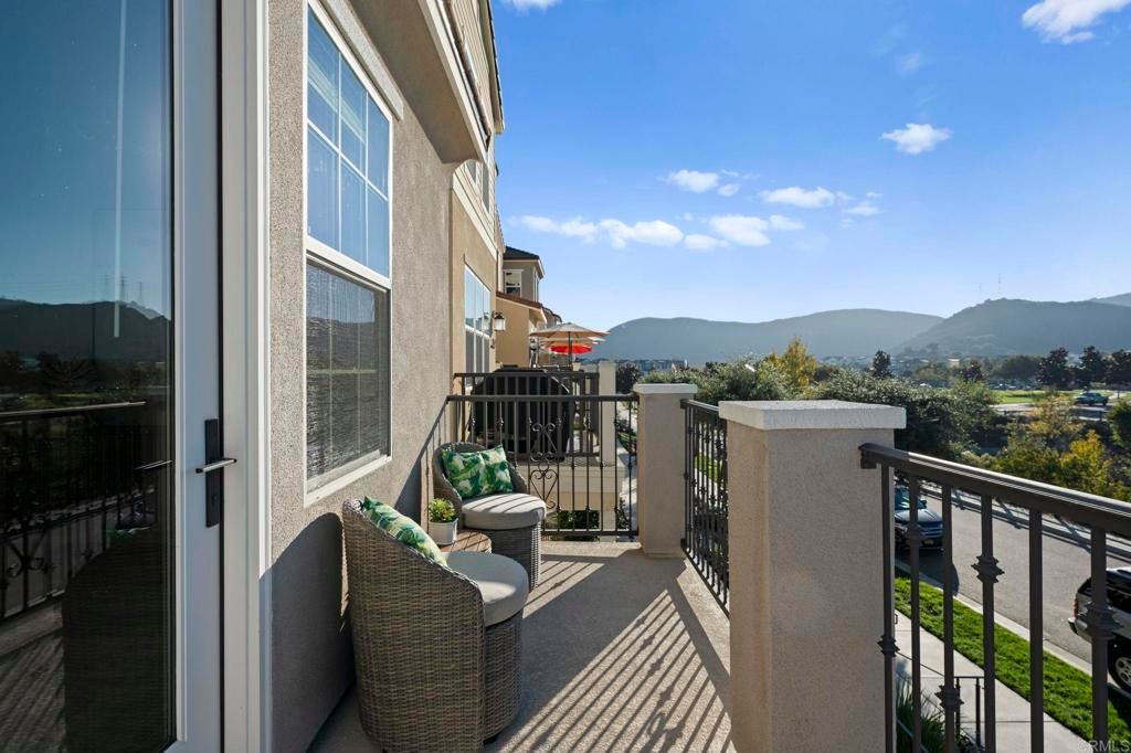 Located in the desirable Martingale neighborhood of Harmony Grove Village, this stunning three-story live/work home offers modern design, flexible workspace, and sweeping Ridgeline mountain views. Built in 2020, this home offers 3 bedrooms, 3.5 bathrooms, live/work space, and 2,204 sq ft of thoughtfully designed living space. The property features an open-concept floor plan, upgraded finishes, solar, tankless water heater, new carpet, and two second-level balconies with ridge line mountain views. The first level includes a builder designed live/work/play flexible area with private entry, private full bathroom, recessed lighting, and multiple windows that create a bright, inviting atmosphere. This space is separated from the main living areas while staying conveniently connected under one roof. The full bathroom is thoughtfully designed with accessibility in mind, featuring tile flooring that flows seamlessly into the step-less shower. The shower is equipped with convenient handrails and a retractable seat for comfort and ease of use. Additionally, supportive grab bars are positioned throughout the room, ensuring safety and confidence. The main living area showcases an open floor plan that seamlessly connects the kitchen, dining, and family spaces. The gourmet kitchen features quartz countertops, a center island with bar seating, stainless steel appliances, dark wood cabinetry, and a full tile backsplash. The adjoining dining and living areas are highlighted by large windows, doors leading to the balcony, and tile flooring throughout. The second level primary suite includes recessed lighting, a walk-in closet, and a spacious ensuite bathroom with dual sinks, a quartz vanity, and a glass-enclosed shower with bench seating. Two additional bedrooms and a full bathroom are on the third level, providing privacy and flexibility for family, guests, or a home office. The laundry room is conveniently located on the second level and includes upper cabinetry for additional storage and a window for natural light. The balcony off the main living area extends the indoor space and offers beautiful mountain and neighborhood views. The low-maintenance front patio provides an additional private outdoor area. Harmony Grove Village is a master planned community with gorgeous mountain ridgeline views, multipurpose trails, gated pool for homeowners, dog and equestrian park, multiple private parks and the huge 4th of July Park (open to the public). The Grove is the perfect place to enjoy the outdoors- it includes the pool, jacuzzi, wading pool, barbeques, shaded tables, play structure and a covered lounge area with outdoor furniture and fireplace.