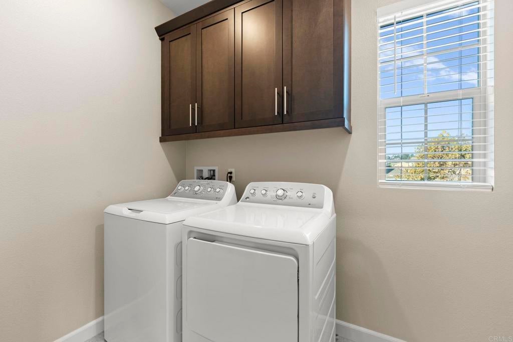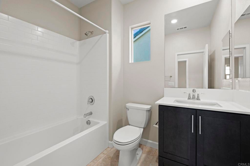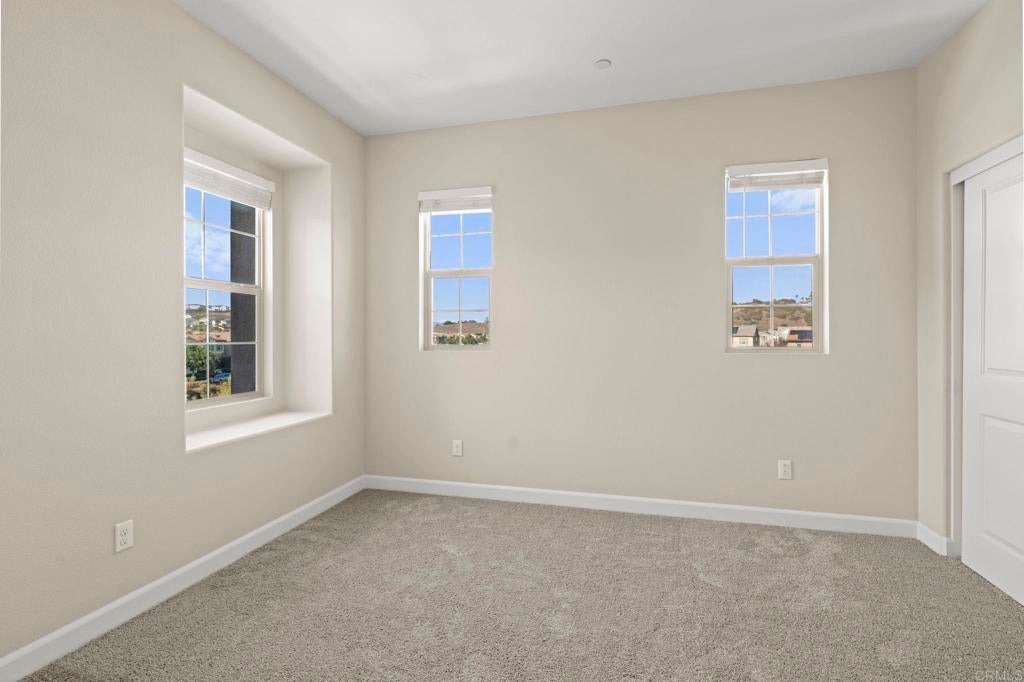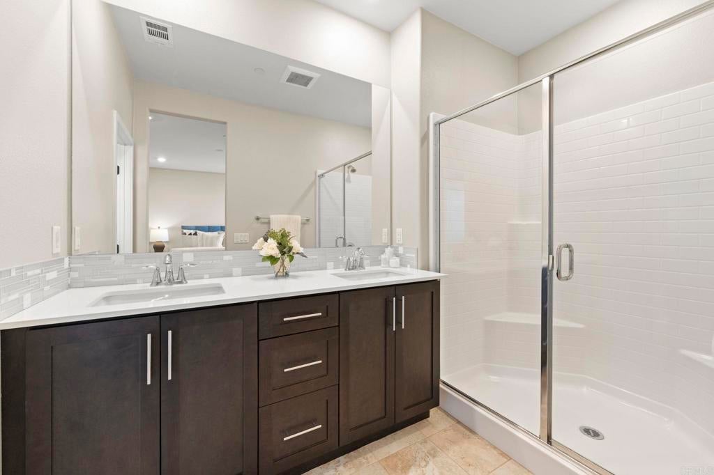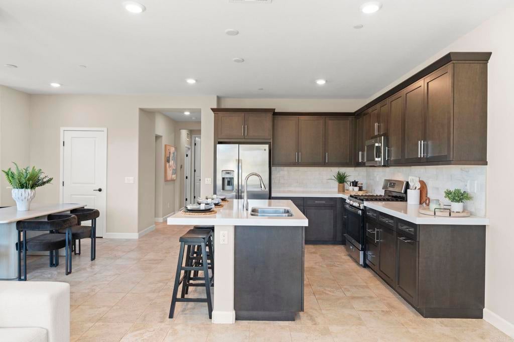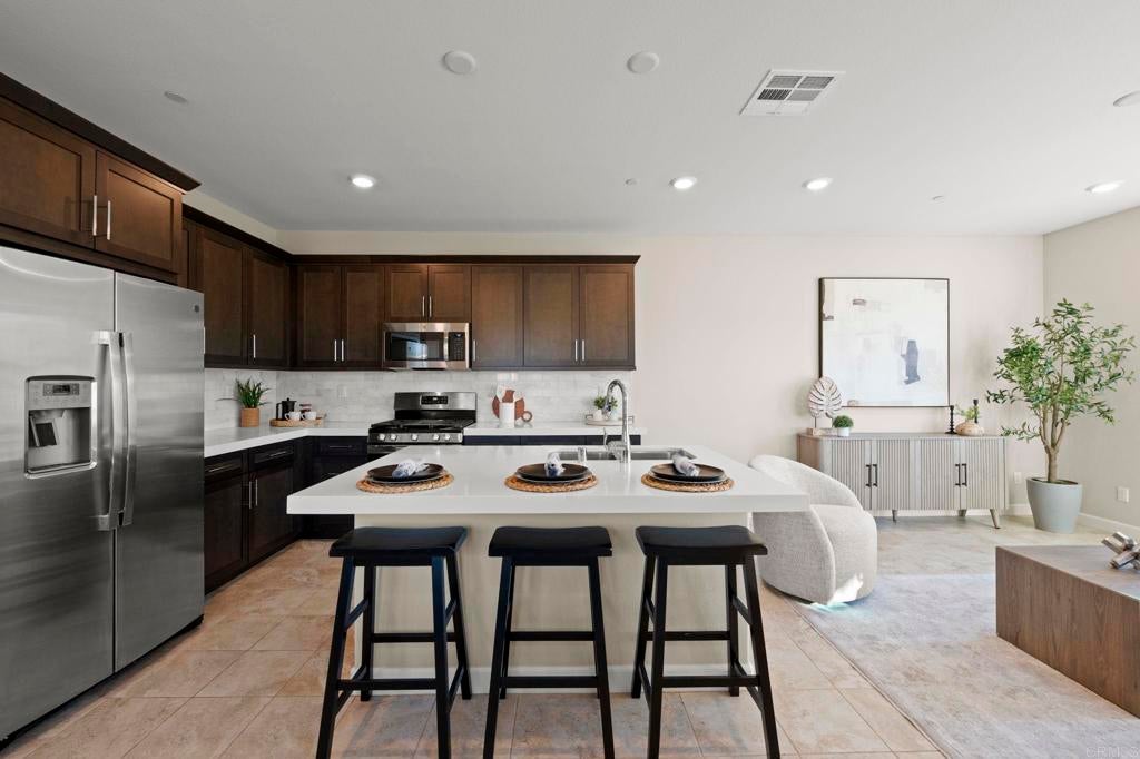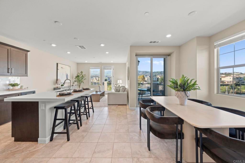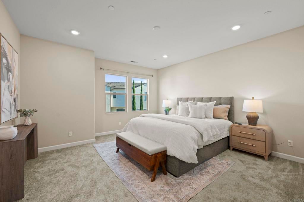 Located in the desirable Martingale neighborhood of Harmony Grove Village, this stunning three-story live/work home offers modern design, flexible workspace, and sweeping Ridgeline mountain views. Built in 2020, this home offers 3 bedrooms, 3.5 bathrooms, live/work space, and 2,204 sq ft of thoughtfully designed living space. The property features an open-concept floor plan, upgraded finishes, solar, tankless water heater, new carpet, and two second-level balconies with ridge line mountain views. The first level includes a builder designed live/work/play flexible area with private entry, private full bathroom, recessed lighting, and multiple windows that create a bright, inviting atmosphere. This space is separated from the main living areas while staying conveniently connected under one roof. The full bathroom is thoughtfully designed with accessibility in mind, featuring tile flooring that flows seamlessly into the step-less shower. The shower is equipped with convenient handrails and a retractable seat for comfort and ease of use. Additionally, supportive grab bars are positioned throughout the room, ensuring safety and confidence. The main living area showcases an open floor plan that seamlessly connects the kitchen, dining, and family spaces. The gourmet kitchen features quartz countertops, a center island with bar seating, stainless steel appliances, dark wood cabinetry, and a full tile backsplash. The adjoining dining and living areas are highlighted by large windows, doors leading to the balcony, and tile flooring throughout. The second level primary suite includes recessed lighting, a walk-in closet, and a spacious ensuite bathroom with dual sinks, a quartz vanity, and a glass-enclosed shower with bench seating. Two additional bedrooms and a full bathroom are on the third level, providing privacy and flexibility for family, guests, or a home office. The laundry room is conveniently located on the second level and includes upper cabinetry for additional storage and a window for natural light. The balcony off the main living area extends the indoor space and offers beautiful mountain and neighborhood views. The low-maintenance front patio provides an additional private outdoor area. Harmony Grove Village is a master planned community with gorgeous mountain ridgeline views, multipurpose trails, gated pool for homeowners, dog and equestrian park, multiple private parks and the huge 4th of July Park (open to the public). The Grove is the perfect place to enjoy the outdoors- it includes the pool, jacuzzi, wading pool, barbeques, shaded tables, play structure and a covered lounge area with outdoor furniture and fireplace.