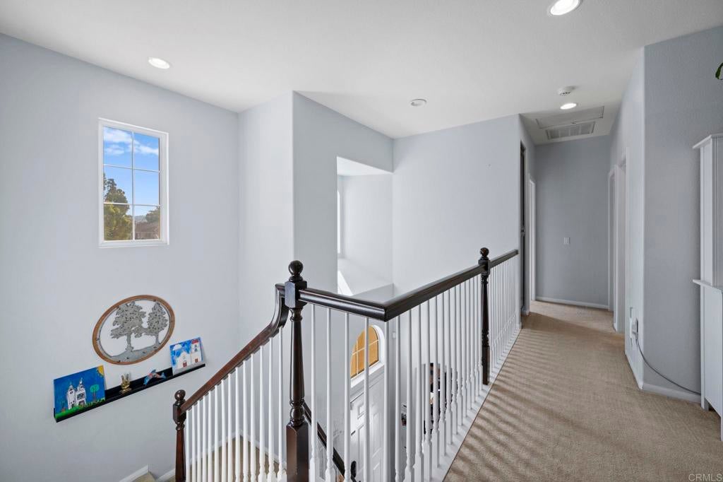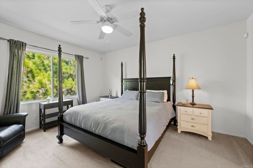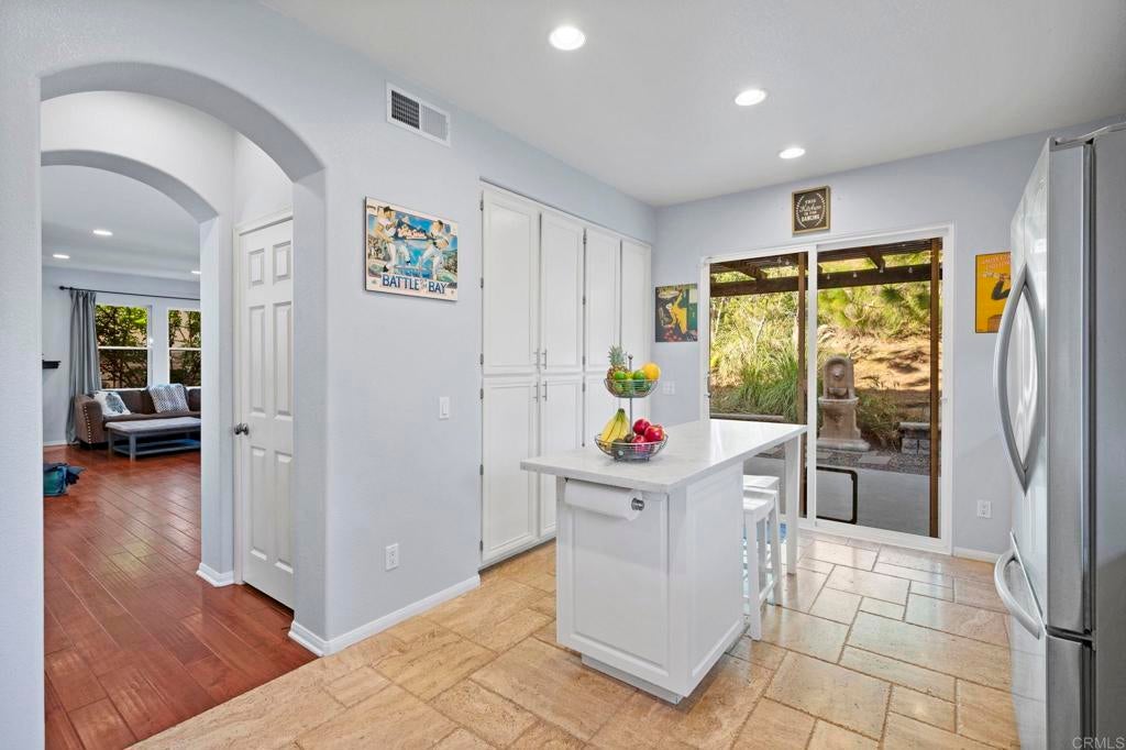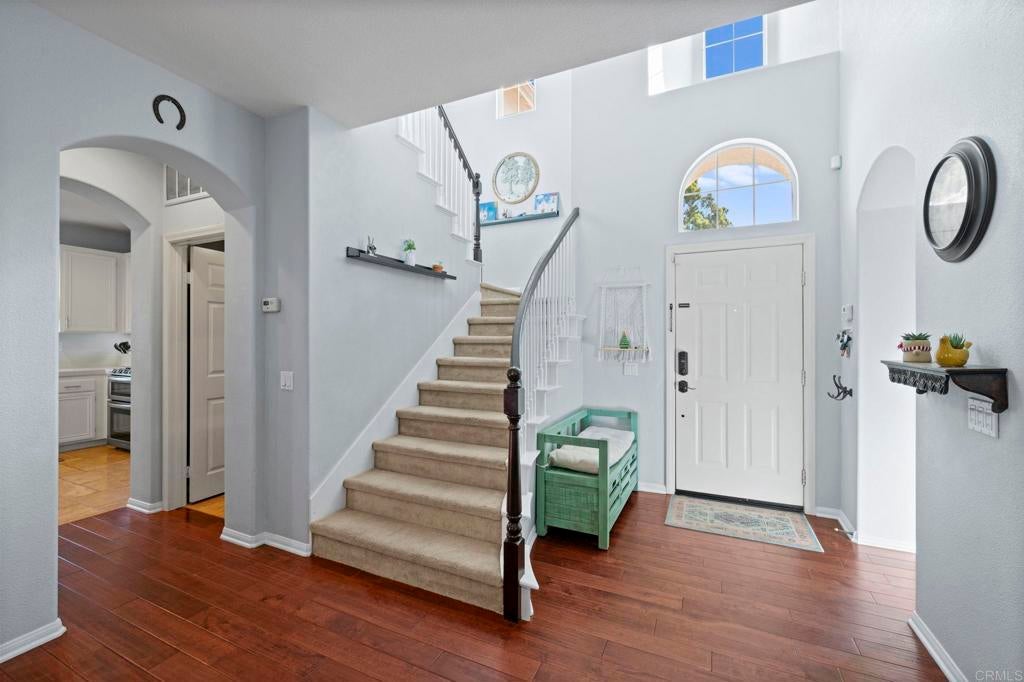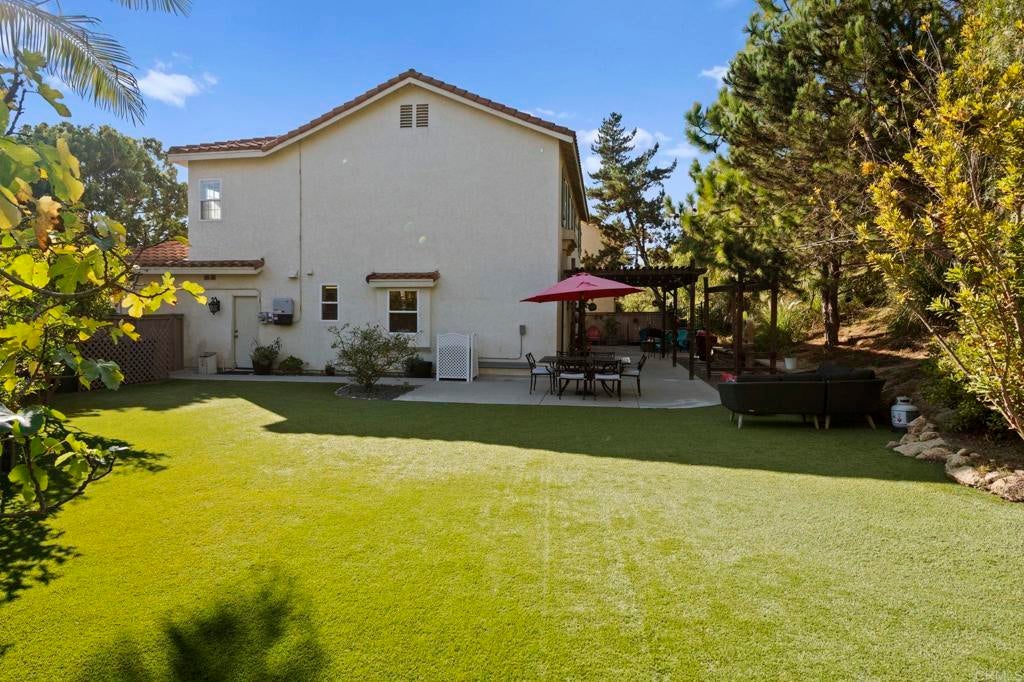 Exceptional Mediterranean Estate in Prestigious Rancho Carrillo | Private Cul-de-Sac Oasis: Discover refined coastal living in this elegant Mediterranean / Spanish Revival estate, gracefully positioned on an oversized, secluded cul-de-sac parcel within the highly coveted Rancho Carrillo enclave. Located in the acclaimed San Marcos Unified School District, this residence embodies sophistication, privacy, and timeless architectural appeal. A dramatic entry welcomes you into sun-washed interiors where expansive ceiling heights, fluid circulation, and generously proportioned rooms create an atmosphere of effortless luxury. The heart of the home is a chef’s kitchen showcasing stainless steel appliances, a substantial entertaining island, and seamless integration to the living and dining salons — ideal for hosting intimate gatherings or grand celebrations. Luxurious maple hardwood flooring flows through the primary living spaces, lending both warmth and distinction. A rare main-level bonus room / executive study offers versatility for a private office, media retreat, guest suite, or well-appointed library. Retreat to the outdoors where a resort-style garden sanctuary awaits — thoughtfully landscaped with mature fruit trees, elegant hardscape, and a romantic pergola that frames alfresco dining, relaxation, and sunset moments. Additional appointments include: • Abundant natural light and elevated privacy • Upscale community ambiance with impeccable curb appeal • Voluminous rooms and harmonious indoor-outdoor living • Premium position near parks, trails, and recreational amenities Ideally situated minutes from renowned dining, boutique shopping, pristine beaches, major highways, and regional airports, this home affords a lifestyle defined by convenience, exclusivity, and sophistication. A rare offering in Rancho Carrillo — where architectural charm meets modern coastal luxury.