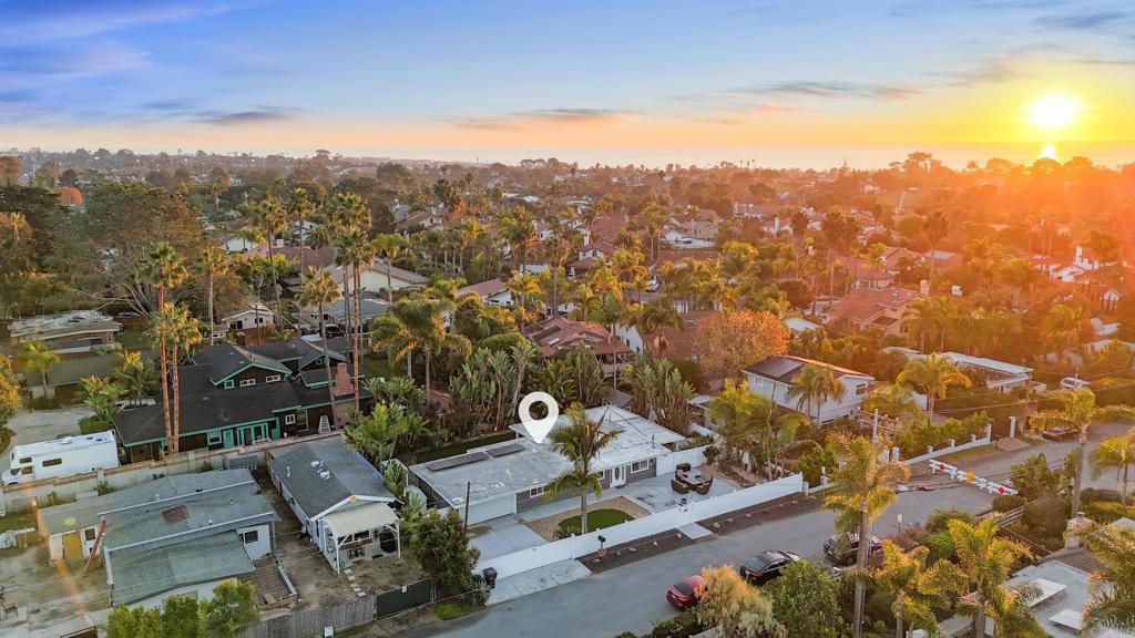 Tucked in the heart of Avocado Acres and just 1 mile to the beach, this thoughtfully transformed beach bungalow lives like a private coastal compound. Behind the automatic gate, you’ll find a fully enclosed, low-maintenance oasis designed for effortless outdoor living. A wraparound Cali Bamboo deck stretching from the backyard to the front, sets the stage for morning coffee with butterflies and hummingbirds. The oversized (just under 9,000sf) lot is perfect for golden-hour gatherings and memorable celebrations. The yard has been thoughtfully designed to be intentionally low-maintenance. It is complete with tropical landscape, tranquil pond, turf you never have to mow, river rock, and landscape lighting create a serene retreat that feels worlds away, yet sits just minutes from the beach, restaurants, and all that Encinitas is known for. Inside, the home has been thoughtfully appointed and includes custom details throughout. Arched details and statement wallpaper add character and purpose. Open the french doors off of both the living area and kitchen for the ideal indoor outdoor space. The kitchen features upgraded stainless steel appliances with views of your tropical oasis right outside the window. The primary features a custom walk-in closet with convenient laundry access and green tropical views that make each morning feel like a getaway. The fully finished and insulated garage, offers bonus space that could be for storage, hobbies, or even a creative studio. A dedicated surfboard storage room and built-in outdoor kitchen further enhance the home’s beach-centric lifestyle. With fully PAID solar installed in 2022, drip irrigation, a private cul-de-sac feel thanks to the permanent street barricade, and secure parking inside the gate, this property offers peace of mind, privacy, and smart sustainability. Want to take advantage of the oversized lot but maybe you need a little more space. There is plenty of room for potential to add an ADU, build up and capture the ocean views or expand as the possibilities are endless. You can always change the footprint but you can never change the location. Whether hosting summer taco parties or simply soaking in the quiet with the doors wide open. This is a rare opportunity to blend charm, intention, and coastal lifestyle and have your very own beach retreat.
