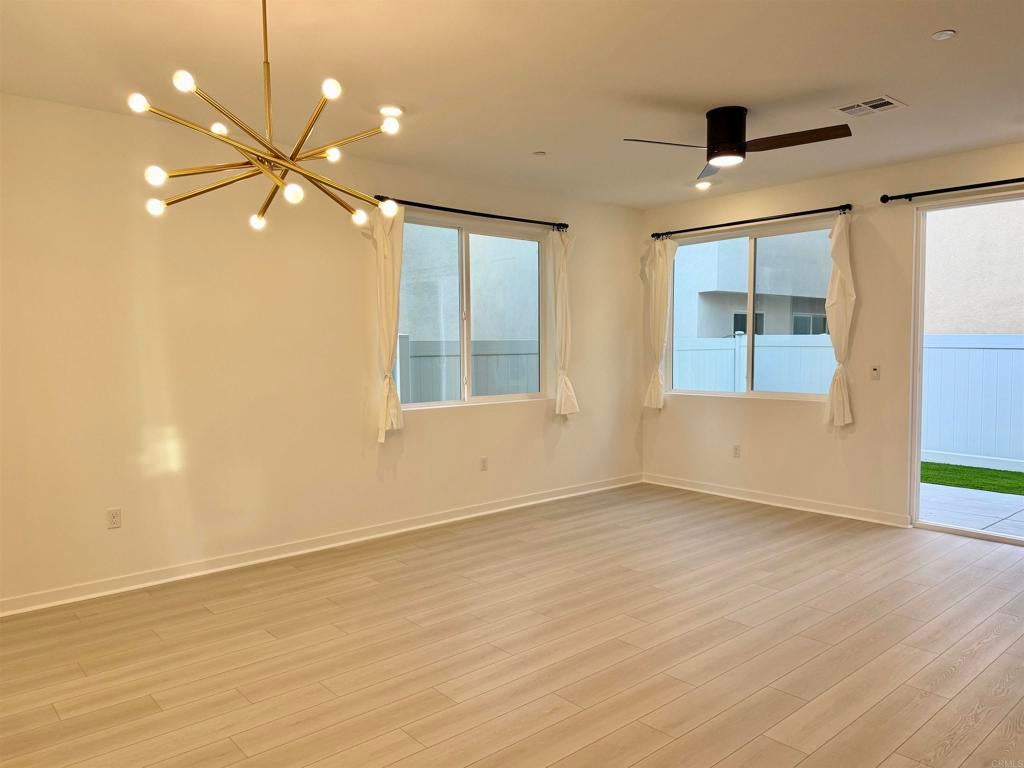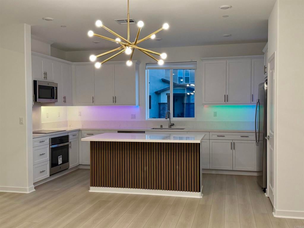Beautiful Upgraded Corner-Lot Home in Gated Community Welcome to this bright and airy, brand-new upgraded home located in a secure gated community. Situated on a desirable corner lot, the property offers stunning sunset views from both the kitchen and the master bedroom. The modern interior features white cabinetry, quartz countertops, a spacious kitchen island, upgraded laminate flooring, stylish wall paneling, under-cabinet lighting, and elegant fixtures including ceiling fans in all rooms and a statement chandelier. Hardwood and carpet flooring provide comfort and durability throughout. The home comes fully equipped with all appliances, including refrigerator, washer and dryer, dishwasher, microwave, and stove. Enjoy year-round comfort with central cooling and forced-air heating. Energy efficiency is a standout feature with Tesla solar panels (2.87 kW) and battery backup, along with an EV charging port for added convenience. Additional highlights include attached parking, backyard turf for low-maintenance outdoor living, and access to a new community pool currently under construction. Pet-friendly for small cats up to 20 lbs. This move-in-ready home combines modern living, energy efficiency, and resort-style amenities perfect for comfortable and sustainable living.