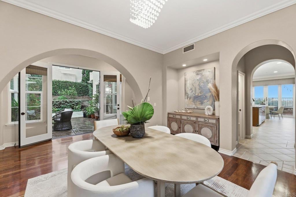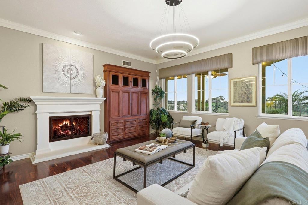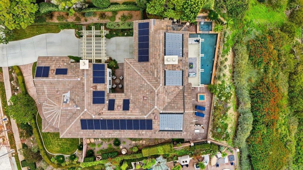 Bathed in golden coastal light and cooled by ocean breezes, this west facing Quail Ridge home offers a daily connection to beauty, tranquility, and elegance. From its elevated position overlooking the 5th and 6th holes of Encinitas Ranch Golf Course to the endless blue of the shimmering Pacific, life here feels intentional and unhurried. A marble entry welcomes you at the front door, while a peaceful courtyard offers a secondary entrance into light filled interiors where quality finishes, custom craftsmanship, rich hardwood floors, and a dramatic formal living room with soaring ceilings create a sense of timeless sophistication. The heart of the home unfolds toward the view, where the family room and chef’s kitchen are designed for both lively gatherings and quiet mornings, anchored by an extended island, six burner gas range, double ovens, butler’s pantry, and casual dining with ocean and fairway vistas. Indoor and outdoor living blends seamlessly as fires glow, wine is poured from the dedicated wine room, and the backyard becomes a private retreat with a water feature pool and spa, built-in grill, and expansive spaces to linger as the sun melts into the horizon. Upstairs, the primary retreat feels like a sanctuary, where mornings begin on a balcony with picturesque views and evenings unwind in a spa inspired bath with dual walk-in closets and a serene sitting area with a cozy fireplace. Three additional bedrooms upstairs and a flexible den with potential for a fifth bedroom downstairs offer space to host, create, and recharge, while thoughtful upgrades including a new roof (2023), owned solar, EV charger, and a workout room quietly elevate everyday living. Dual garages for three vehicles and an extended driveway provide ample parking. Beyond the gates, Encinitas unfolds with scenic preserve trails, world class golf, golden beaches, Botanic Gardens, Fox Point Farms, and a vibrant dining and shopping scene, creating an exceptional coastal lifestyle.