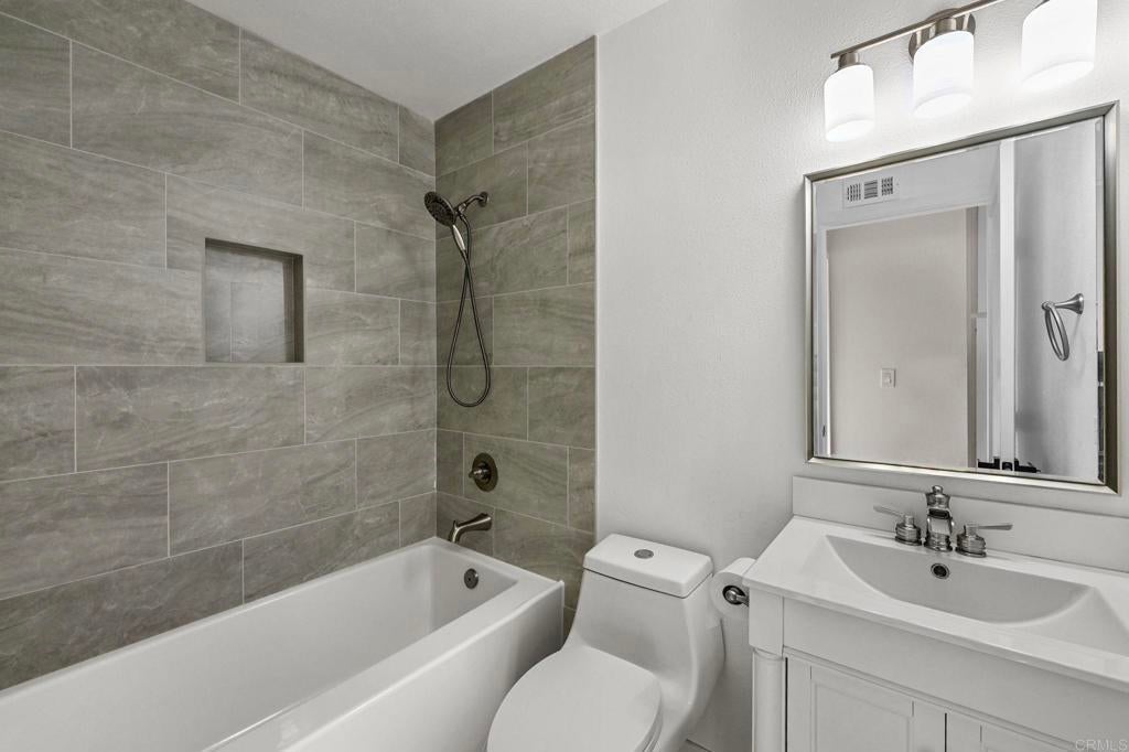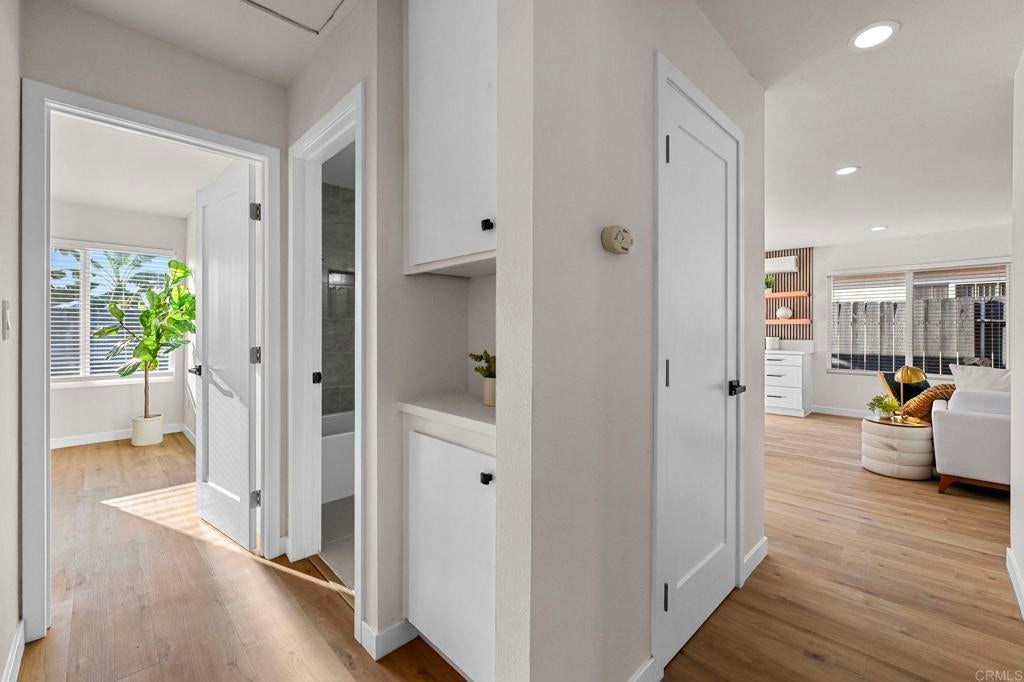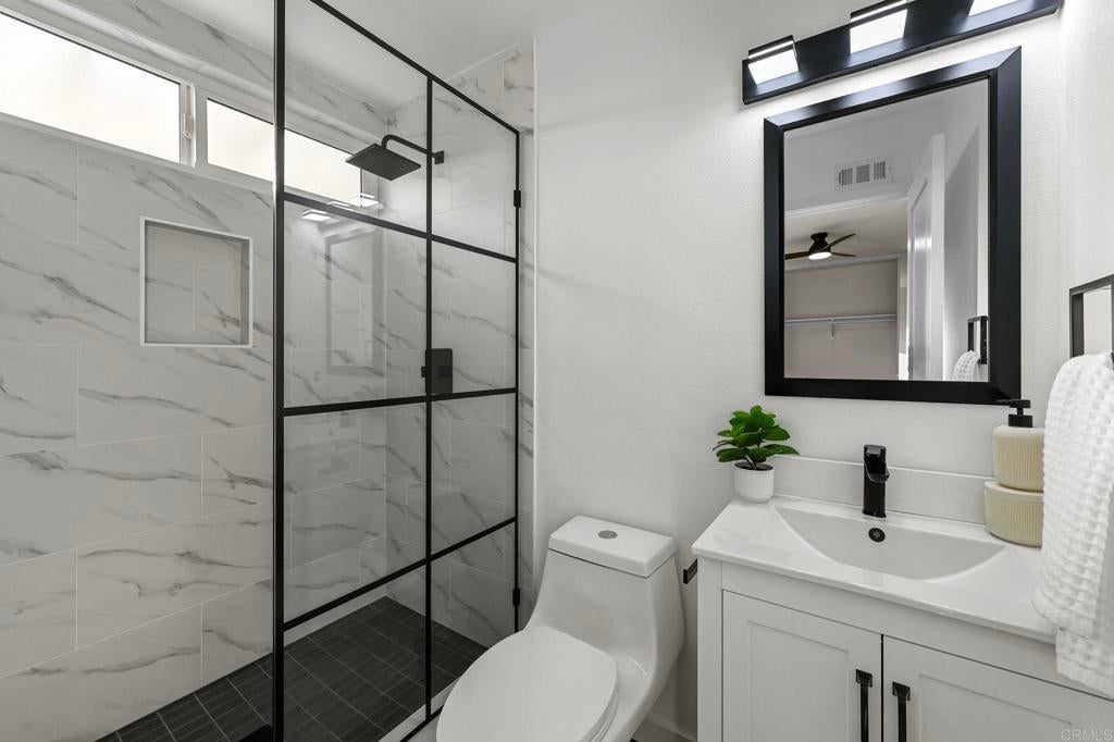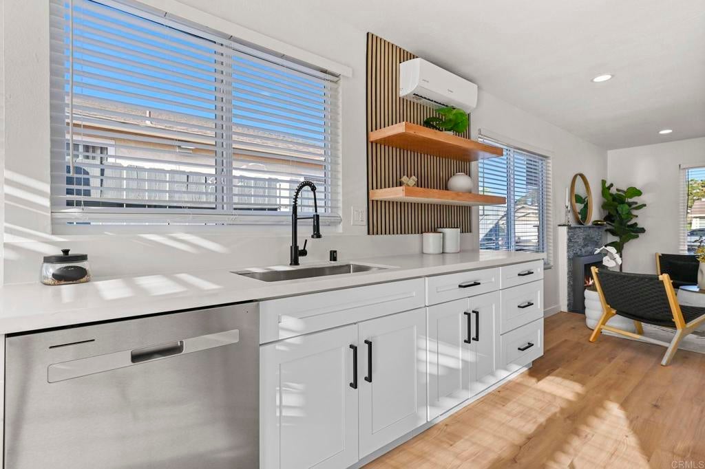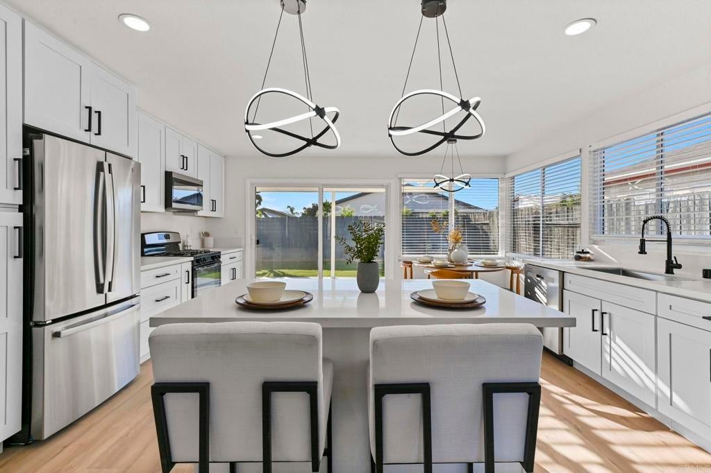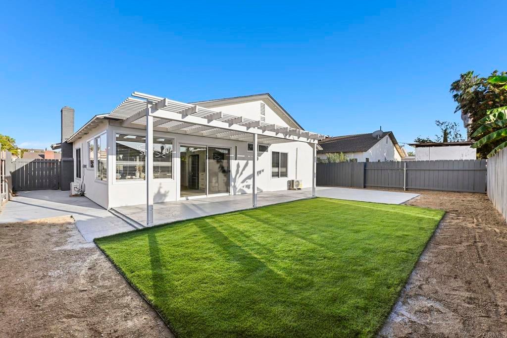 Fully renovated home in north Mira Mesa featuring an open-concept living space filled with natural light from abundant windows. The spacious kitchen offers modern white cabinetry, an island, ample counter space, and brand-new stainless steel appliances. A huge slider off the kitchen opens to a private backyard with a large patio, new trellis, and refreshed landscaping, perfect for entertaining or relaxing outdoors. Inside, enjoy modern finishes throughout including new LVP flooring and baseboards, new doors, light fixtures, ceiling fans, and mirrored closets in all bedrooms. The living room features a stylish modern fireplace with new tile surround, creating a warm and inviting focal point. Additional upgrades include new kitchen cabinets, new roof, new garage window, new exterior lighting, and a freshly painted interior and exterior. The fully remodeled primary bathrooms include professional waterproofing and elegant finishes. Comfort is ensured year-round with new AC mini splits in the living room and primary bedroom, with enough capacity to cool the entire home. This bright, modern home is truly move-in ready.
