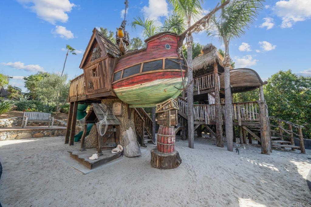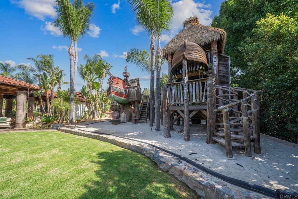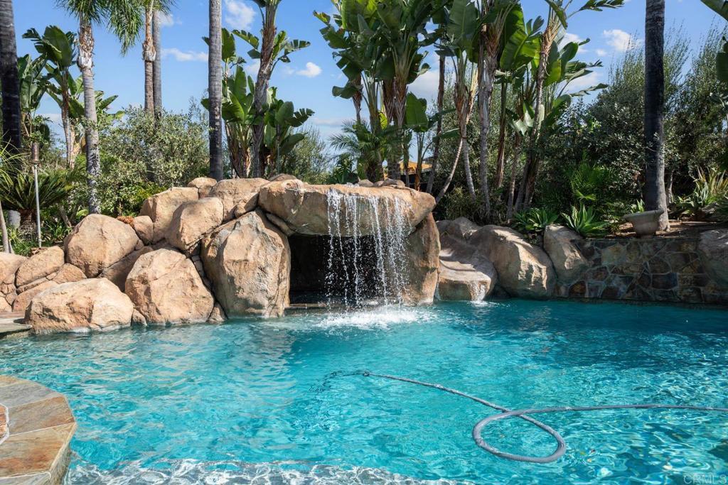 Gorgeous Custom-Built Spanish-Style Villa sitting on a flat usable 1 acre of lush green tropical landscaped grounds with over 2,000 sq ft of the ultimate Outdoor living setup you can imagine! Outdoor living at its finest with Tropical pool oasis area with courtyard sunbathing deck, multiple waterfalls, hidden jacuzzi inside the grotto with waterfalls flowing over you and a Rock Water Slide! The outdoor area has multiple seating areas setup to entertain with a fully equipped Kitchen complete w multiple refrigerators, Ice machine, BBQ grill, Gas stove top, sink, Barstool eating area and center island table! Additional area equipped with an authentic wood burning Pizza oven, plenty of counter-top serving space with a fireplace seating area to enjoy your pizza! The outdoor Living room area is furnished with couches, multiple outdoor heaters and gorgeous fireplace that is a perfect spot to gather w family & friends! The playground area is guaranteed too keep them happy w two pirate ship style structures surrounded by a sandbox that is connected to the huge grass play area! Three car attached garage plus a HUGE Double Motor home garage equipped with a full workshop and office upstairs! Plenty of room for all your toys! Grand front door entrance greets you with a Rich Spanish style architecture featuring Saltillo tile flooring, vaulted ceilings & architectural details that adorn every corner of this home. Gourmet kitchen offers top-of-the-line appliances, Rich cabinetry, custom Backsplash & center island w barstool seating area! The master suite is a true sanctuary, featuring a private en-suite couch seating area w fireplace, Luxurious spa like bathroom w separate bathtub plus walk-in shower and two large walk-in closets. This gorgeous home offers too many upgrades to list so come live the good life in Granite Hills today!