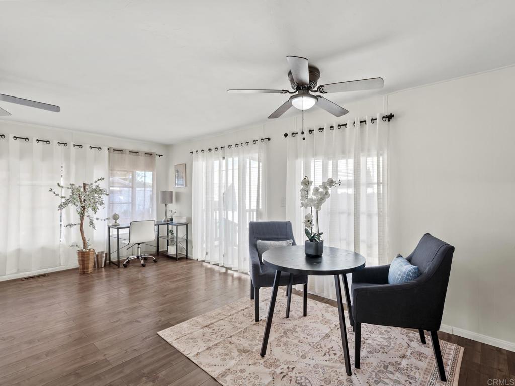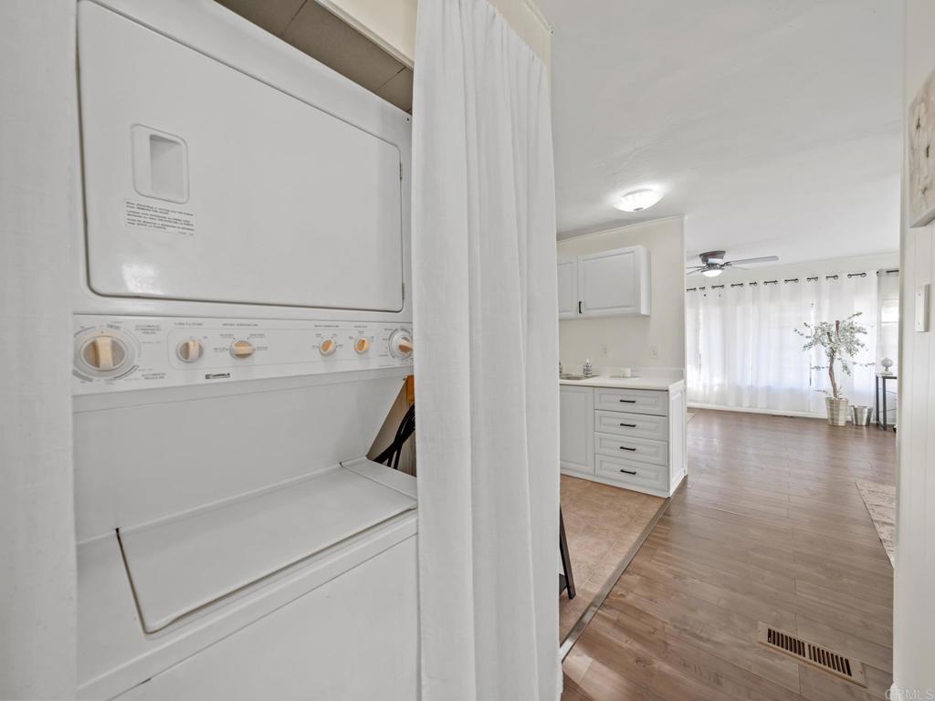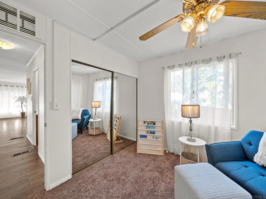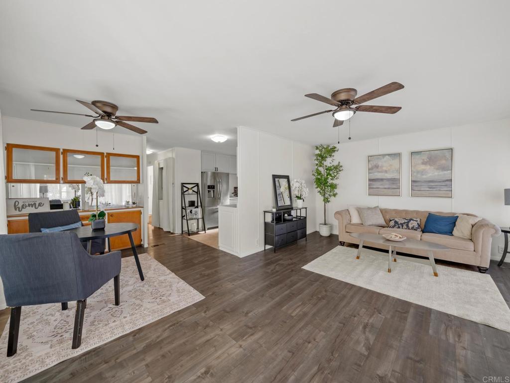 Spacious and MOVE-IN READY for the 55+ and 35+ community! This modernized 2-bedroom mobile home in the heart of Santee offers some of the most affordable housing in San Diego. The interior features an open floor plan with laminate flooring, new carpets, and updated cabinetry. The kitchen includes a stainless steel refrigerator, while the rest of the home features an updated bathroom, updated lighting with ceiling fans, a laundry closet with a stackable washer/dryer, and a newer water heater. The location offers high walkability scores, allowing you to walk to Sprouts, shopping, dining, and parks without needing a car. However, a dedicated parking spot is included directly in front of the unit. Outside, the property features a private patio deck and space for storage sheds. The monthly rental space (land lease) is $686.17 and covers water and trash. Additional fees are low, consisting of a $44 flat sewer fee and a $3.00 rent control fee. This home provides privacy, easy access to essentials, and quick access to freeways to reach all of San Diego. This is a highly competitive price point for long-term affordable housing, and pets are allowed!