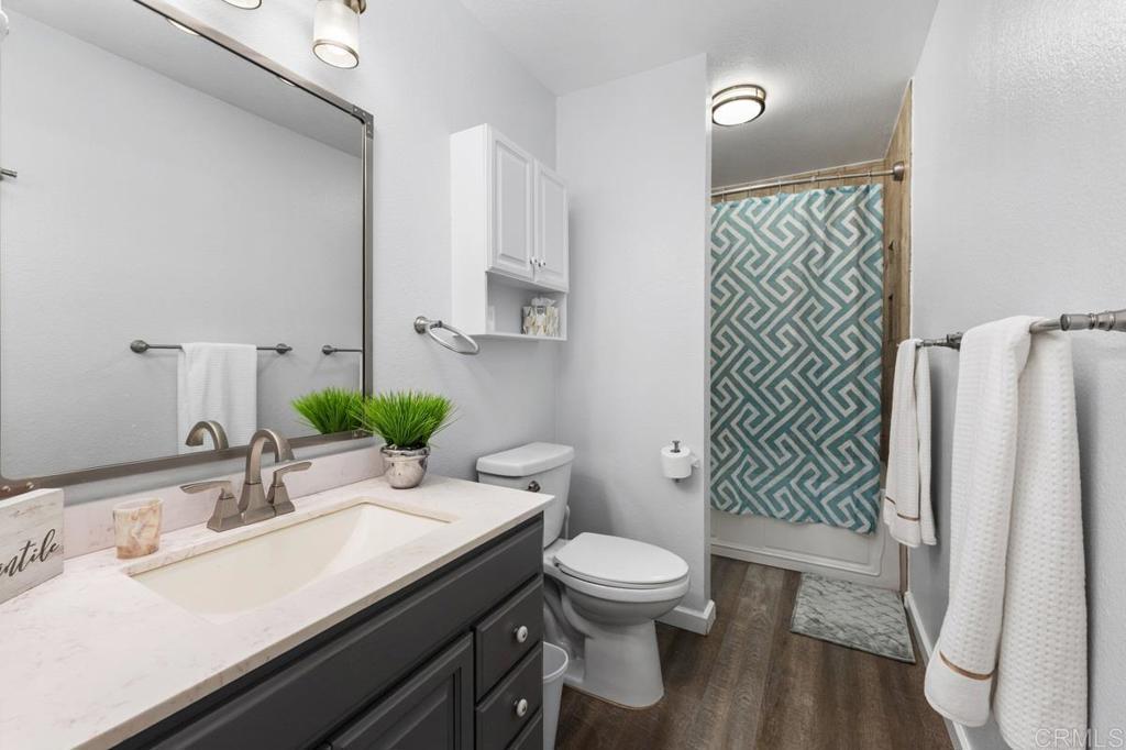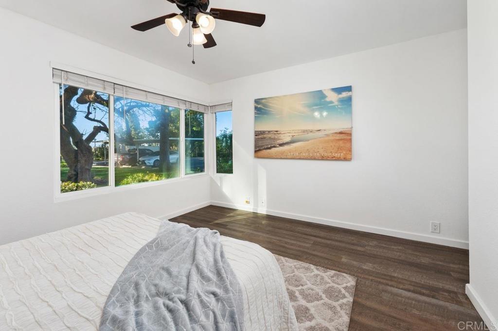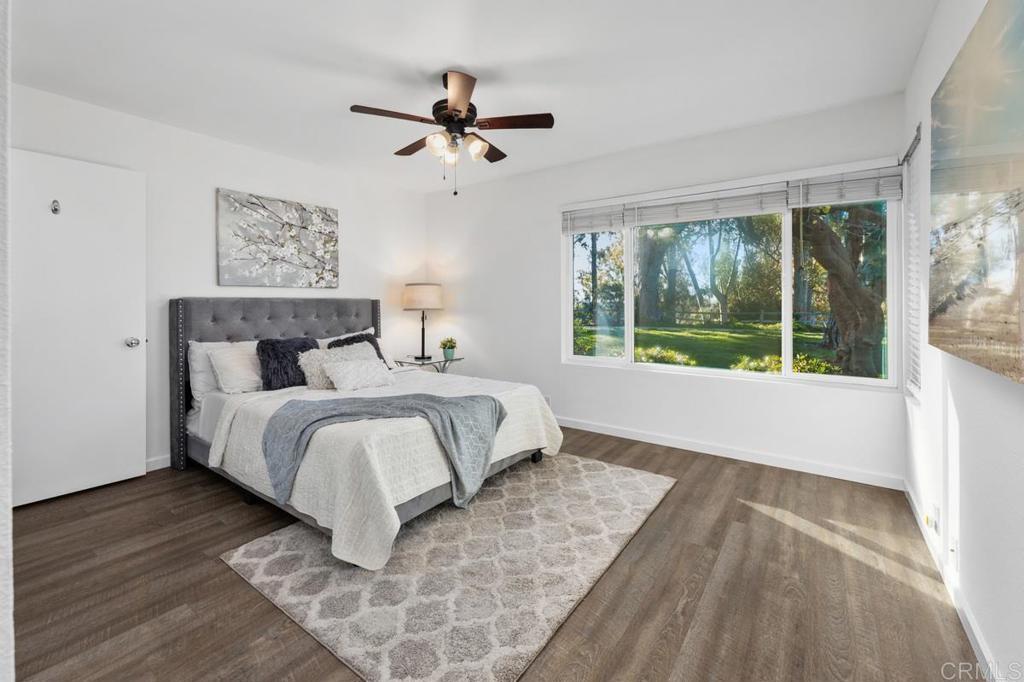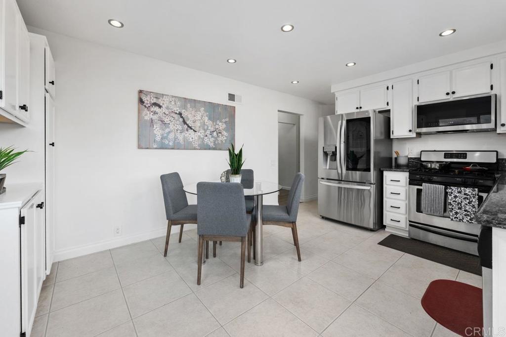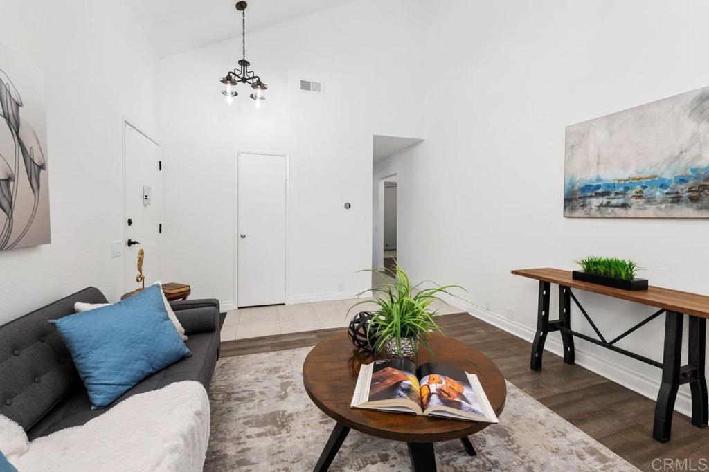 Welcome home to this highly sought-after, single-level condominium located in Villa Martinique. Situated in one the most desirable areas of the complex; overlooking a lush greenbelt, and canyon-side trails. This end unit property feels like a standalone home- offering open views to the greenbelt, canyon, and backyard from the Primary bedroom, Living Room and Kitchen. Highlights include; Energy-efficient dual-pane windows throughout, fresh paint, an updated kitchen featuring white cabinetry with modern matte black hardware, stainless steel appliances, and sliding glass door for seamless indoor/outdoor entertaining. The living room and bedrooms feature vinyl flooring, and ceiling fans. The Primary bedroom features a spacious walk-in closet, and picturesque views of the canyon. In-unit laundry area includes front-loading stackable washer/dryer, as well as built-in storage cabinetry and shelving. Villa Martinique is an FHA/VA approved complex. HOA includes water, trash, use of tennis courts, swimming pool, and grounds maintenance. The unit includes two reserved parking spaces (1) covered and (1) uncovered, and are located just a short walk to your front door. Walking distance to Tierrasanta Elementary -offering a highly coveted Spanish immersion program, DePortola Middle School & Canyon Hills High. This home is a must see!