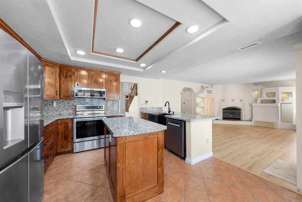 Located in the highly desirable Vista Dorada neighborhood, this beautifully maintained home offers an open floorplan designed for both comfort and entertaining. The updated kitchen features granite countertops, stainless steel appliances, and a center island, seamlessly opening to the family room with a cozy fireplace. A sought-after first-floor primary bedroom includes its own fireplace, creating a private and relaxing retreat. Soaring high ceilings enhance the living room, while laminate flooring and plantation shutters add style and warmth throughout. The home also offers spacious secondary bedrooms, a versatile bonus room, and a newer A/C system for year-round comfort. Enjoy the benefits of paid solar and a generous backyard complete with a built-in BBQ—perfect for outdoor gatherings. A large shed currently used as an office or workroom adds valuable flexible space. Conveniently located close to shopping, schools, and freeway access, this home truly has it all. Lovingly maintained by the original owner, this home reflects true pride of ownership. Call now to schedule your private showing before this Vista Dorada gem is gone.