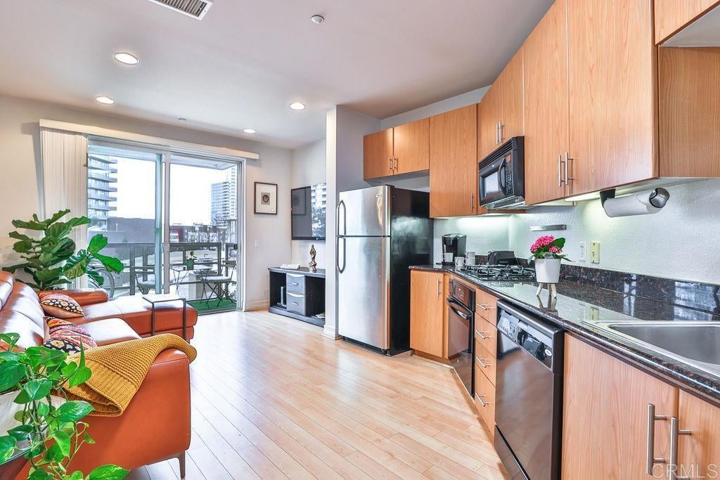 FURNISHED RENTAL-LONG TERM TENANCY AVAILABLE MARCH 2026. This condo is centrally located on the corner of Island and Park Blvd, right next to the trolley station. Making it easy to get anywhere you want to go in Downtown. Condo is nicely decorated, with carpet only in the bedroom. A little balcony off living area, with open views of the surrounding city. Comes with one parking space in a locked garage. Does have AC and Heat. Washer and Dryer inside the unit. Building is secure and does have an elevator. Fully furnished with everything you need. Fully stocked kitchen and new towels and linens. Building features a jacuzzi in the common area.