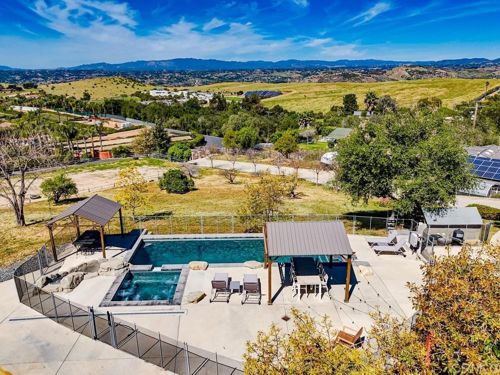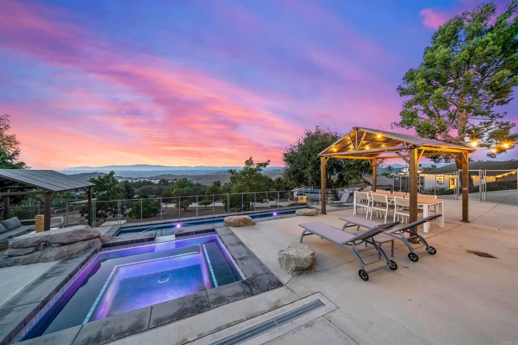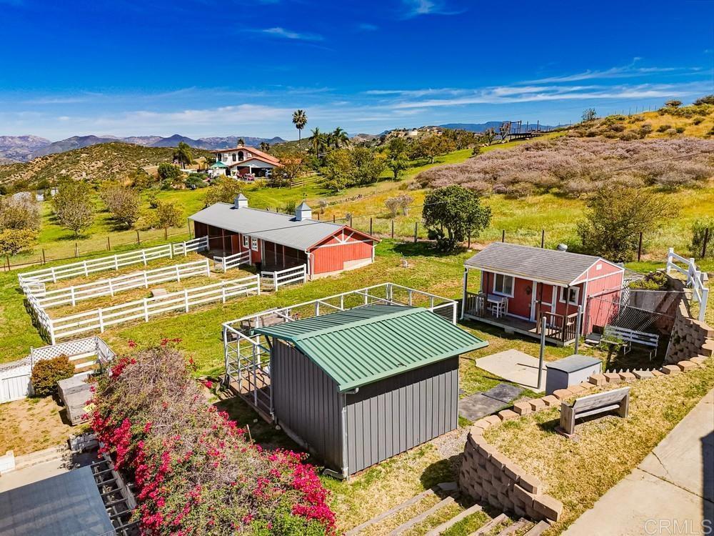Seller will entertain offers between $2,145,000 - $2,250,000. Incredible versatility and stunning panoramic views await at this equestrian estate, which features THREE RESIDENCES on a highly developed 2.35 acre lot. The 3,465 sq ft main house offers soaring ceilings, beautiful finishes, a whole house fan, central vac, laundry chute, sub-level with more storage, 4 bedrooms AND an attached 1 bed/1bath apartment with a separate entrance. The 1,100 sq ft detached guest house offers 3 beds (1 is an optional bedroom/den), 2 full baths and a private backyard. There is new HVAC equipment for all 3 residences and owned solar energy systems on both the main house and detached guest house. Another detached building houses a 3-car garage and bonus room (currently used as an office) with a half bath. Enjoy a NEW high-end pool with a safety enclosure, large patio, waterslide, grotto, LED lights, and AOP Ozone system for excellent water quality. Rinse off after a swim in the enclosed outdoor bathroom with a shower. A charming red barn offers 2 oversized stalls with runs, a hay room and a tack room. An outdoor riding arena completes this amazing horse property. A large chicken coop with run is set up for collecting fresh eggs each morning. Multiple fruit and avocado trees and large planter boxes complete the home garden. This fully-fenced property with a gated driveway is located on a well-maintained private road in Bonsall, only 30 minutes from the beach in Oceanside. Experience coastal breezes and even a view of the ocean on a clear day from this hilltop home!