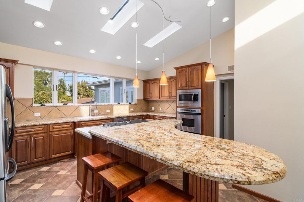 Located in the highly sought-after Sunset Cliffs / Point Loma coastal community, this spacious 3- bedroom, 2-bath residence offers approximately 2,665 sq ft of living space on a 7,200 sq ft lot with peak ocean views. The home blends classic coastal character with thoughtful upgrades, featuring vaulted ceilings, skylights, and an open, light-filled layout designed for both comfortable living and effortless entertaining. The main level features expansive living areas, including a welcoming living room, formal dining area, and an inviting kitchen with an Oversized center island with bar seating, perfect for morning coffee, breakfast, and entertaining. Built-in wet bar with granite counters, custom cabinetry, glass display doors, and beverage refrigerator—ideal for entertaining. The remodeled kitchen showcases granite countertops, abundant cabinetry, and premium Bosch, GE, and Dacor stainless steel appliances, Flowing seamlessly to the nearby outdoor deck and backyard, offering a peaceful outdoor setting for relaxing, dining, and entertaining A separate upstairs family room retreat adds valuable flexibility and privacy, complete with vaulted ceilings and Direct access to a private balcony overlooking beautiful ocean views and the surrounding coastal neighborhood.. This elevated space is ideal for a media lounge, game room, guest retreat, or home office, offering a quiet escape from the main living areas. The primary suite is privately situated within the home and offers a spacious retreat with an adjoining bath, while two additional bedrooms provide comfortable accommodations for family, guests, or workspace needs. The living room features high ceilings and an expansive open layout that creates a bright and welcoming atmosphere. Large windows bring in abundant natural light, while elegant tile flooring extends throughout the main living areas. Recessed lighting adds a clean, modern touch, and French doors provide architectural character while connecting seamlessly to adjacent living spaces, making the room ideal for both everyday living and entertaining. Outdoor living spaces enhance the home’s coastal lifestyle appeal, featuring a large entertaining deck overlooking the landscaped backyard. The yard offers mature landscaping, garden areas, and fruit trees, creating a peaceful outdoor setting, along with convenient alley access that provides flexibility for additional parking, storage, or future possibilities. Additional highlights include upgraded plumbing and electrical systems and a whole-home point-of-entry water softener system. Additional features include a detached two-car garage, brick paver walkways and outdoor sitting areas, and beautifully maintained grounds. Ideally located just minutes from Sunset Cliffs Natural Park, the Pacific Ocean, coastal trails, beaches, restaurants, and shops, this property offers a rare opportunity to enjoy the relaxed elegance of Point Loma’s premier coastal lifestyle