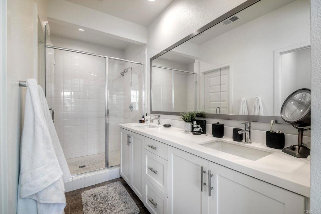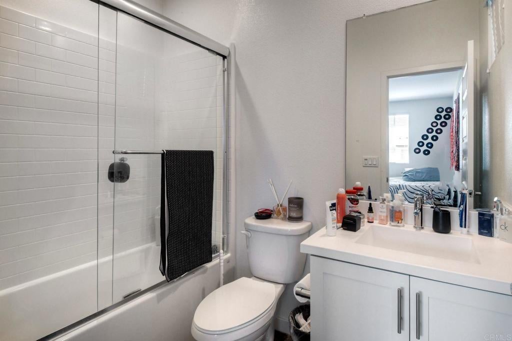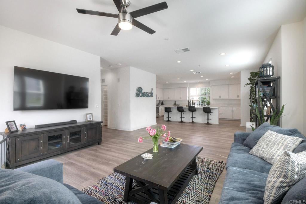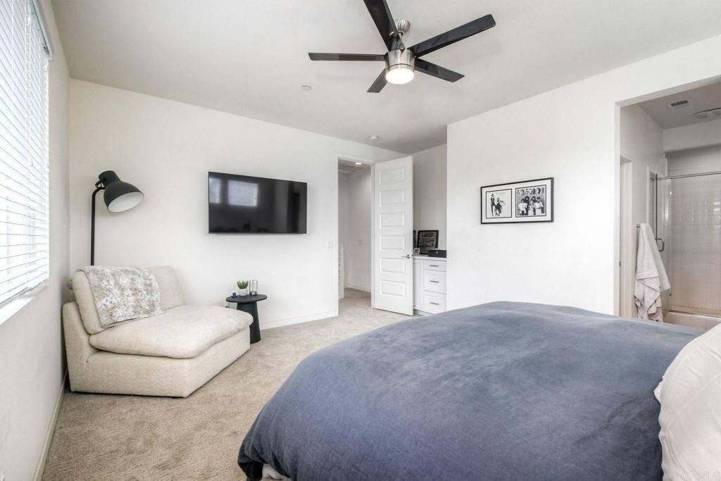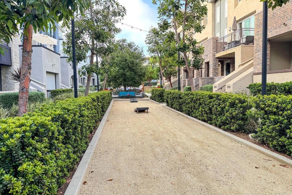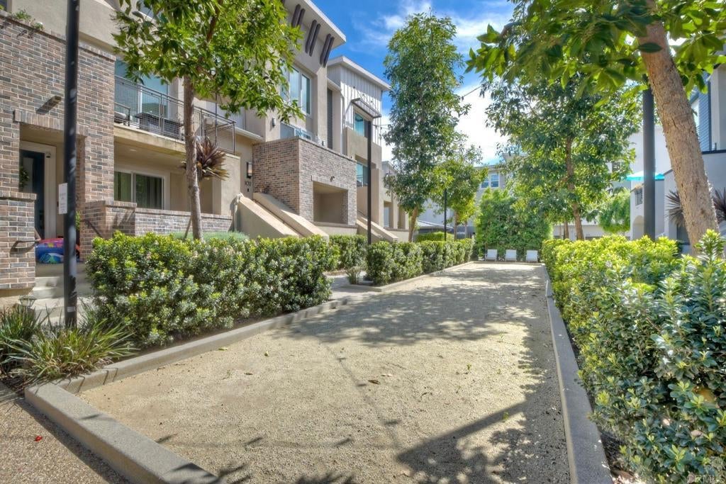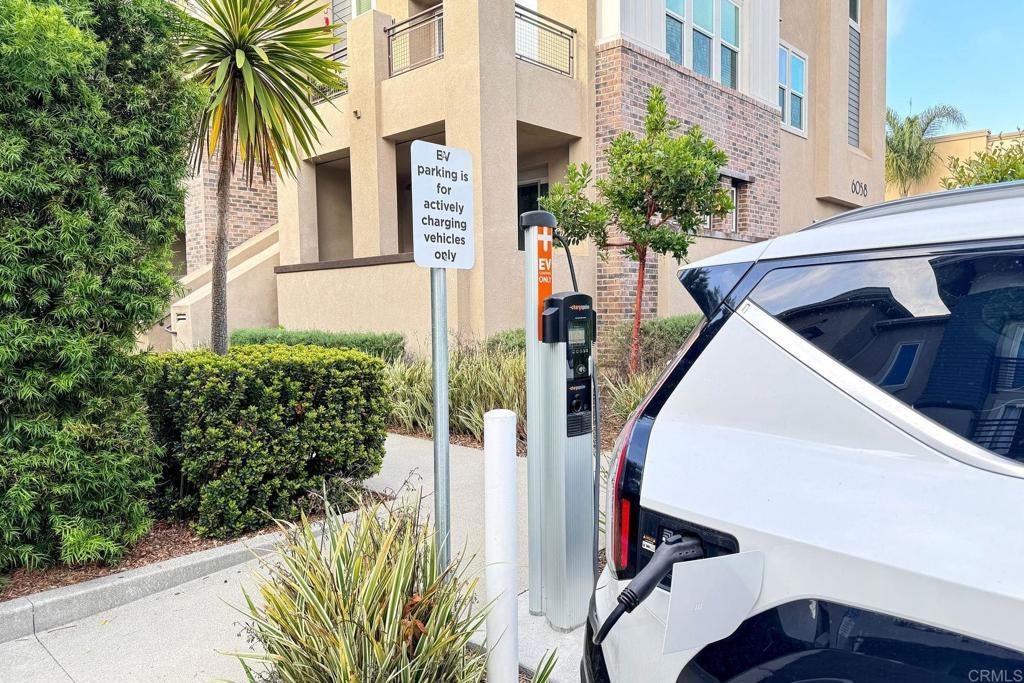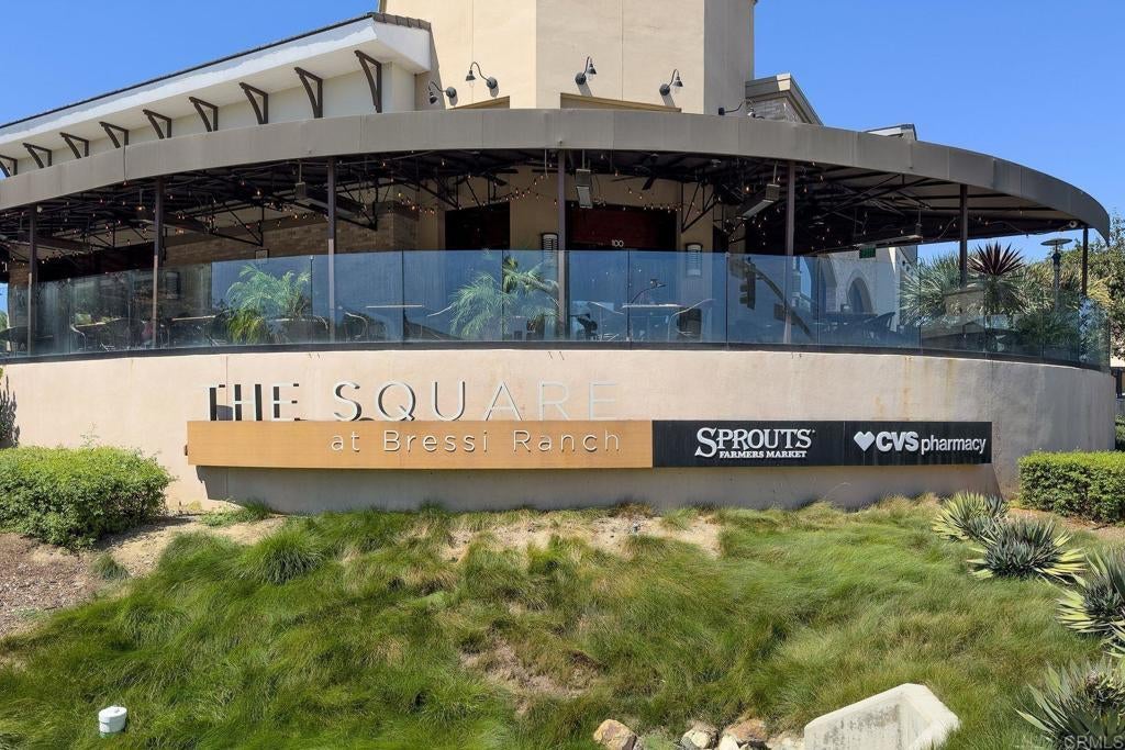 Rare corner residence in Kensington at the Square with no neighbor on one side, owned solar, EV charging, and steps to Bressi Ranch Village. Positioned on the outer edge of the building, this desirable home enjoys added privacy, extra windows, and refreshing coastal breezes that create a bright, open feel throughout. This upgraded tri-level townhome features new carpet, updated kitchen and bathrooms, and a flexible layout including a first-floor bedroom with private patio, ideal for guests, an office, or workout space. The open-concept second level showcases the updated kitchen flowing into the living room, with a private balcony perched above the bocce ball court and neighborhood, creating a perfect place to relax or entertain. Energy-efficient living includes owned solar, smart home features, an EV charger in the garage with additional storage, plus additional community EV charging stations. Located adjacent to Bressi Ranch Village, simply step outside and walk to restaurants, coffee, fitness studios, parks, and shopping, all while enjoying the peaceful setting of this beautifully maintained Carlsbad neighborhood.